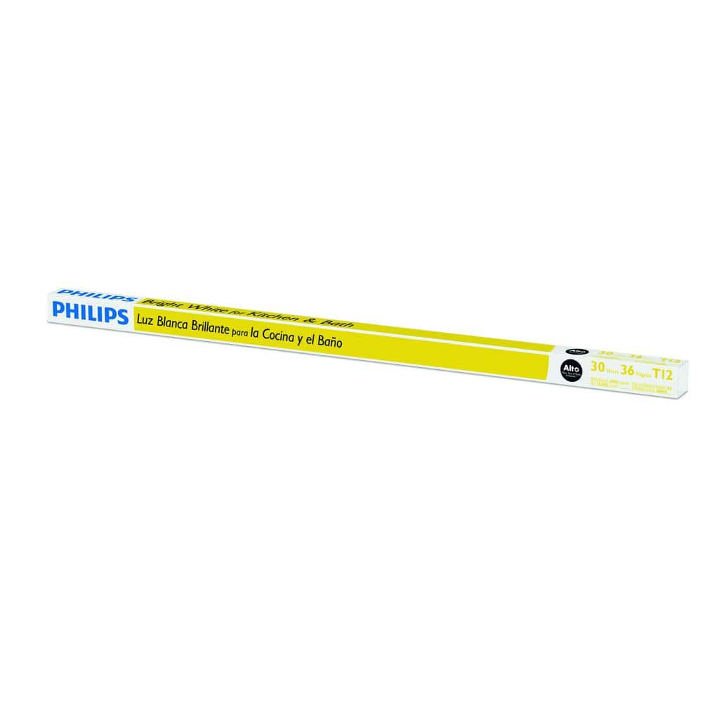 This Philips 3-foot T12 fluorescent tube delivers bright white 3000K light for clean, accurate illumination in kitchens, bathrooms, and workspaces. Rated for up to 18,000 hours, it uses 30 watts and fits fixtures with a medium bi-pin (G13) base.
