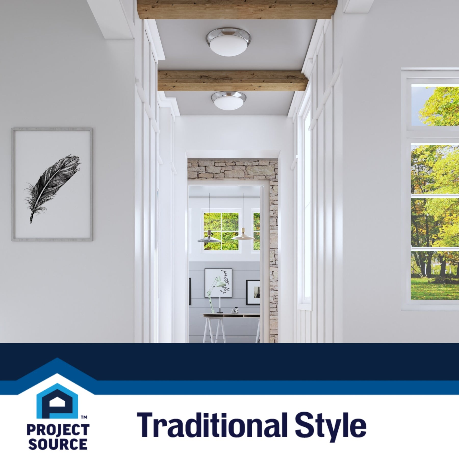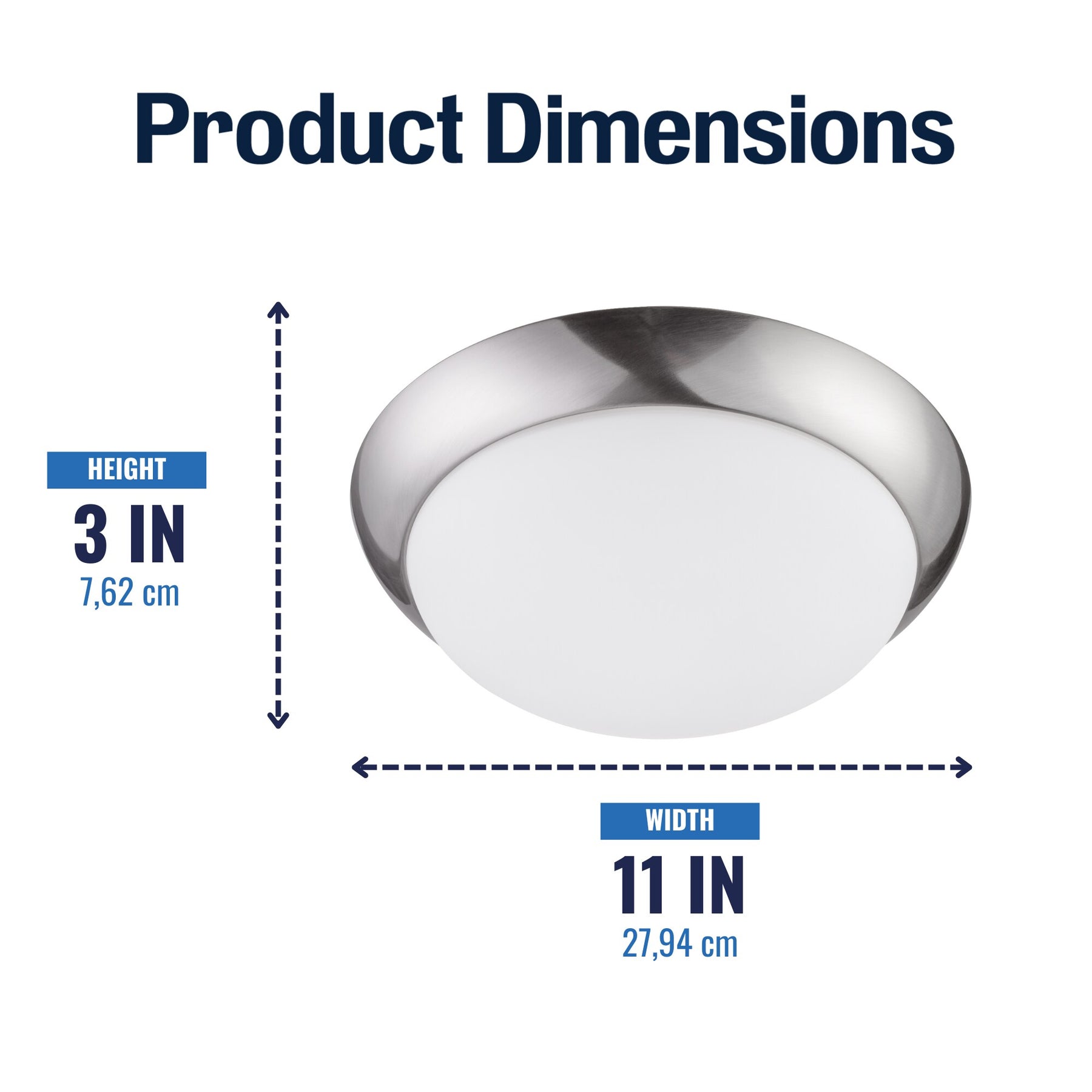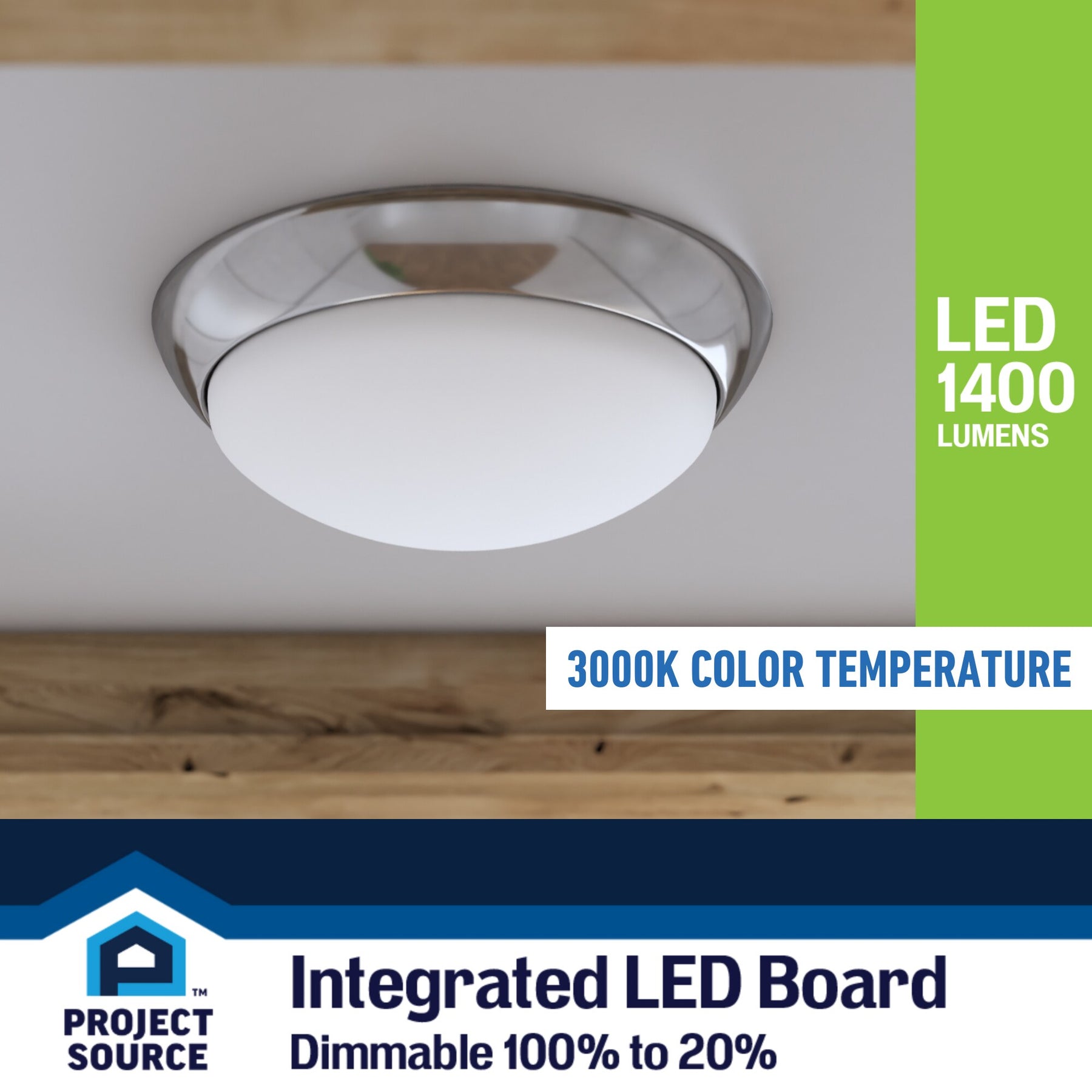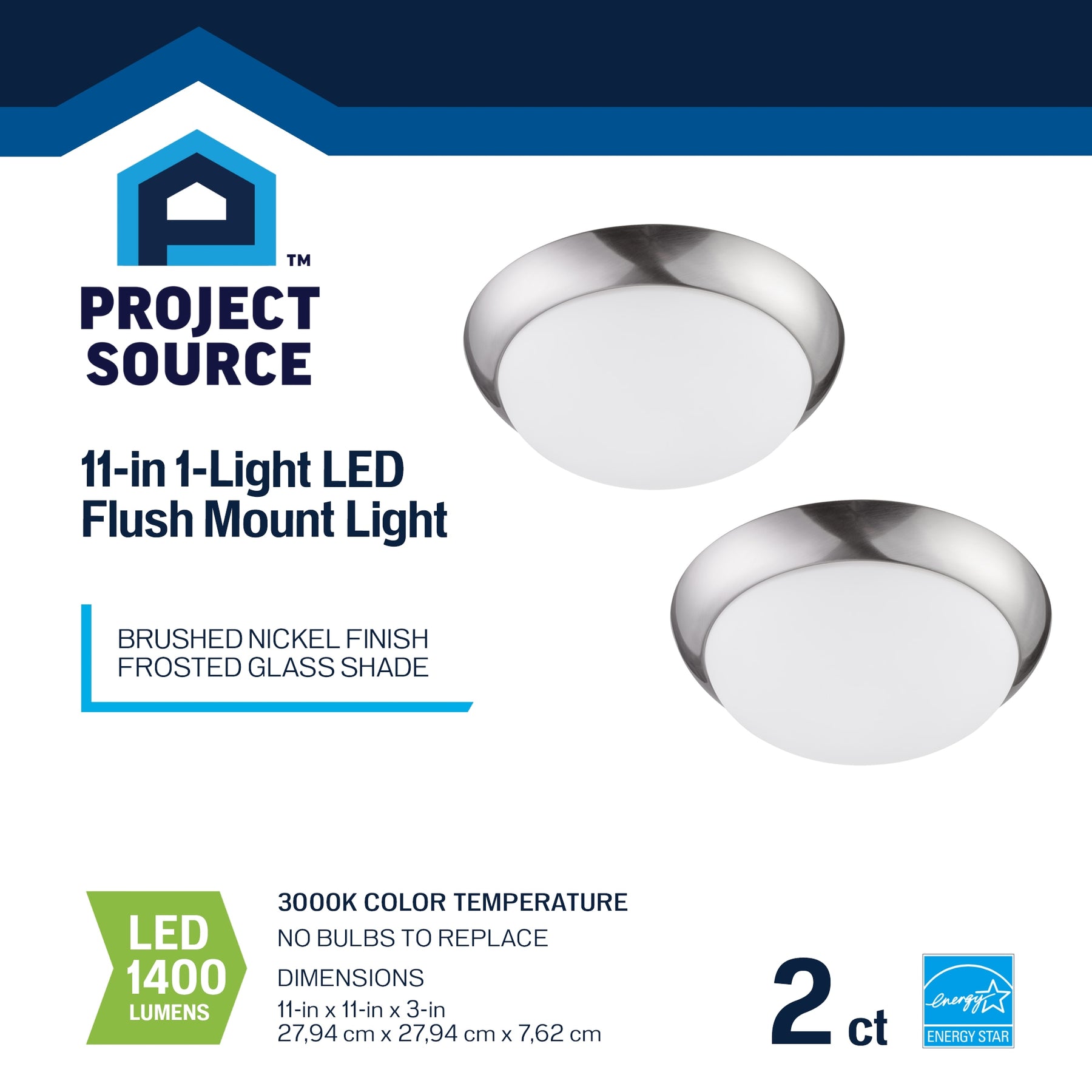 This Project Source 11-inch flush mount set features integrated LED boards delivering 1400 lumens of warm 3000K light. The brushed nickel metal frame and frosted glass shade offer a clean, traditional look with dimming capability for versatile indoor use.