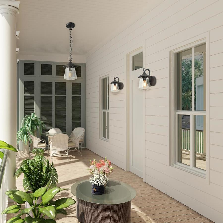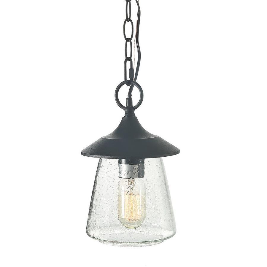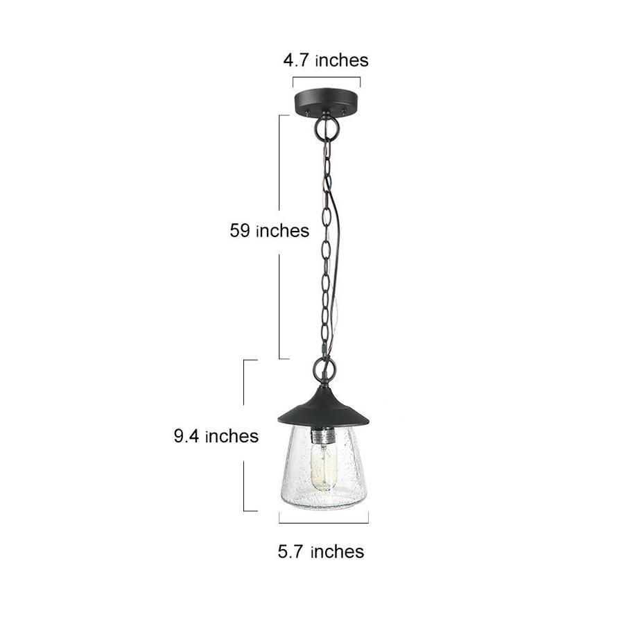 Durable outdoor lantern: sturdy construction of aluminum for lasting durability Classic outdoor wall light features a black finish with seedy glass for a traditional look Weather/rust resistance and can be used in wet locations for open or direct exposure to sun, rain, snow, or water spray and is ideal for open porches, lanais, pergolas and more Easy installation with all mounting hardware included Overall size: 6-in width 6-in depth 9.5-in height Requires 1 x max 60-Watt e26 bulbs (not included) Dimmable for desired ambiance when used with dimmable bulbs (not included) This one-light outdoor wall sconce is a prefect pick for your front door, porch, patio, garden, balcony, entryway, garage, hallway, deck, etc 59-In adjustable hanging chain tailors your personal desired height