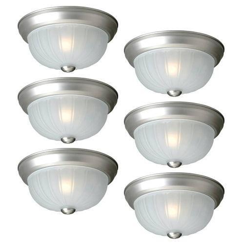 A budget-friendly 6-pack of traditional flush mount ceiling lights in painted brushed nickel with frosted glass shades. Each 10-inch fixture is hardwired and compatible with one 60W A19 bulb (LED or incandescent), ideal for bedrooms, kitchens, foyers, and hallways.