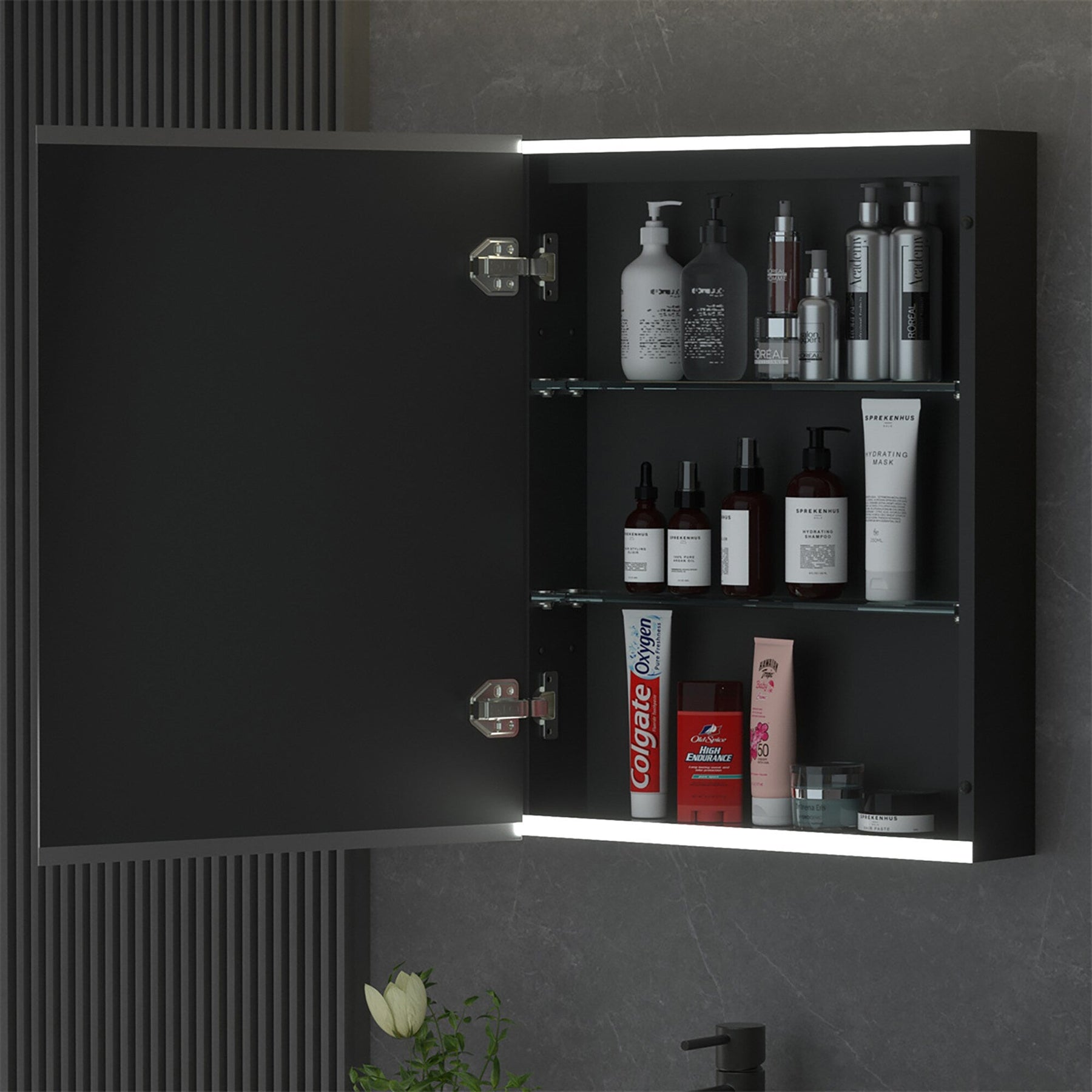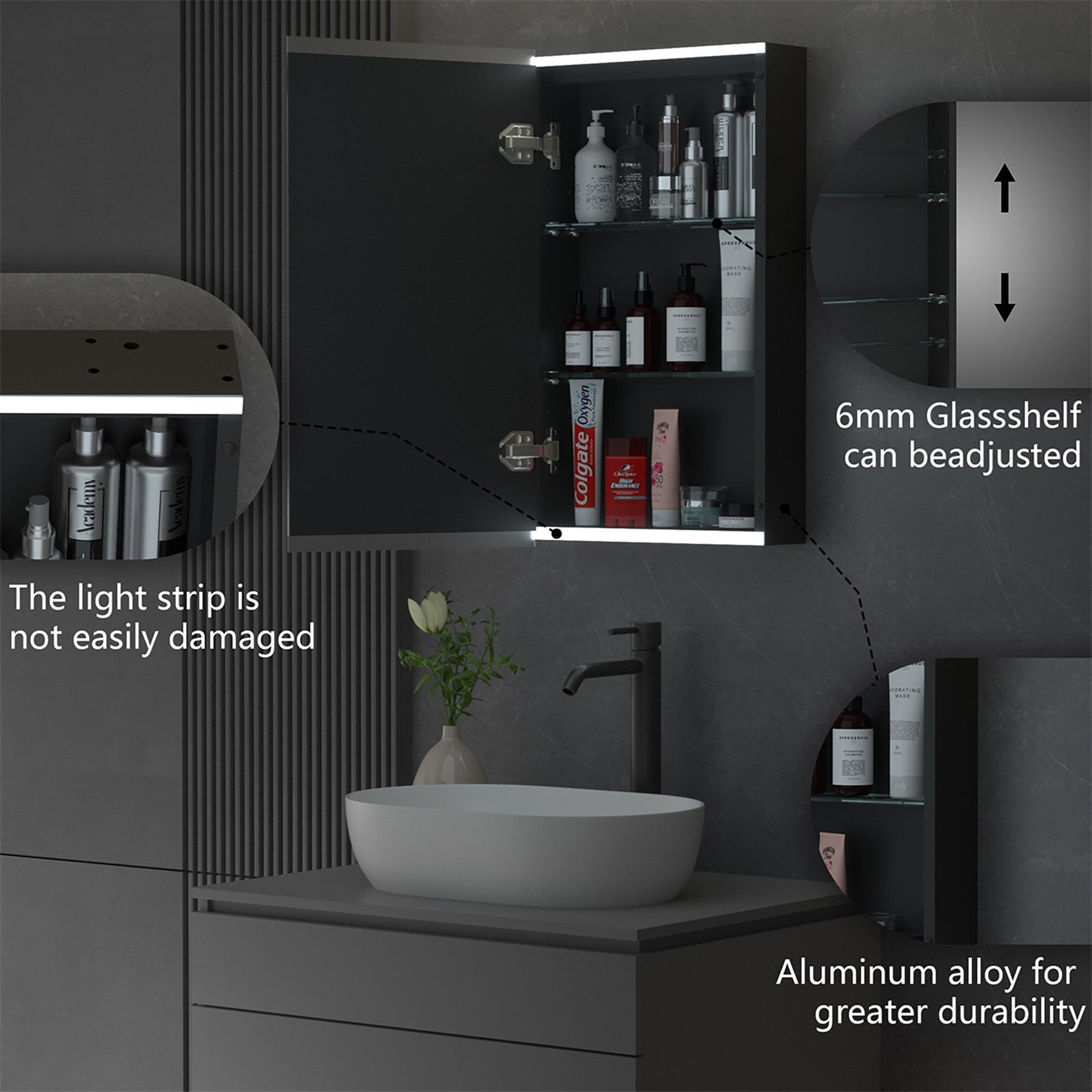 The Forclover 20" x 26" Lighted LED Surface Mount Aluminum Mirrored Medicine Cabinet combines modern elegance with practicality in any bathroom setting. Featuring a frameless design and a bright, energy-efficient SMD LED light strip, this medicine cabinet is the perfect blend of form and function, offering customizable storage with its adjustable tempered glass shelves.