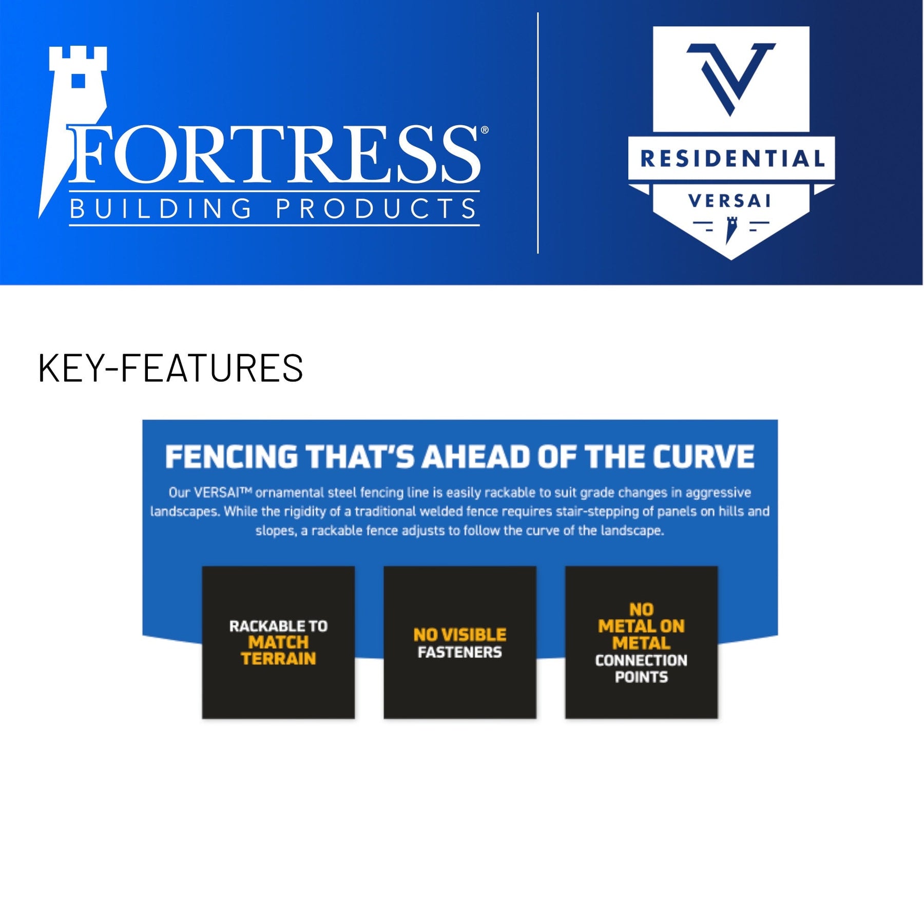 The Fortress Building Products Versai Fence Gate offers a seamless integration of style and security with its glossy black powder-coated finish and sturdy galvanized steel construction. Designed to complement any outdoor area, the flat-top privacy walk-thru gate delivers durability and elegance that's built to last with a 20-year warranty.