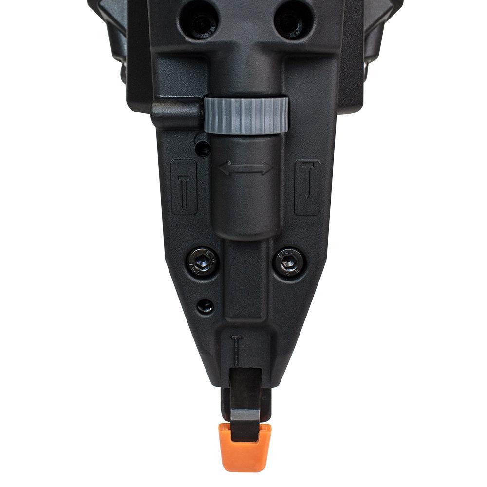 - Red and green LED lights on the side of the tool indicate when the battery is low, the tool is jammed, fasteners are low, or the tool is overheating