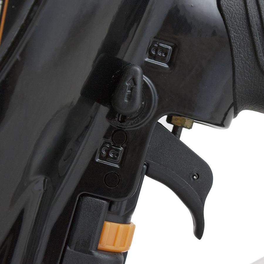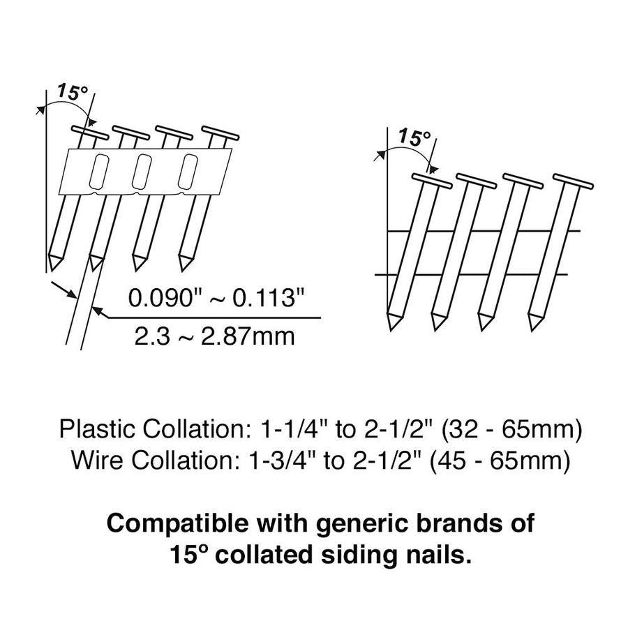 Ideal for cement siding installation, sheathing installation, fencing, fiber concrete siding, decking installation, plywood and OSB Easy to use depth adjust allows for a wide variety of applications and consistent depth in work surfaces Shoots 15-degree nails wire and plastic collated siding nails, ranging from plastic 1-1/4 In. to 2-1/2 In., wire 1-3/4 In. to 2-1/2 In Trigger with safety lock prevents misfires when the tool is not in use Contact fire for safe and precise fastening Quick jam release nose opens the glide plate to easily clear jammed nails, minimizing downtime Reversible belt hook allows the tool to stay close by, but not in the way 10.25 SCFM with 100 fasteners per minutes at 90psi 1-Piece heat treated drive blade reduces the risk of internal failure, ensuring longer life on internal wearable parts