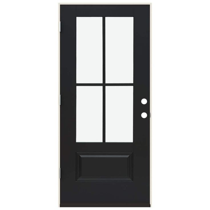 Enhance your home's entryway with the JELD-WEN 36 in. x 80 in. Right-Hand 4 Lite Clear Glass Black Painted Fiberglass Prehung Front Door. This door features a sleek black painted fiberglass design with four clear glass panels, offering a modern aesthetic and allowing natural light to brighten your space. The included brickmould frame adds a touch of elegance and ease of installation.