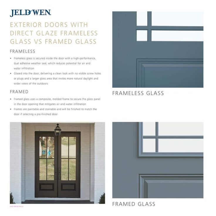 - A: The grids are adhered to the interior and exterior of the glass to provide an authentic divided lite appearance, and the frameless glass style features a larger glass area for more light without unsightly screw holes or plugs.