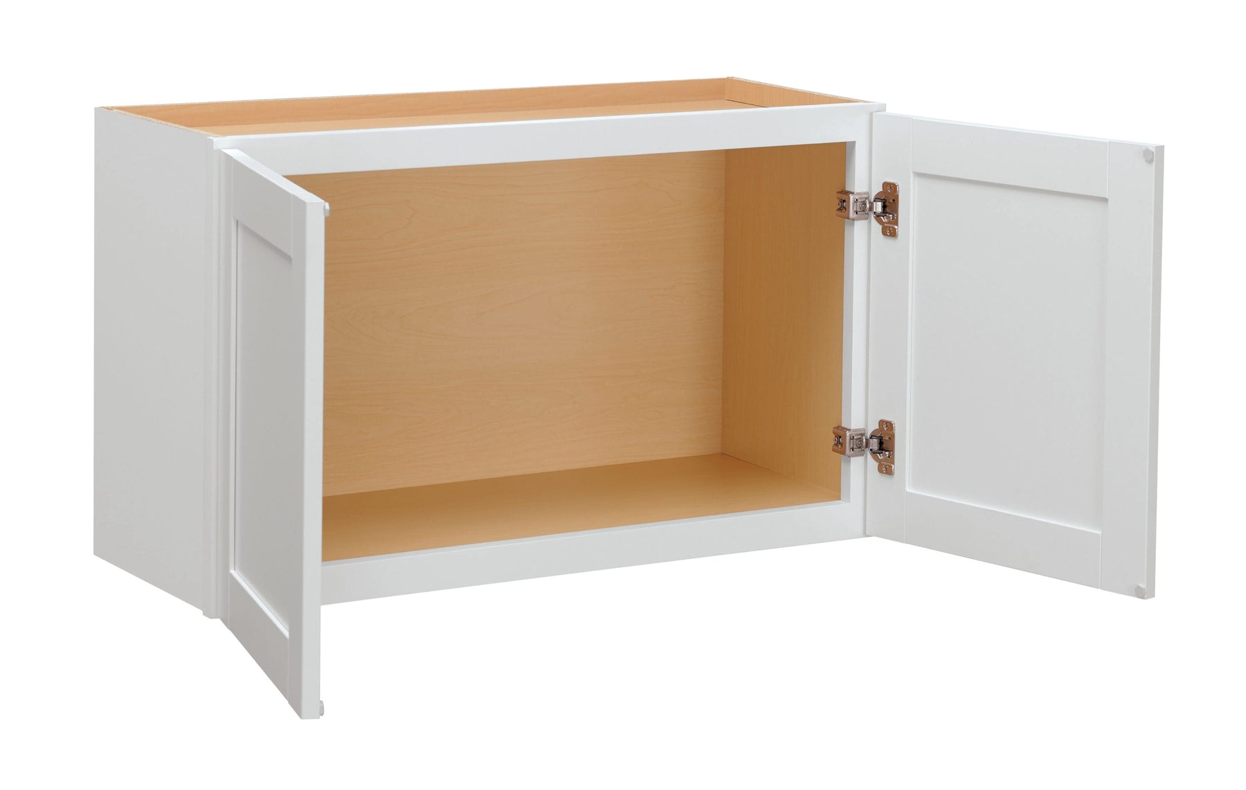 A fully assembled, 36-inch wide wall cabinet from Diamond NOW’s Arcadia collection, featuring a durable TrueColor white laminate finish and recessed panel Shaker doors. Built with solid back construction and furniture board sides for stability and easy installation.