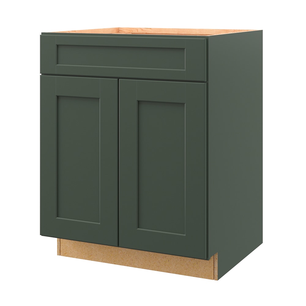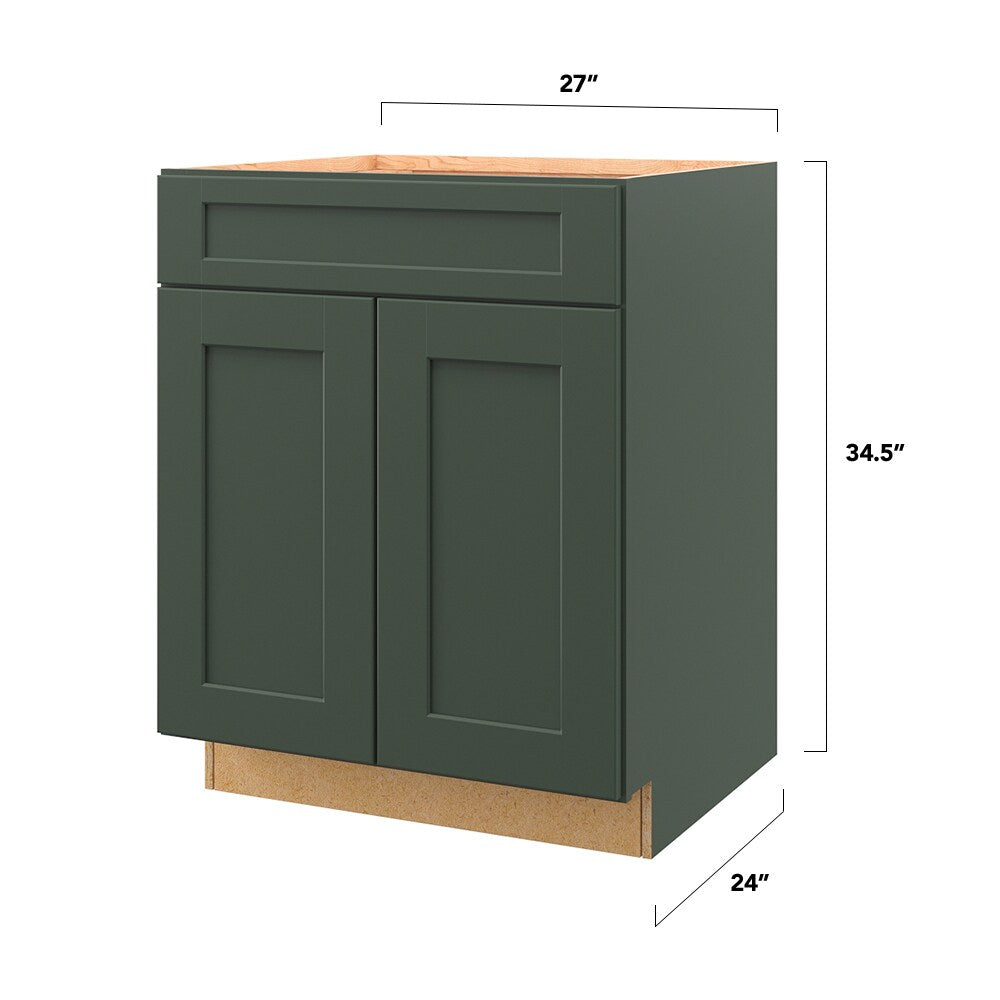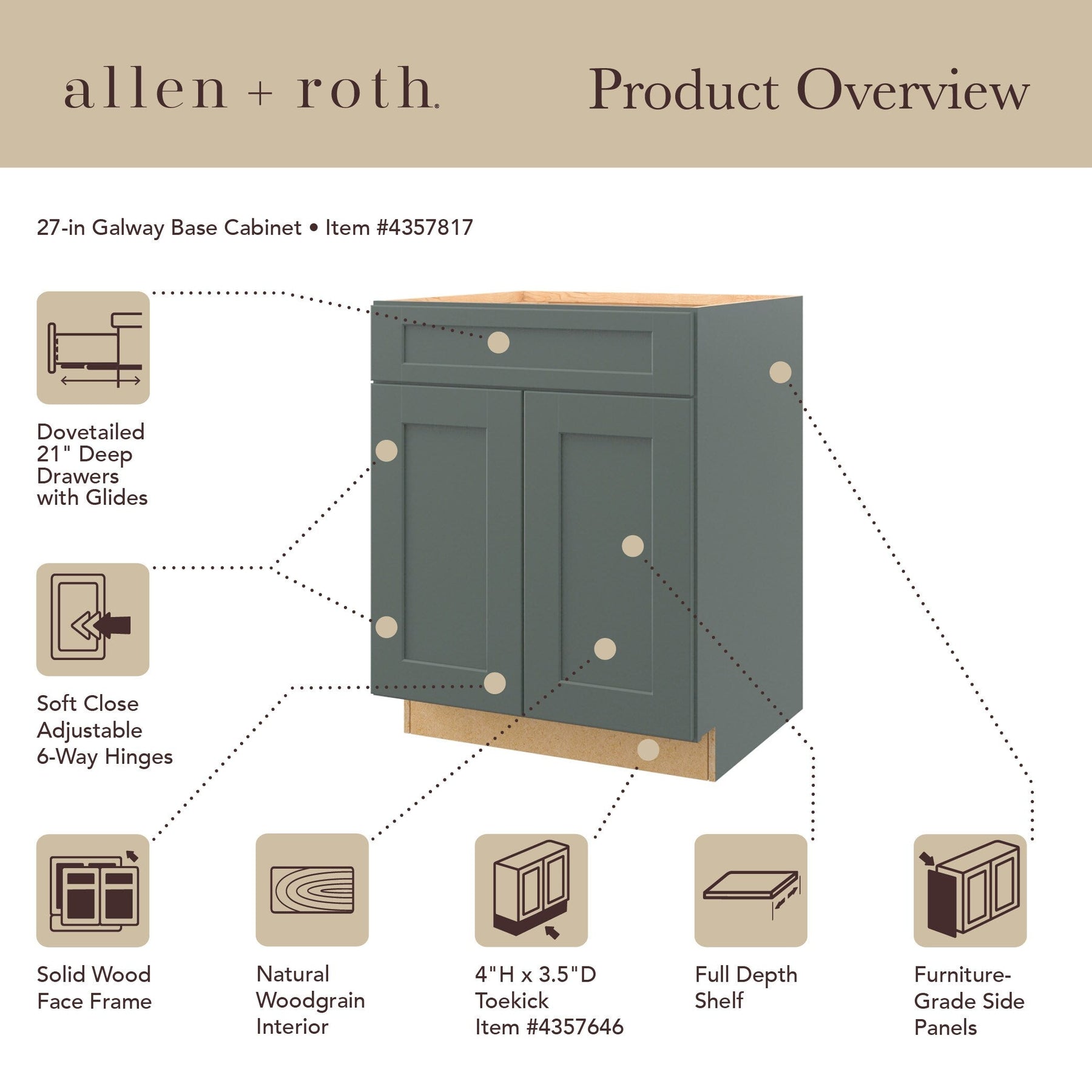 Add a touch of nature-inspired elegance to your home with the allen + roth Galway 27-in Sage Shaker Style Base Cabinet. Designed for aesthetic appeal and function, this cabinet offers superior durability with a true painted finish that combines hard woods and engineered material. The fully assembled cabinet is ready to transform your space with its seamless modern look and soft-close doors.
