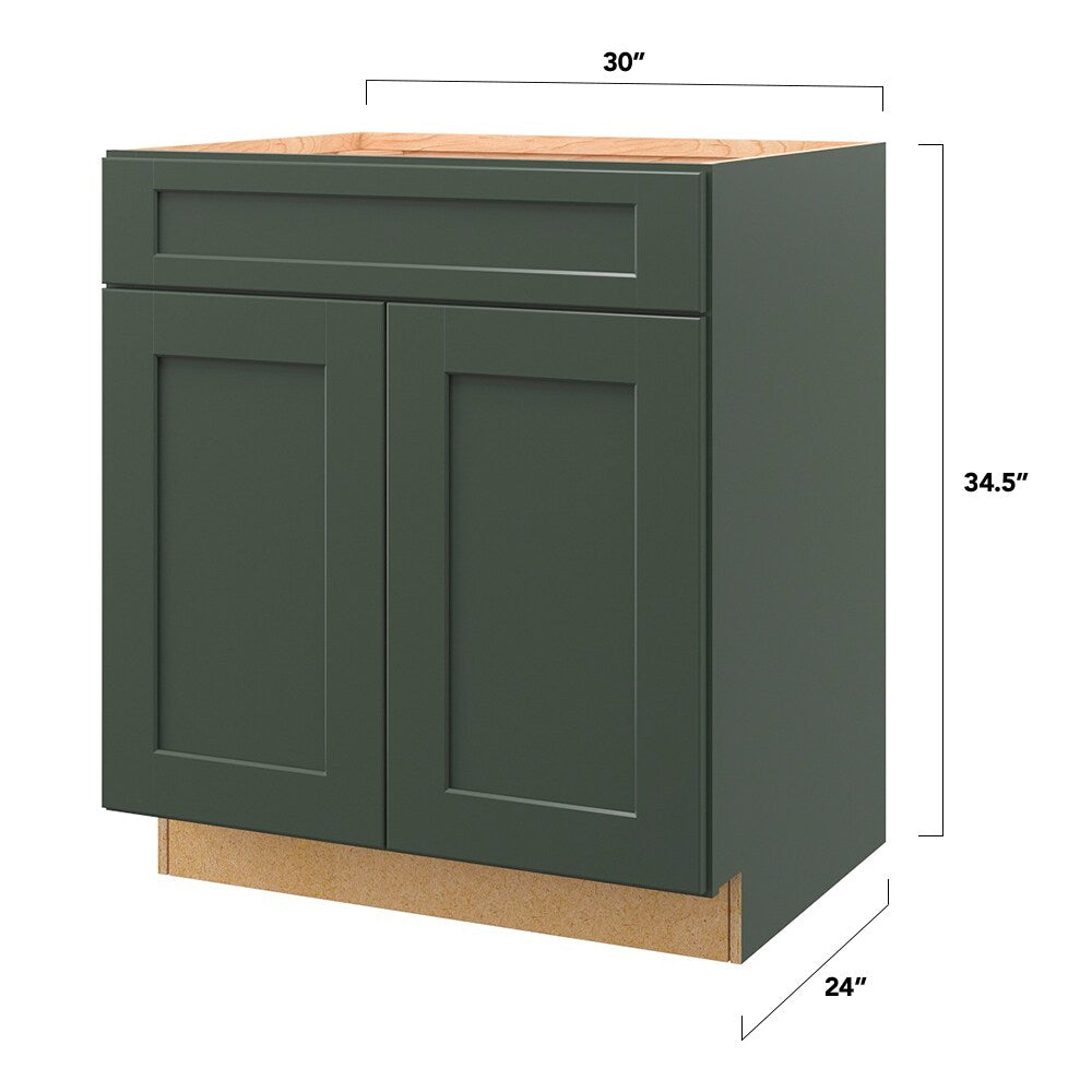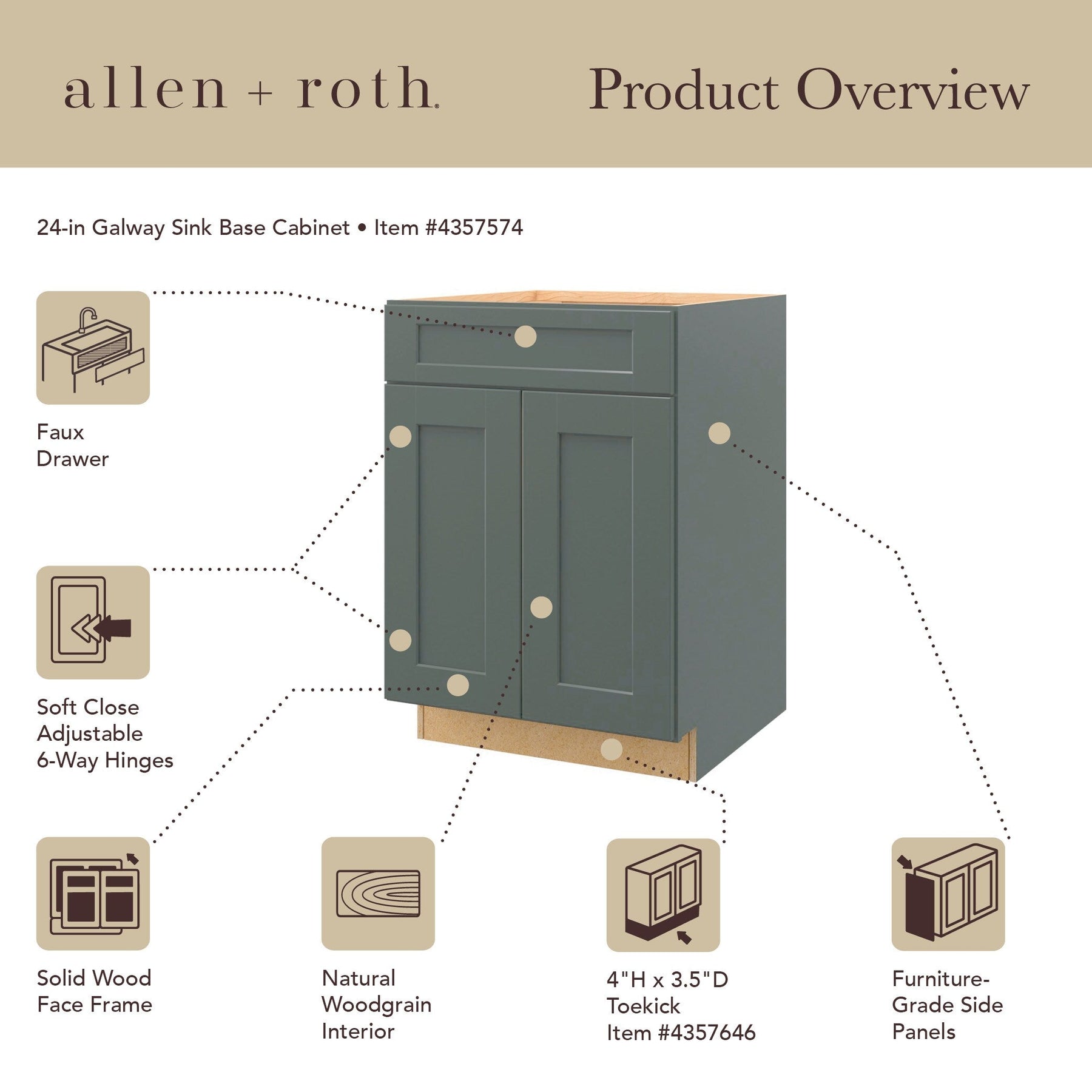 Elevate your kitchen with the allen + roth Galway Sink Base Cabinet, featuring a sophisticated shaker style in a deep sage finish. This fully assembled cabinet offers seamless design with dependable soft-close doors and a sturdy construction that ensures both aesthetics and functionality.