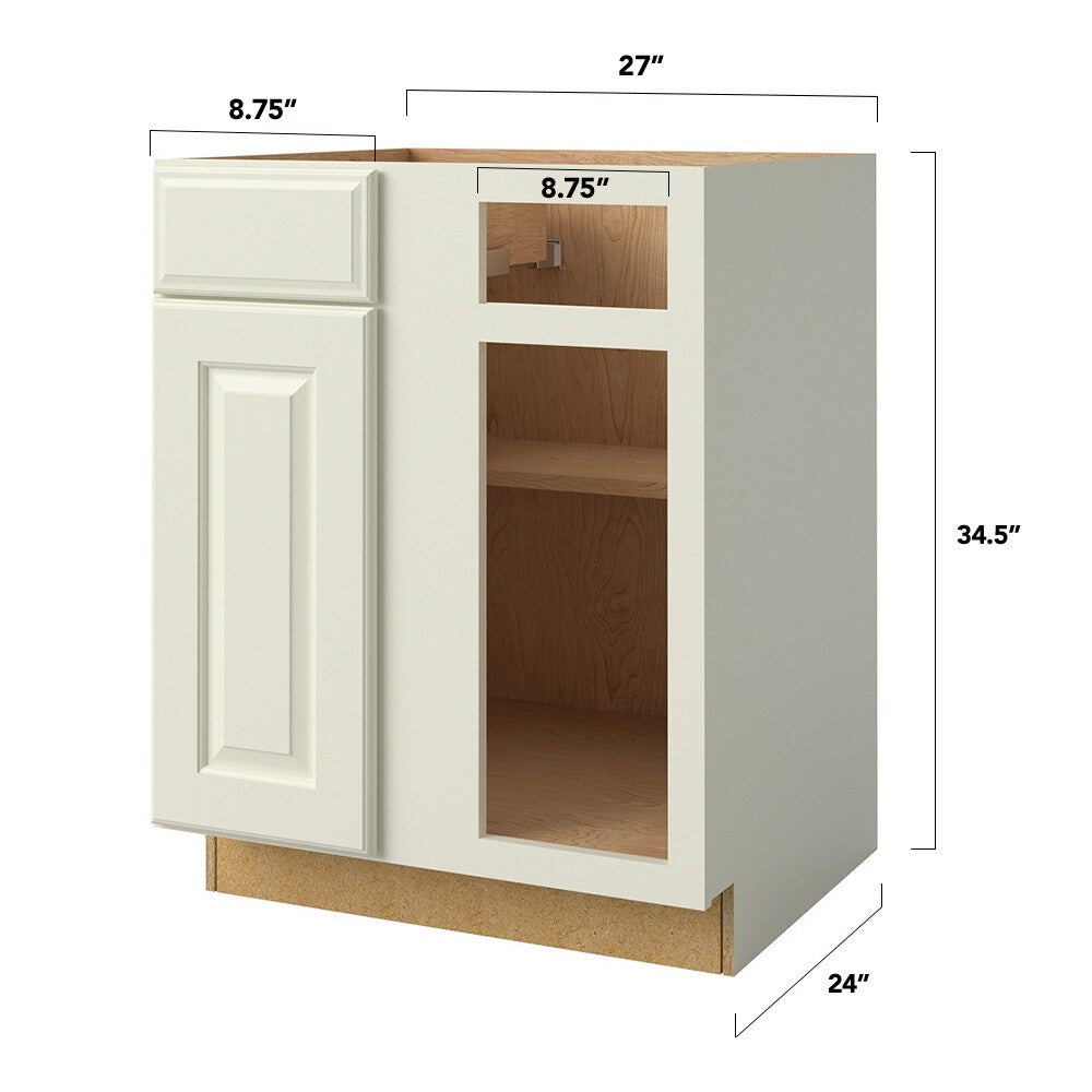 Introducing the Harbor Blind Base Cabinet by allen + roth, a stylish and durable solution for versatile kitchen storage. This fully assembled cabinet boasts a raised panel square style in a light gray finish, blending hardwoods and engineered materials for lasting beauty and structural integrity. Its sophisticated design with reversible door and drawer options enhances your kitchen's elegance and functionality.