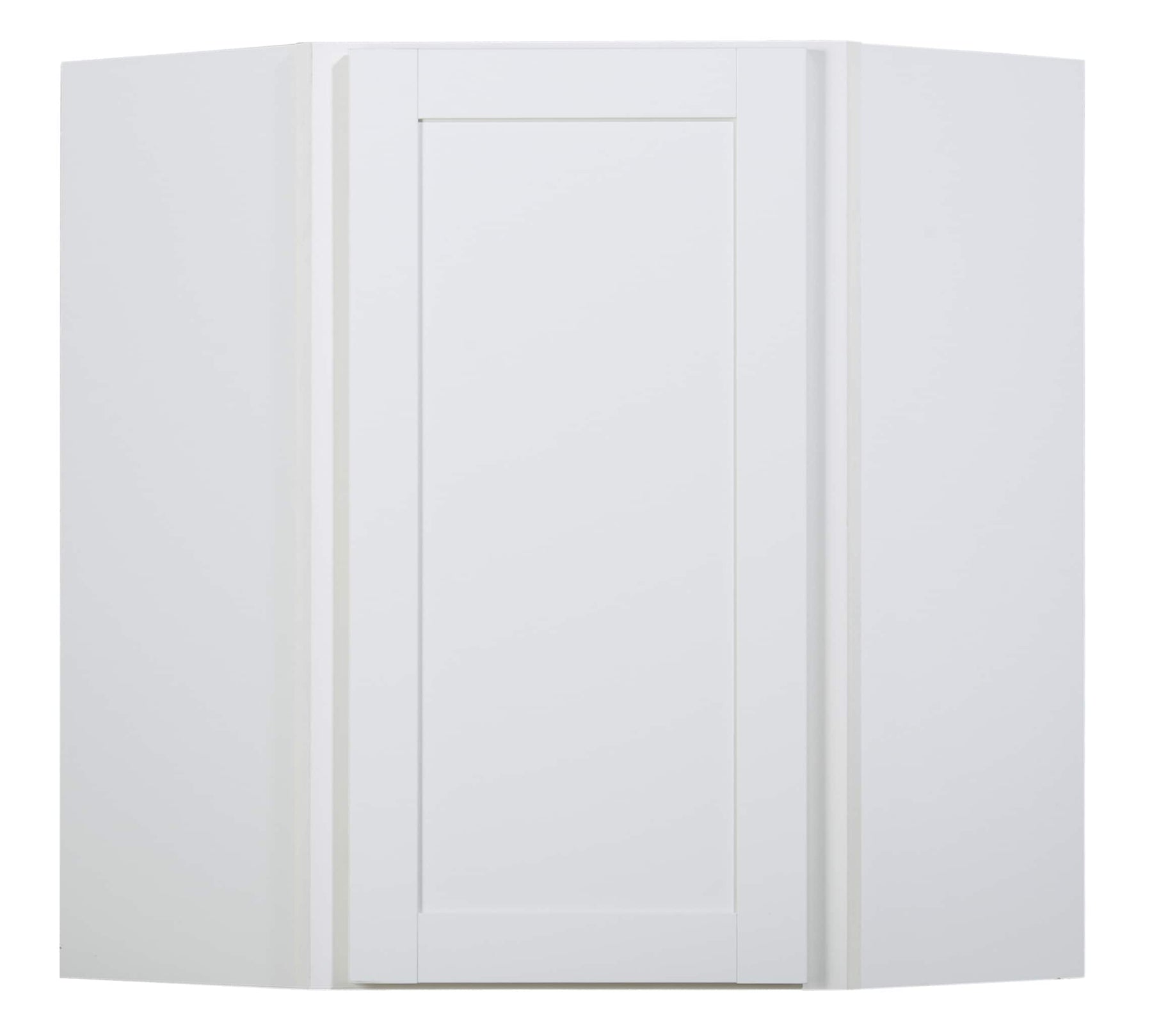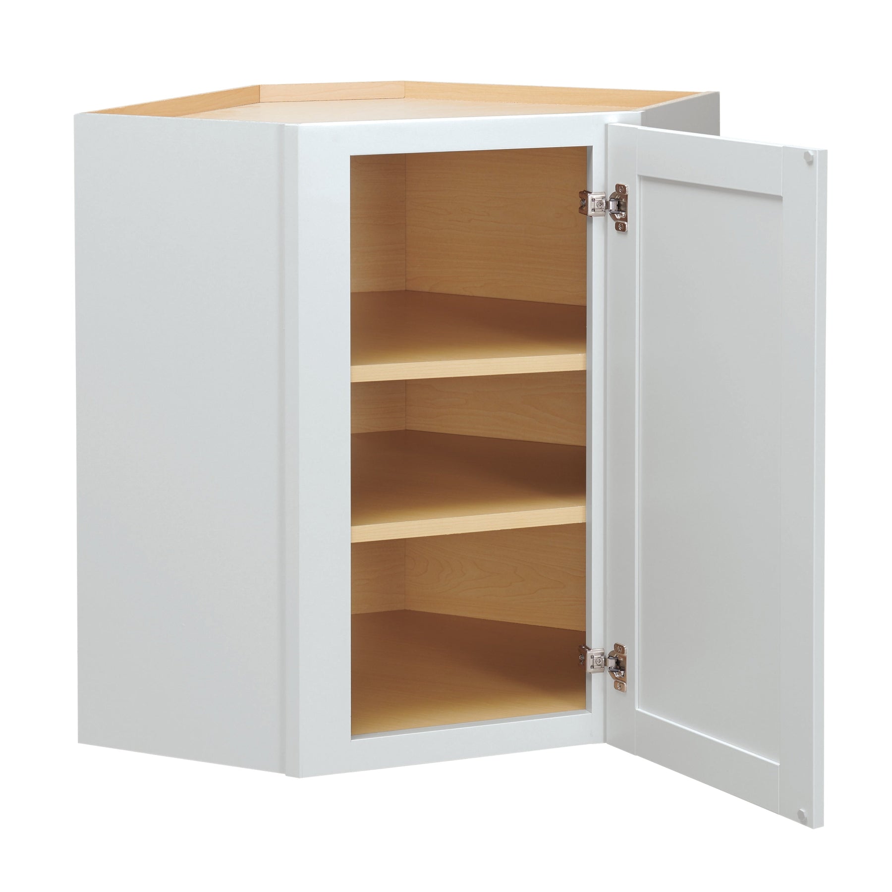 Enhance your kitchen's functionality and style with the Arcadia Diagonal Corner Wall Cabinet. Its crisp white TrueColor™ finish offers long-lasting durability and a seamless, modern look. Fully assembled for hassle-free installation, this cabinet maximizes space with two adjustable, strong shelves that can support heavier items.