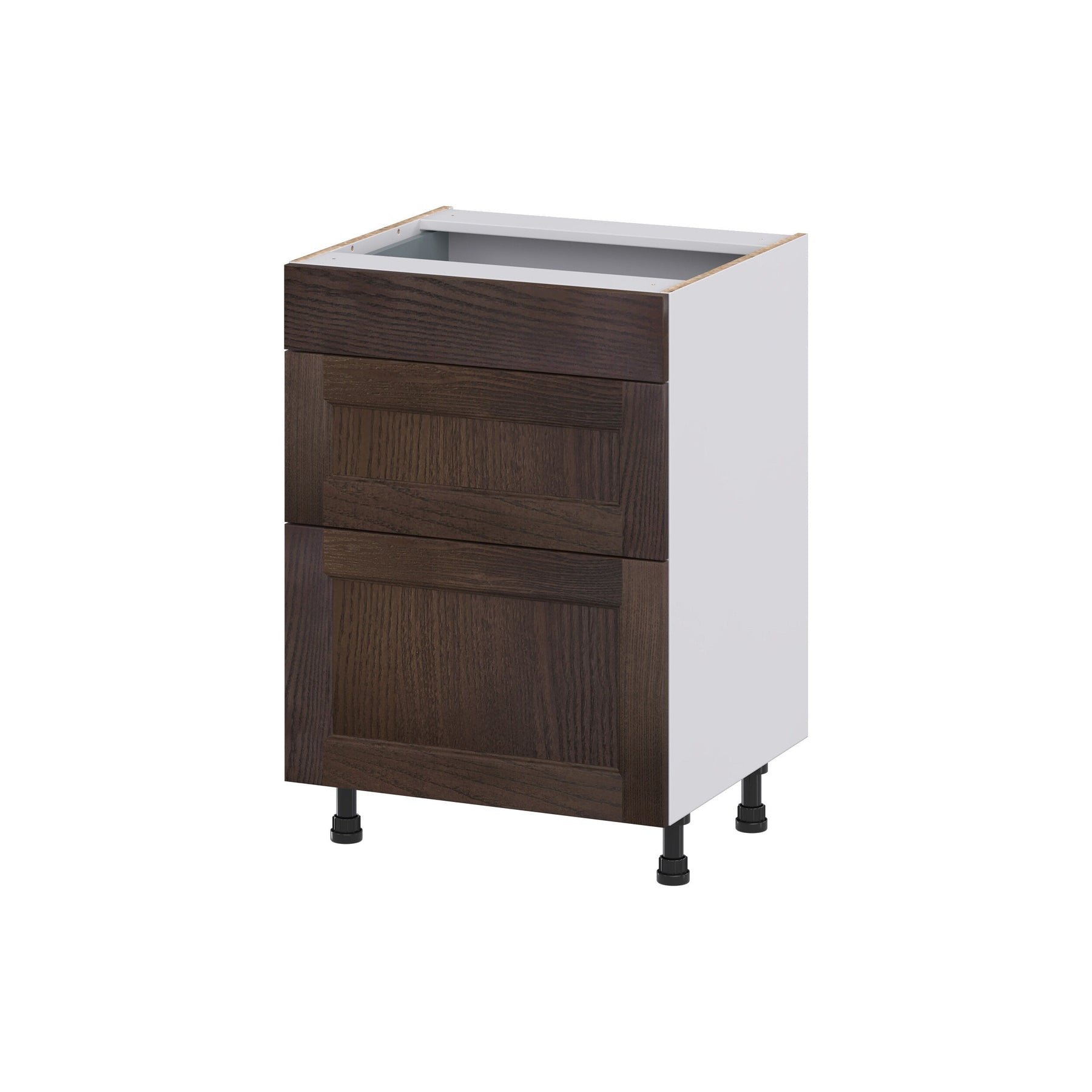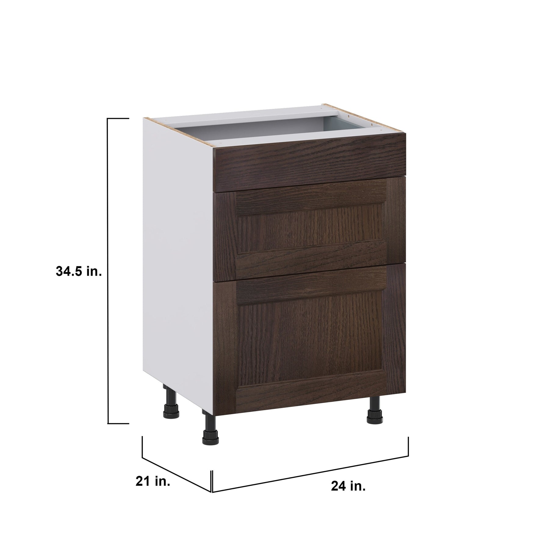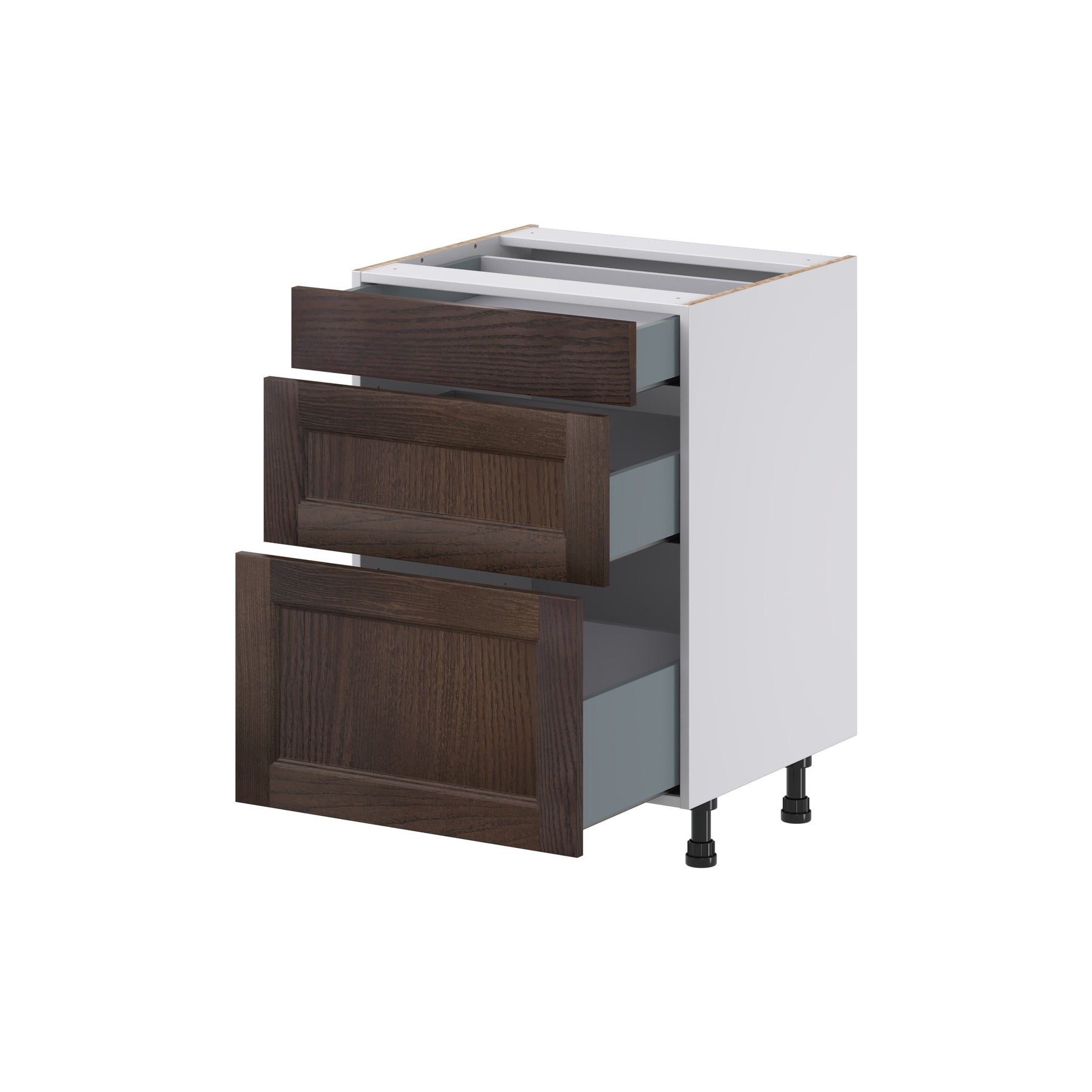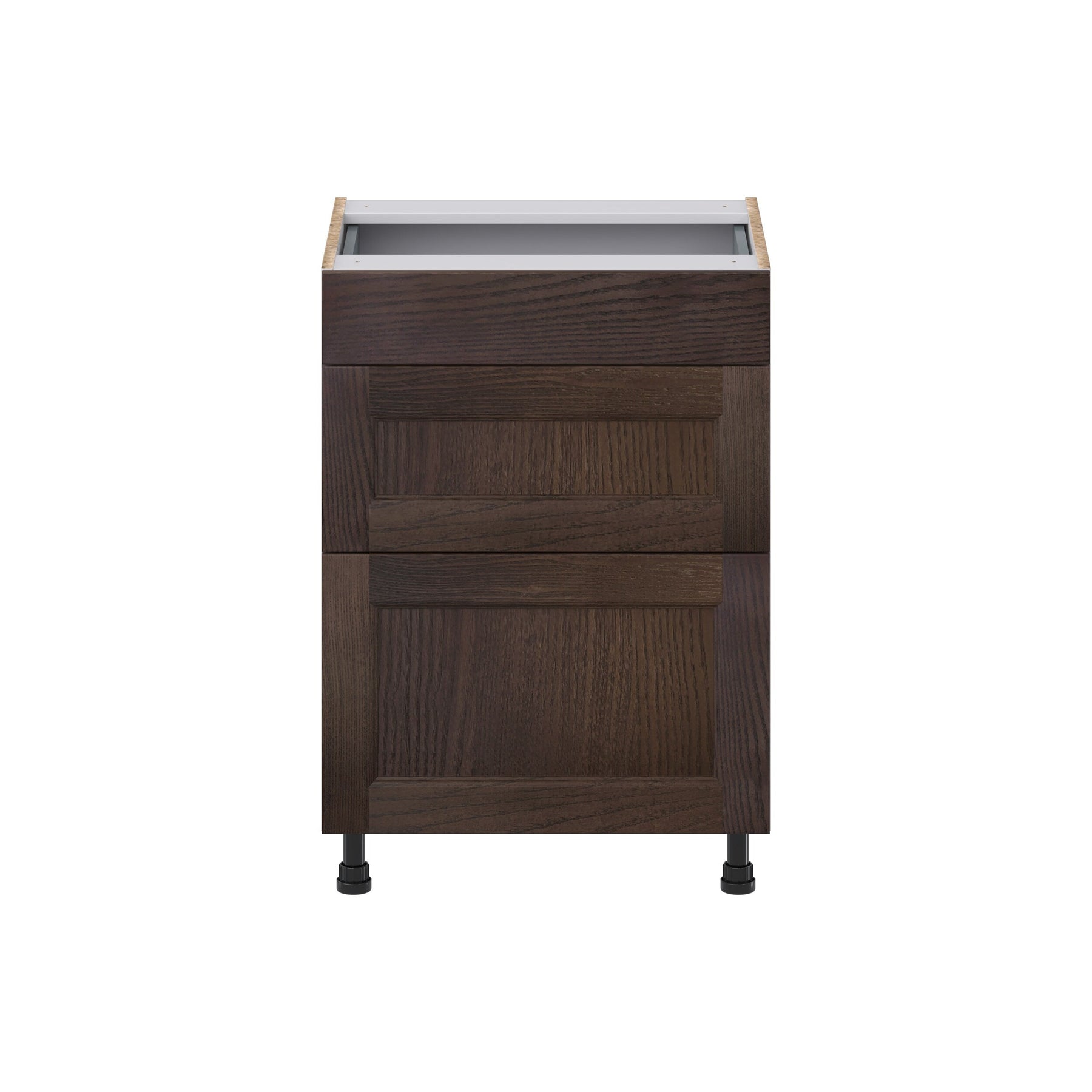 The Hugo & Borg 24" 3-Drawer Base Cabinet combines elegant design with practical functionality, perfect for any upscale kitchen or workspace. Featuring a sleek, recessed panel style and a rich, dark brown finish, this cabinet offers durability and a soft-close drawer mechanism for seamless operation.