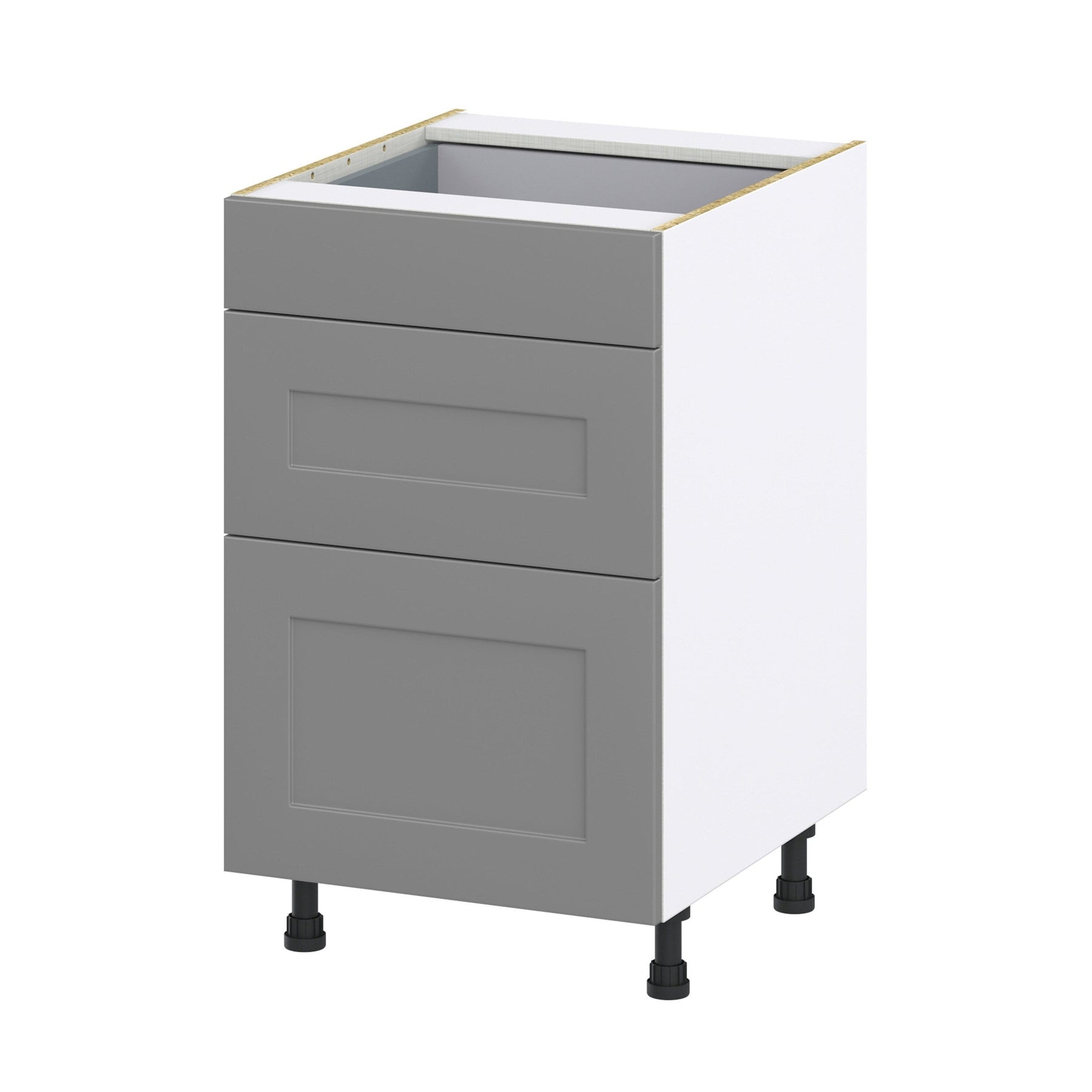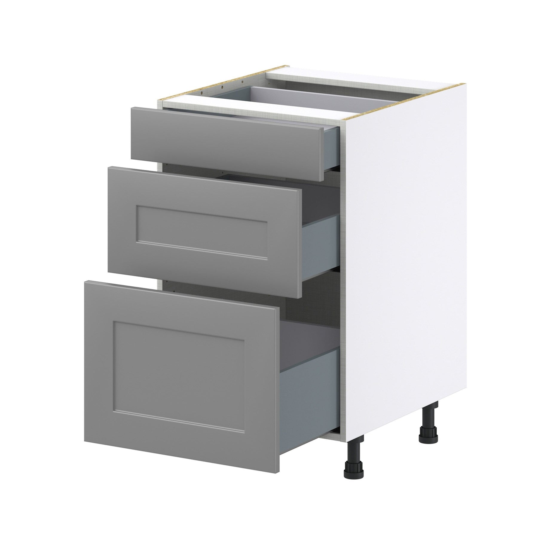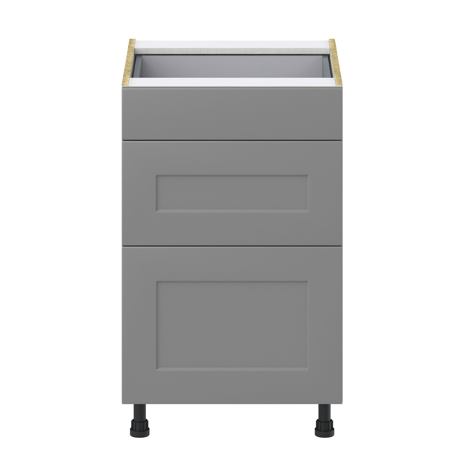 Elevate your home projects with the Hugo&Borg Beaumont 3-Drawer Base Cabinet. This sleek, slate gray cabinet features a fully assembled, recessed panel style that balances modern design with superior functionality. Perfect for kitchens, baths, or utility spaces, it offers robust storage solutions with a touch of elegance.