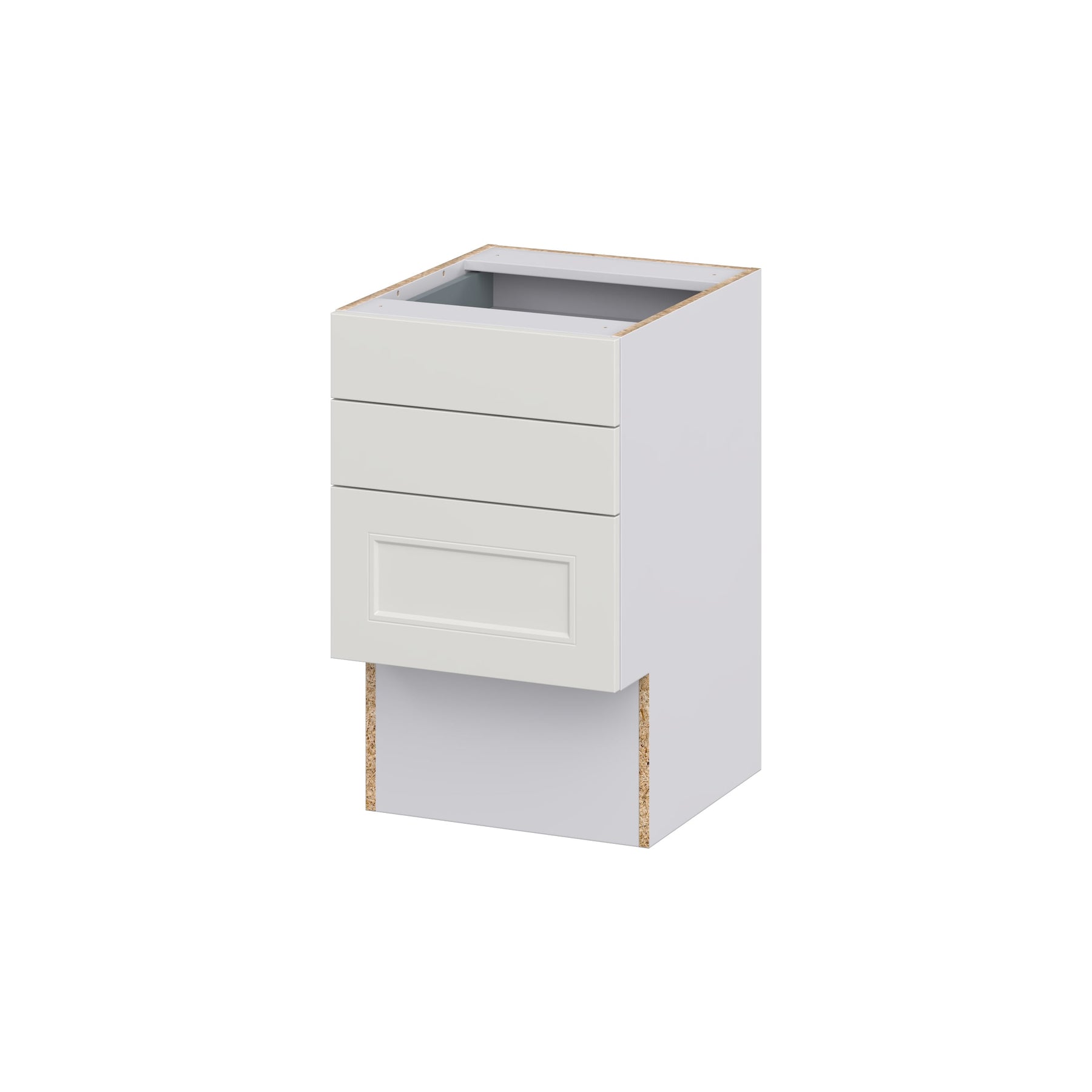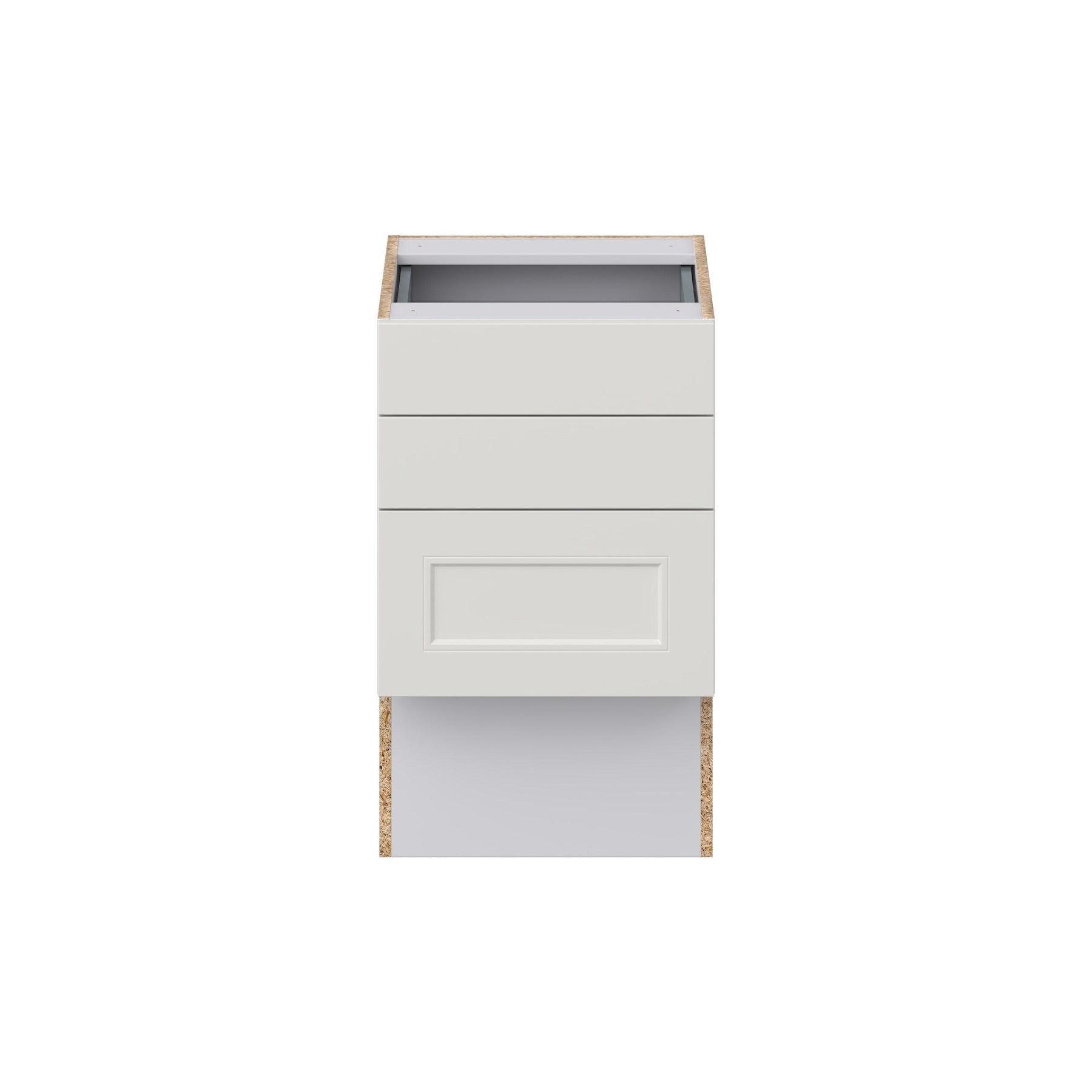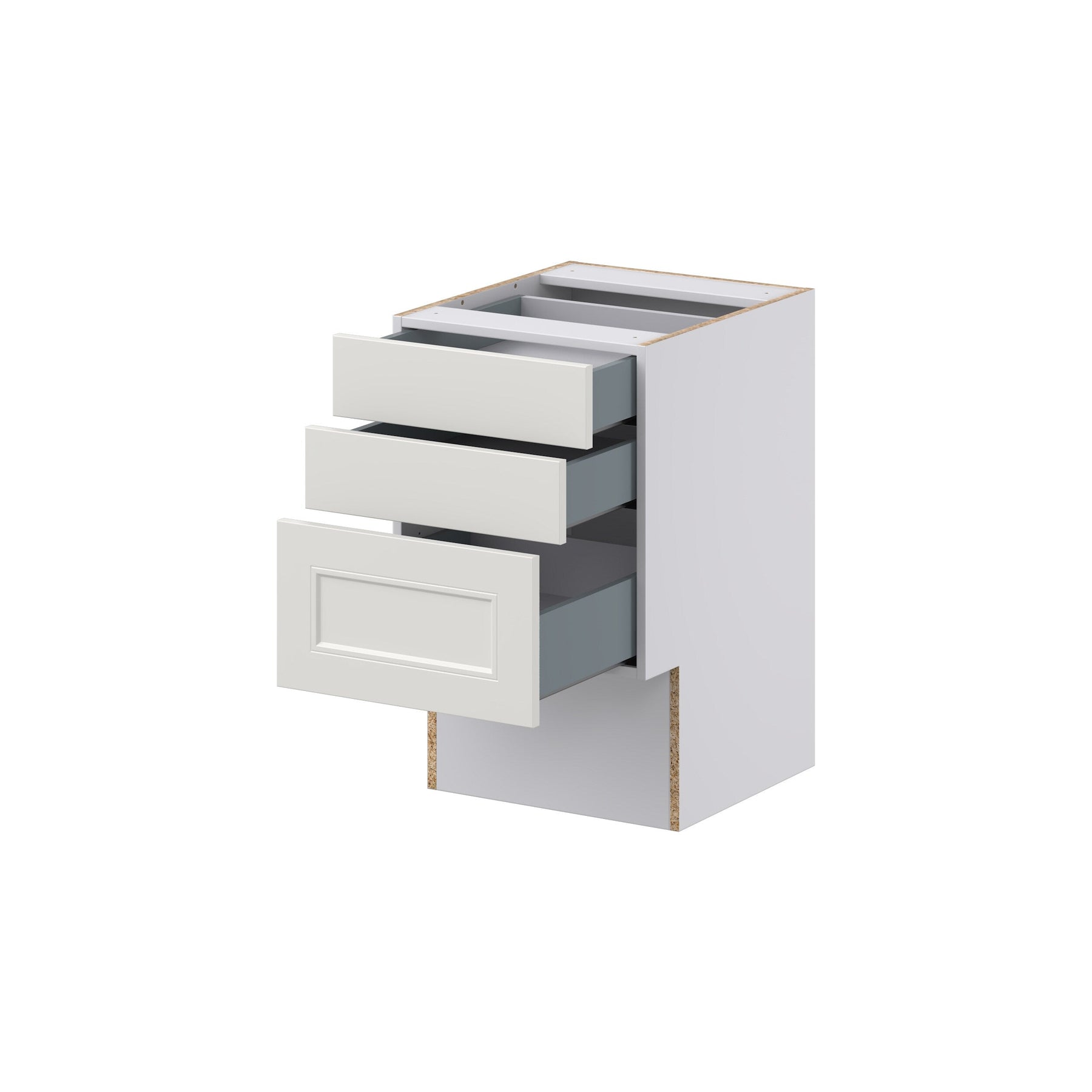 The Hugo&Borg Belcourt 3-Drawer Base Cabinet offers effortless elegance with its gray recessed panel design. Fully assembled and crafted with European frameless construction, it promises seamless accessibility and robust storage in a compact form, perfect for contemporary home improvements.