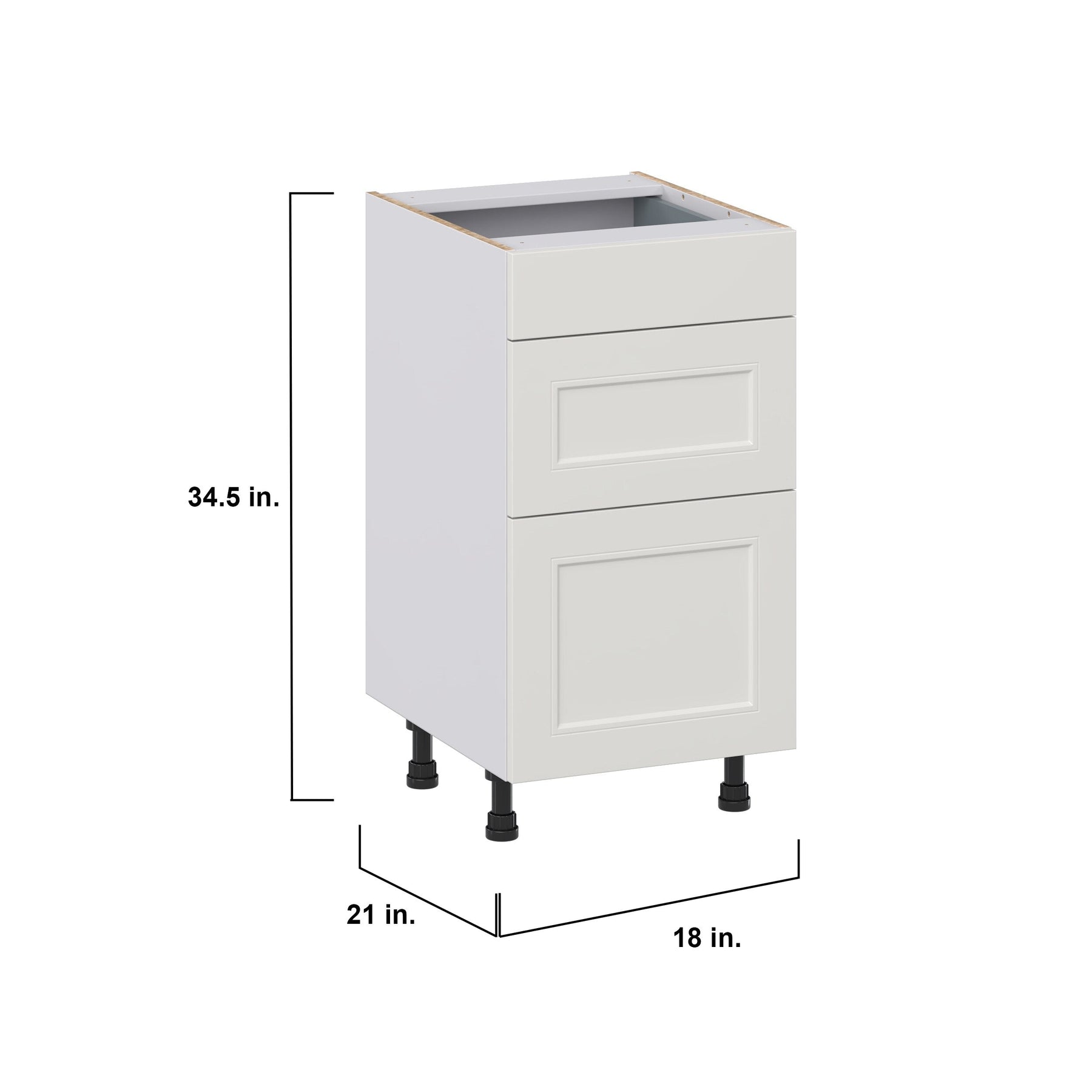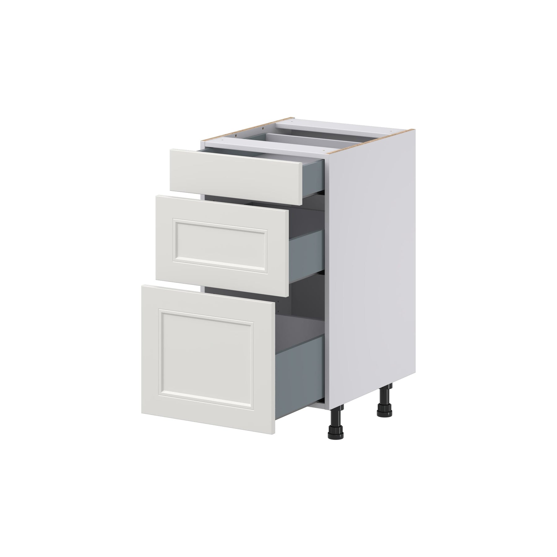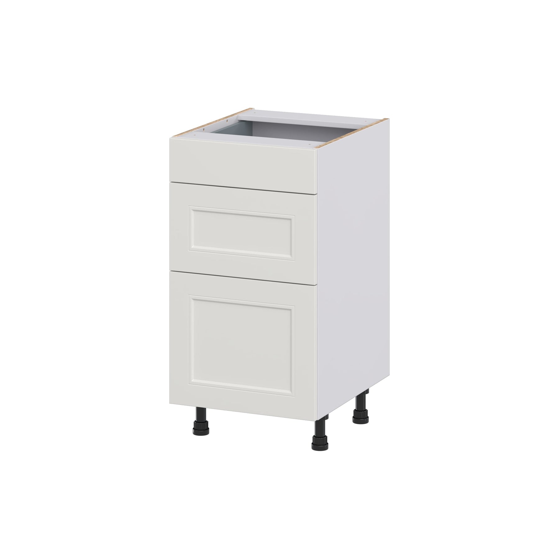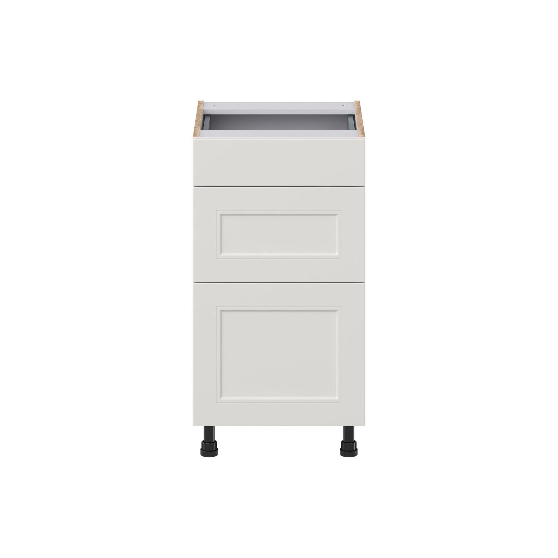 The Hugo&Borg Belcourt 3-Drawer Base Cabinet combines exquisite design with functional storage, perfect for modern kitchens or workshops. Finished in painted light gray, this fully-assembled cabinet features a recessed panel style and soft-close drawers for a seamless and quiet operation. Effortlessly enhance your workspace with its ample storage space and durable construction.