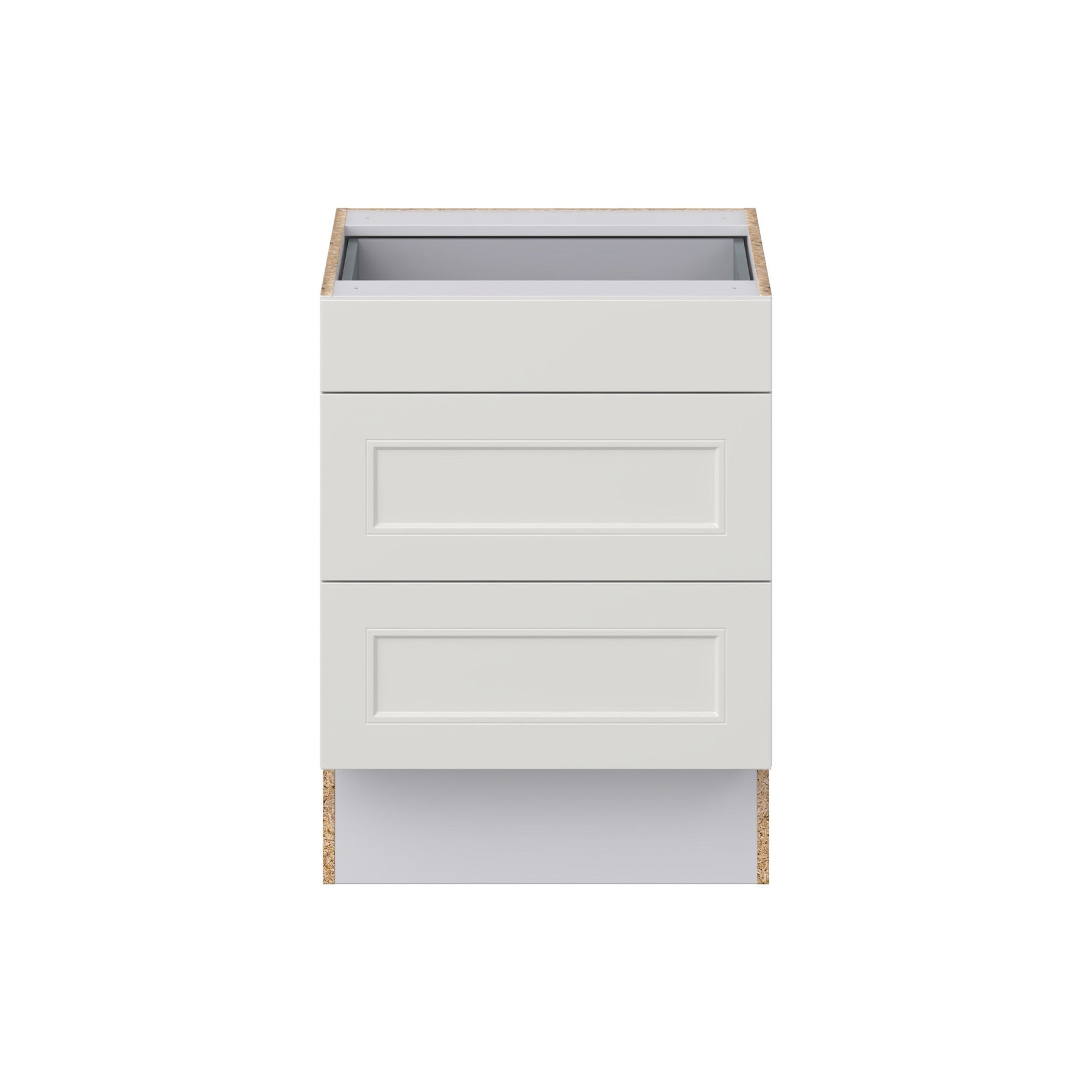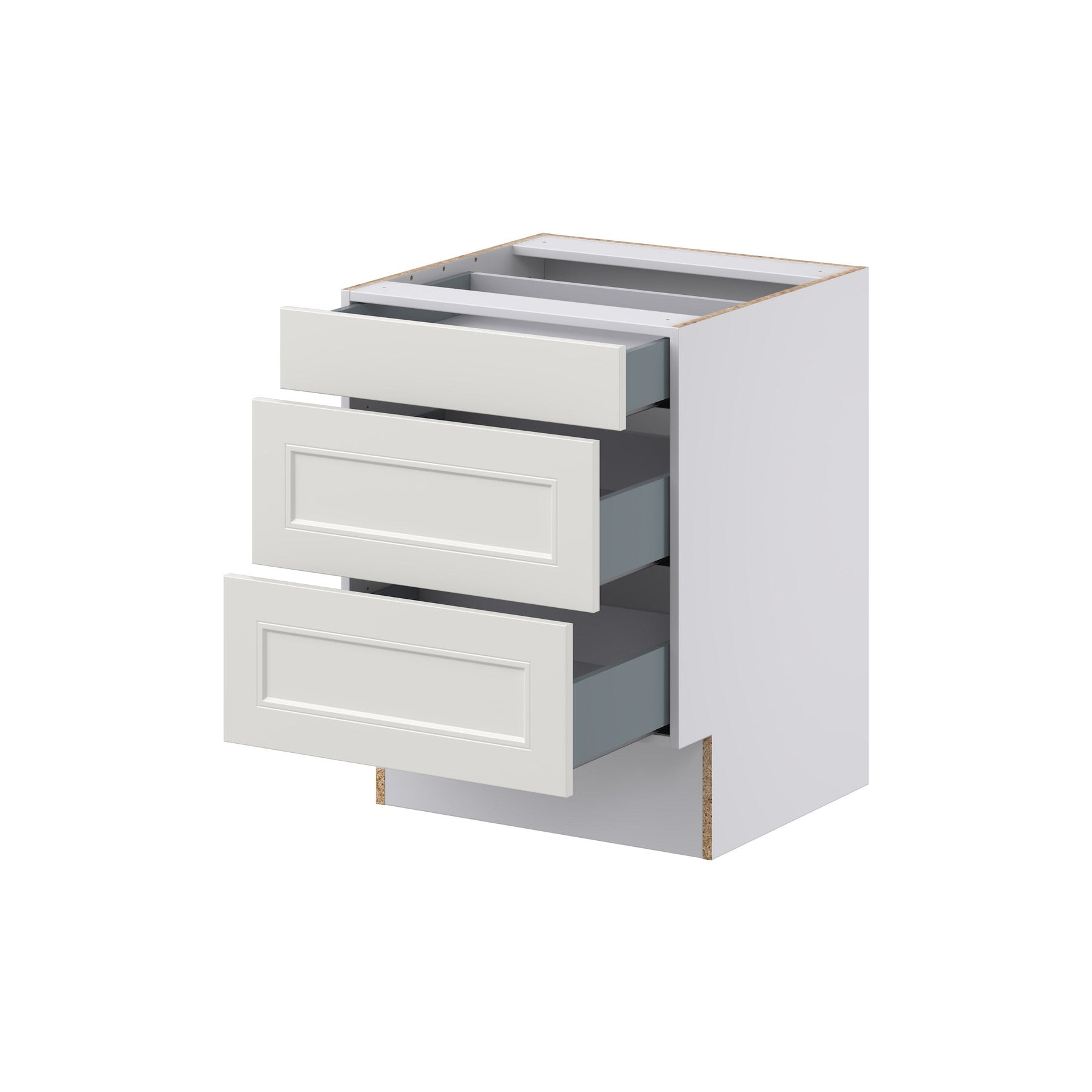 The Hugo&Borg Belcourt Gray 3-Drawer Base Cabinet sets a standard for innovative design and functionality. Crafted with a sleek European frameless box construction, it offers accessible and stylish storage for any kitchen or workspace. Finished in a durable light gray paint, it marries elegance with practicality, ideal for professionals and DIY enthusiasts alike.