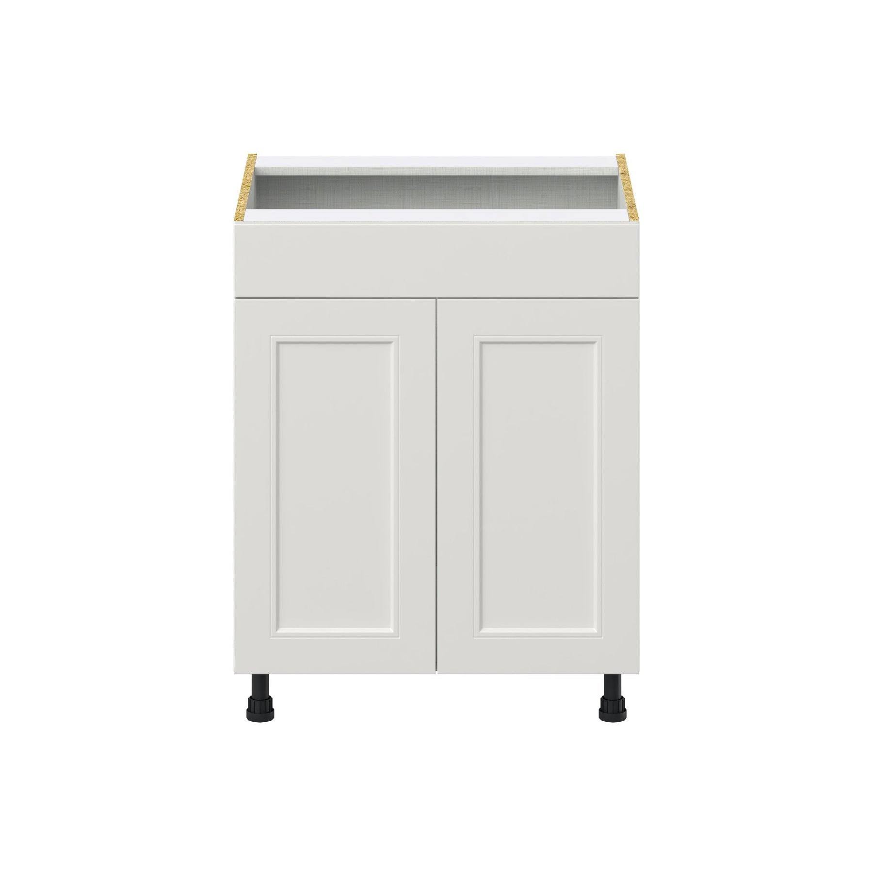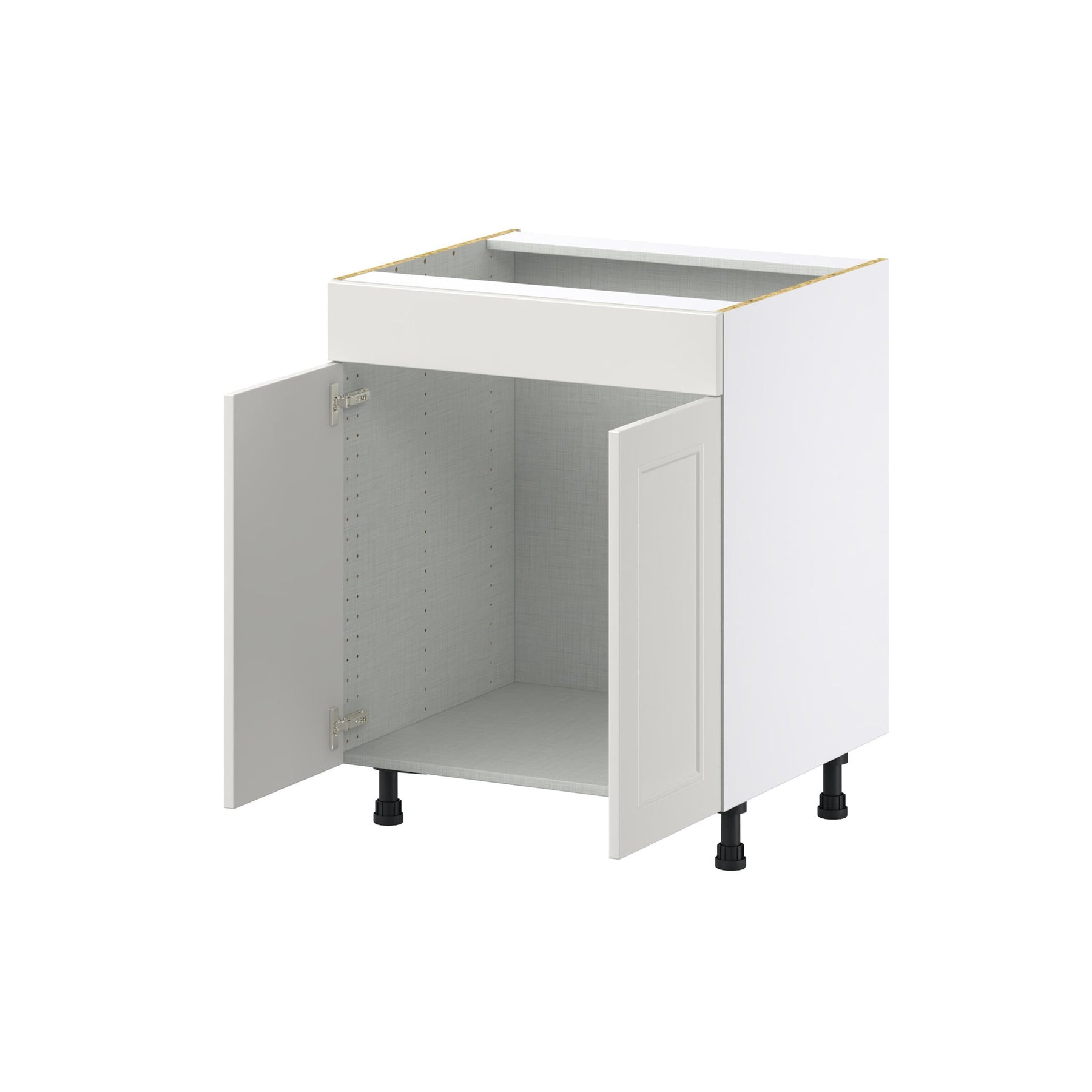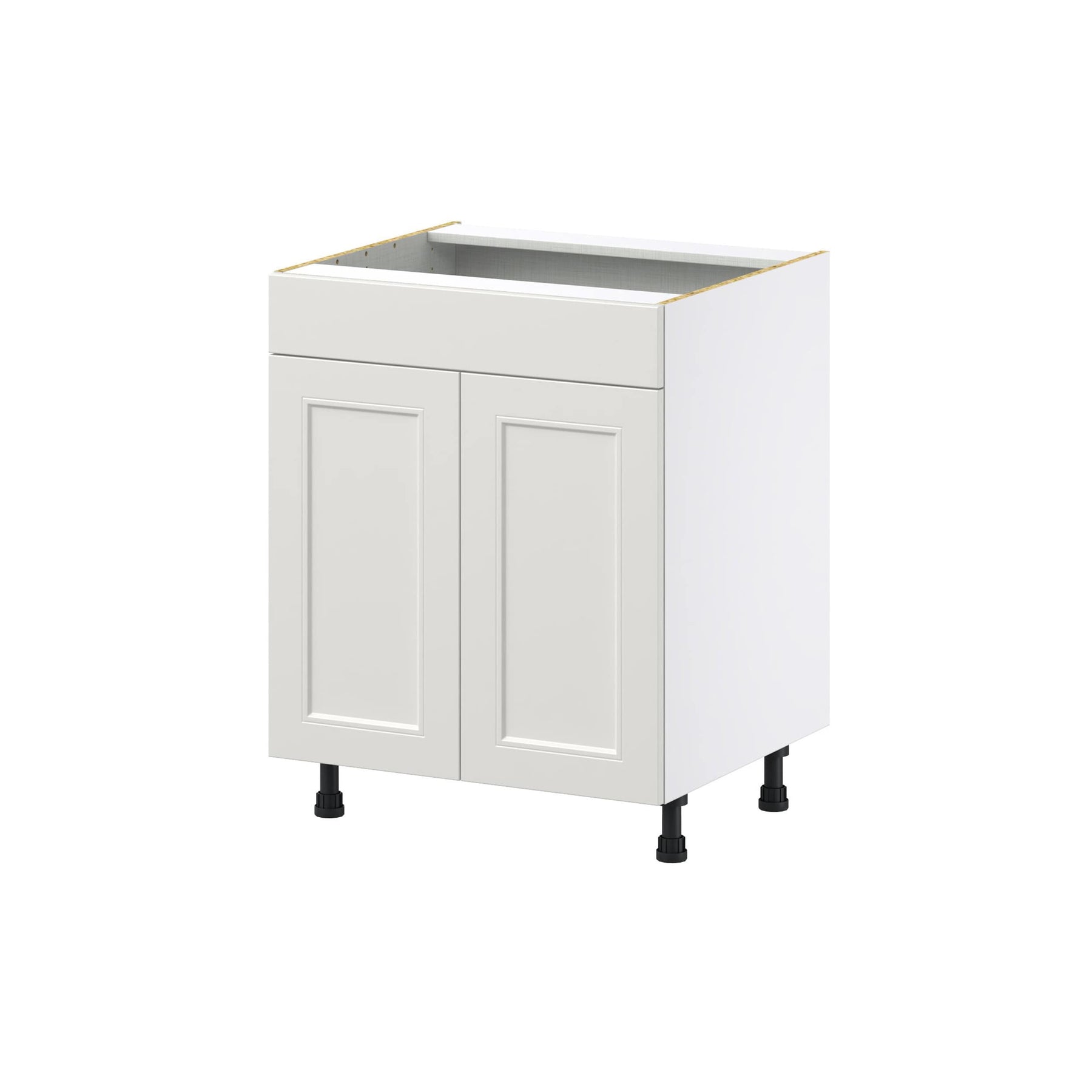 Elevate your kitchen with the Hugo&Borg Belcourt Gray Sink Base Cabinet, a fully assembled, space-maximizing solution. This elegantly crafted cabinet features a stunning recessed panel Shaker style with a silky smooth, painted light gray finish, offering durability and chic transitional design.