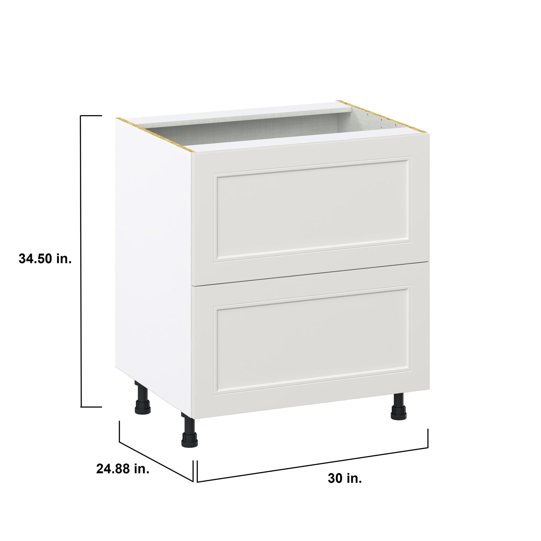 Maximize your kitchen's storage with the Belcourt 30" Gray 2-Drawer Base Cabinet by Hugo&Borg. This fully assembled cabinet offers sleek transitional design with a superior painted finish, ensuring durability and effortless style. Featuring European-style full access, it provides significantly more storage space, perfect for efficient organization.