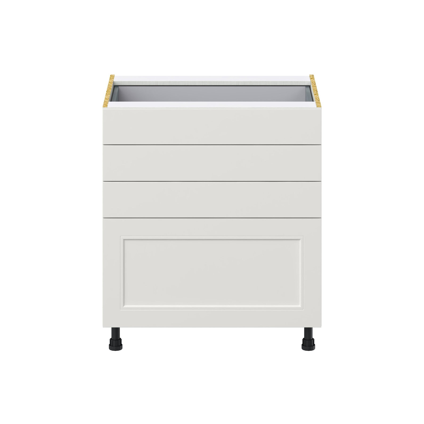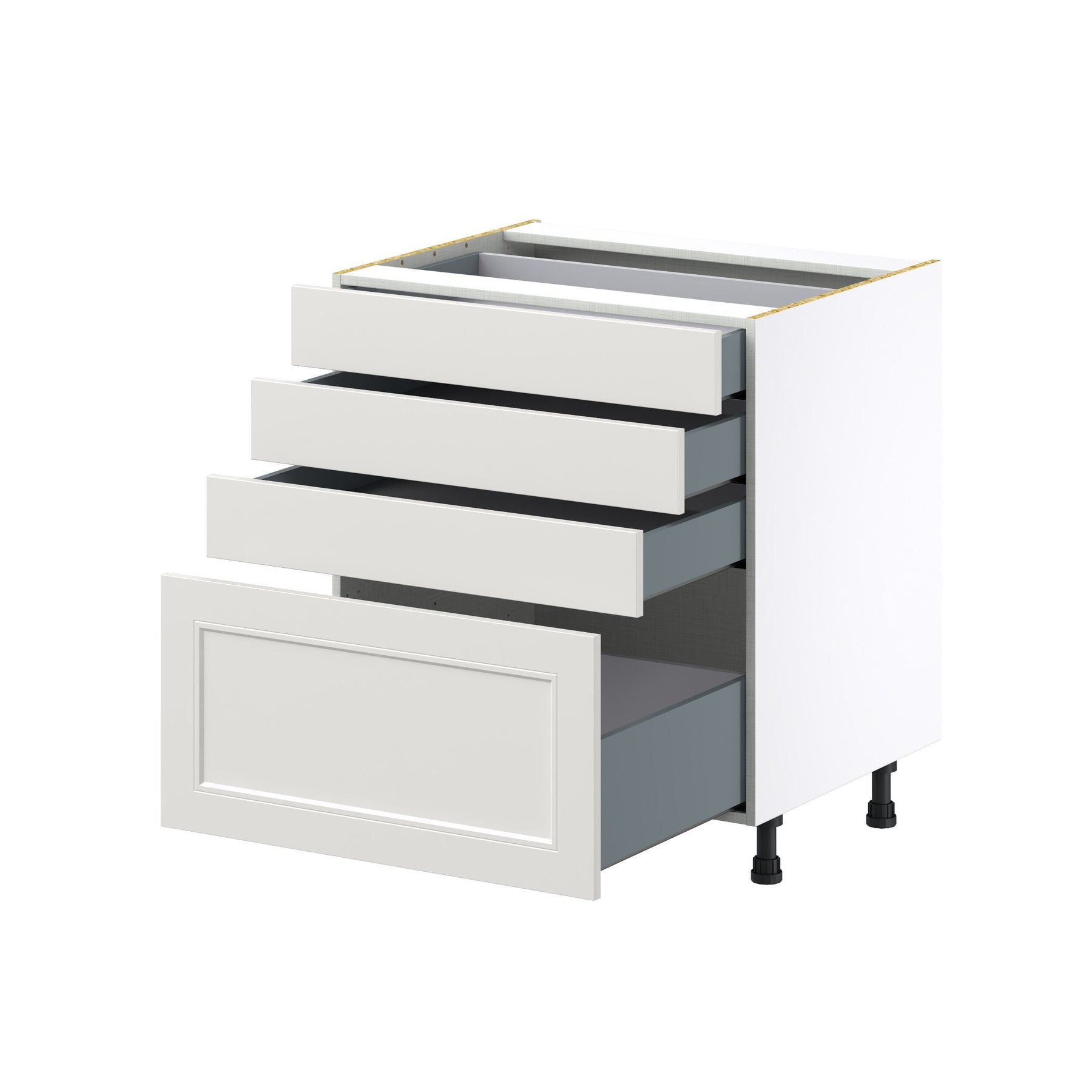 Elevate your kitchen with the Hugo&Borg Belcourt 30" Fully Assembled Cabinet, designed with a sleek recessed panel and painted in a classy light gray. This stylish 4-drawer base cabinet features top-notch European-style construction for substantial storage and is ready to install for instant sophistication and function.