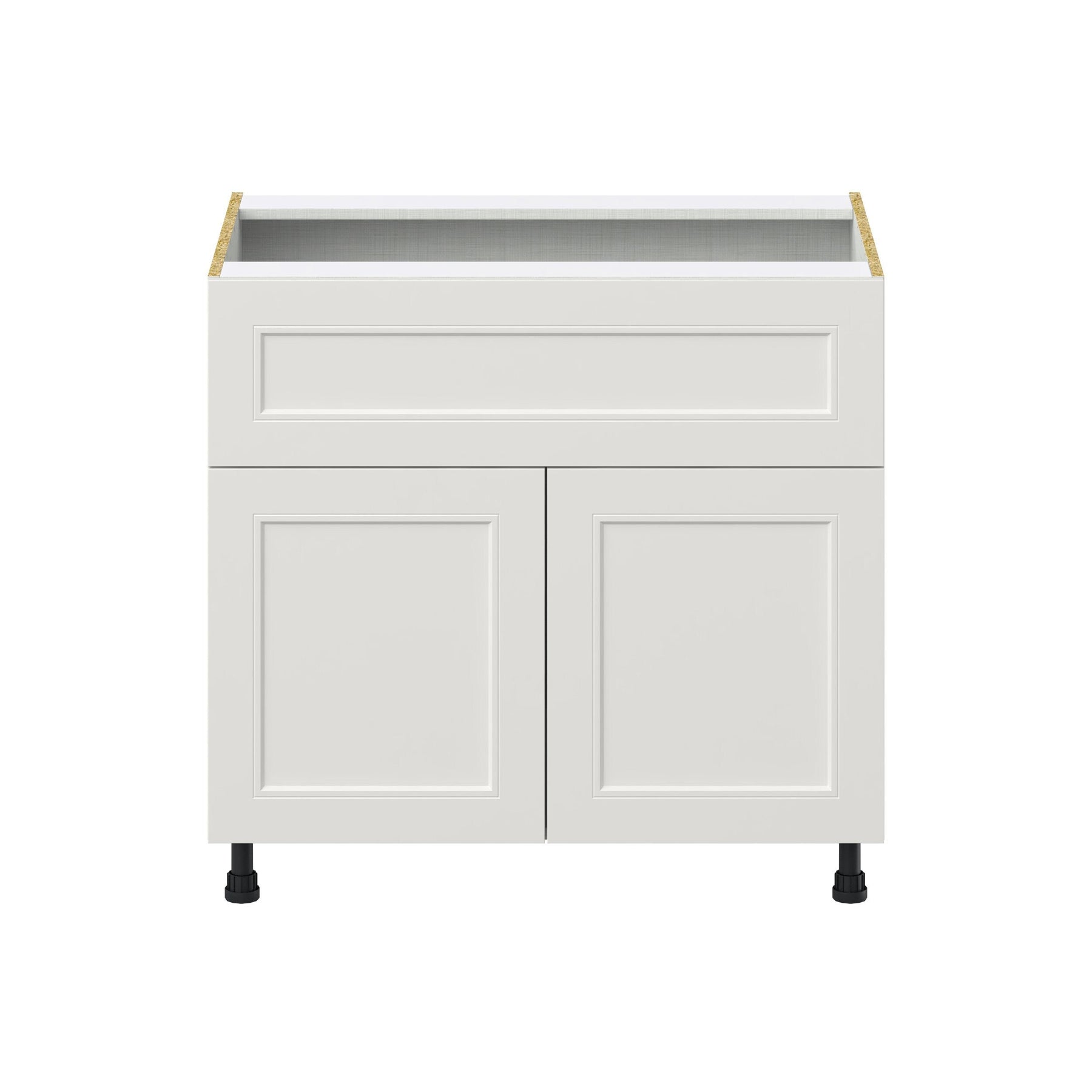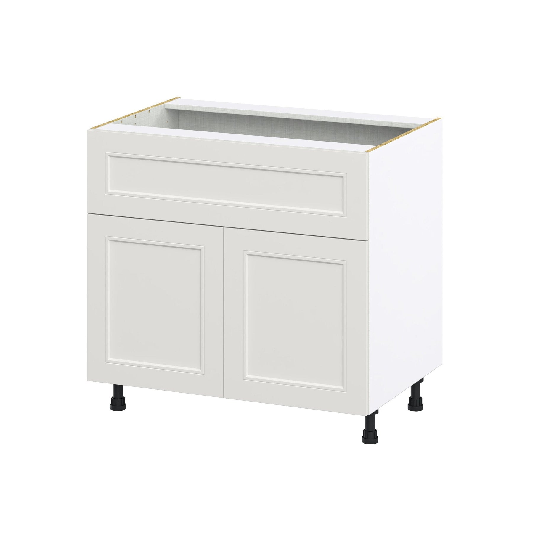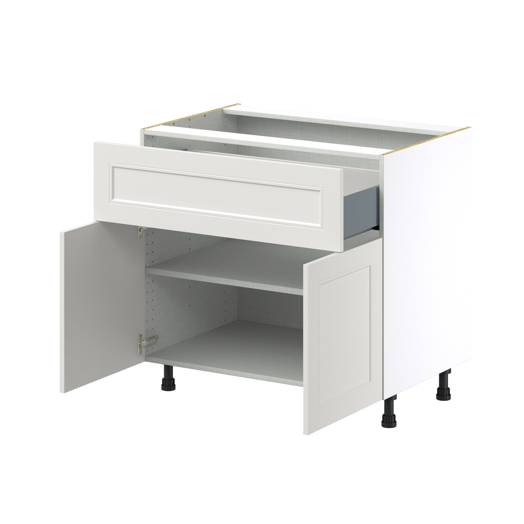 A: The Belcourt Base Cabinet arrives fully assembled, needing only placement and adjustments to the pre-installed adjustable legs for levelling.