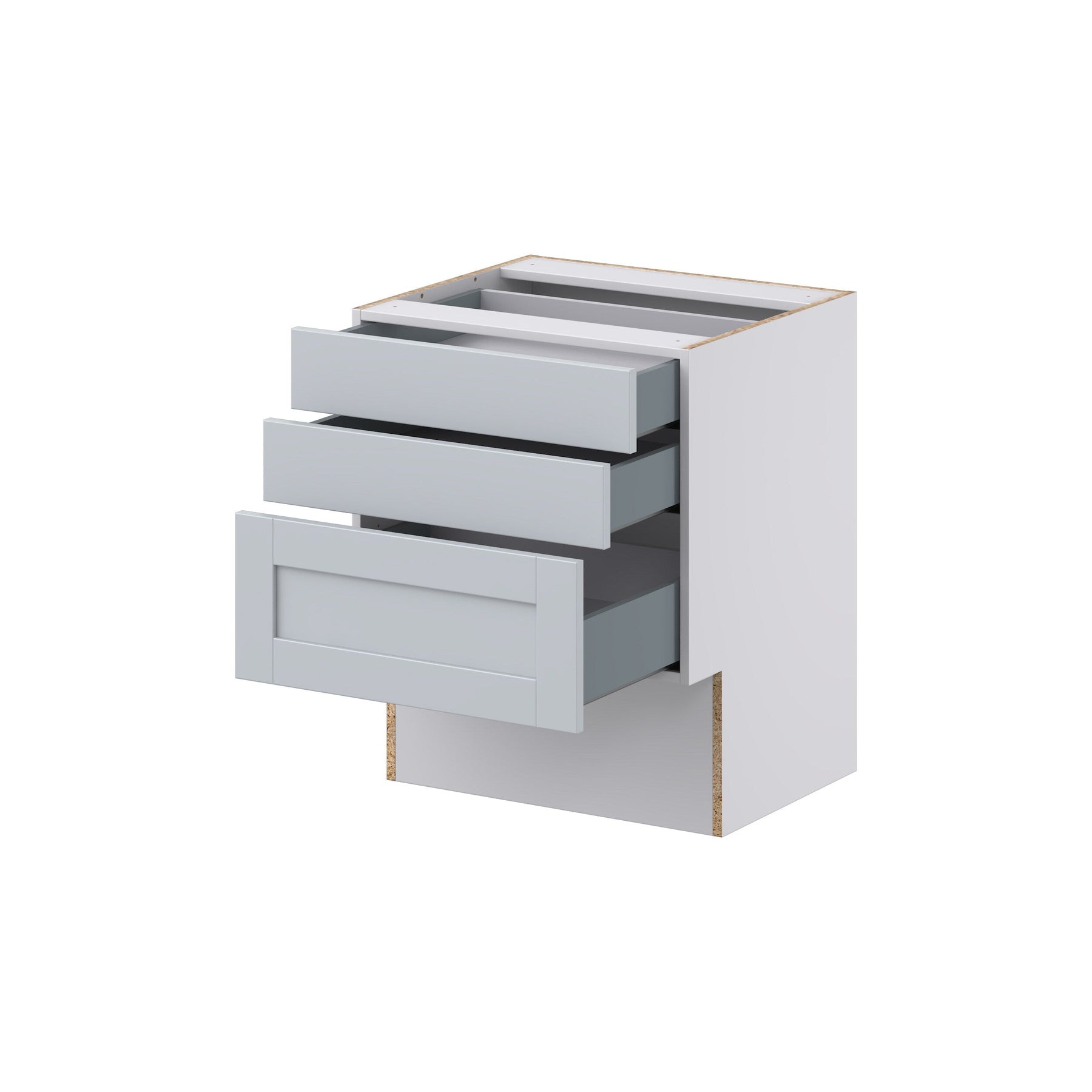 Enhance your kitchen or workspace with the Hugo&Borg Charlesberg 3-Drawer Base Cabinet, featuring a sleek recessed panel style in light gray. This elegant cabinet combines a frameless design for maximum storage with the convenience of soft-close drawers, ensuring both accessibility and style. Fully assembled with adjustable legs, it provides a hassle-free installation experience, perfect for pros and DIY enthusiasts alike.