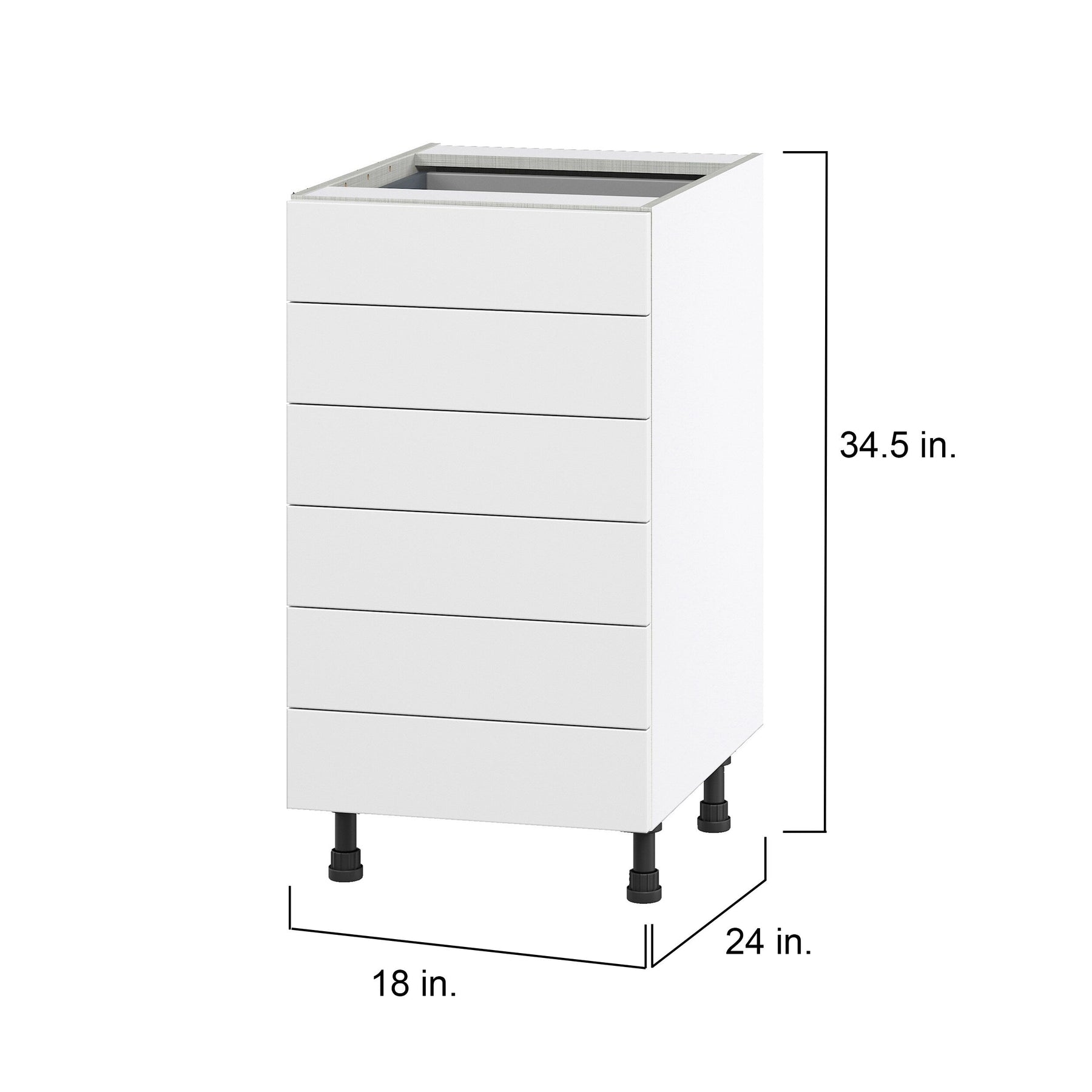 The Jolie 18-inch base cabinet is fully assembled and offers a sleek warm white finish, perfect for modern home improvement projects. Designed with a premium construction, it provides 20% more storage space and features soft-close drawers for a quiet, seamless experience.