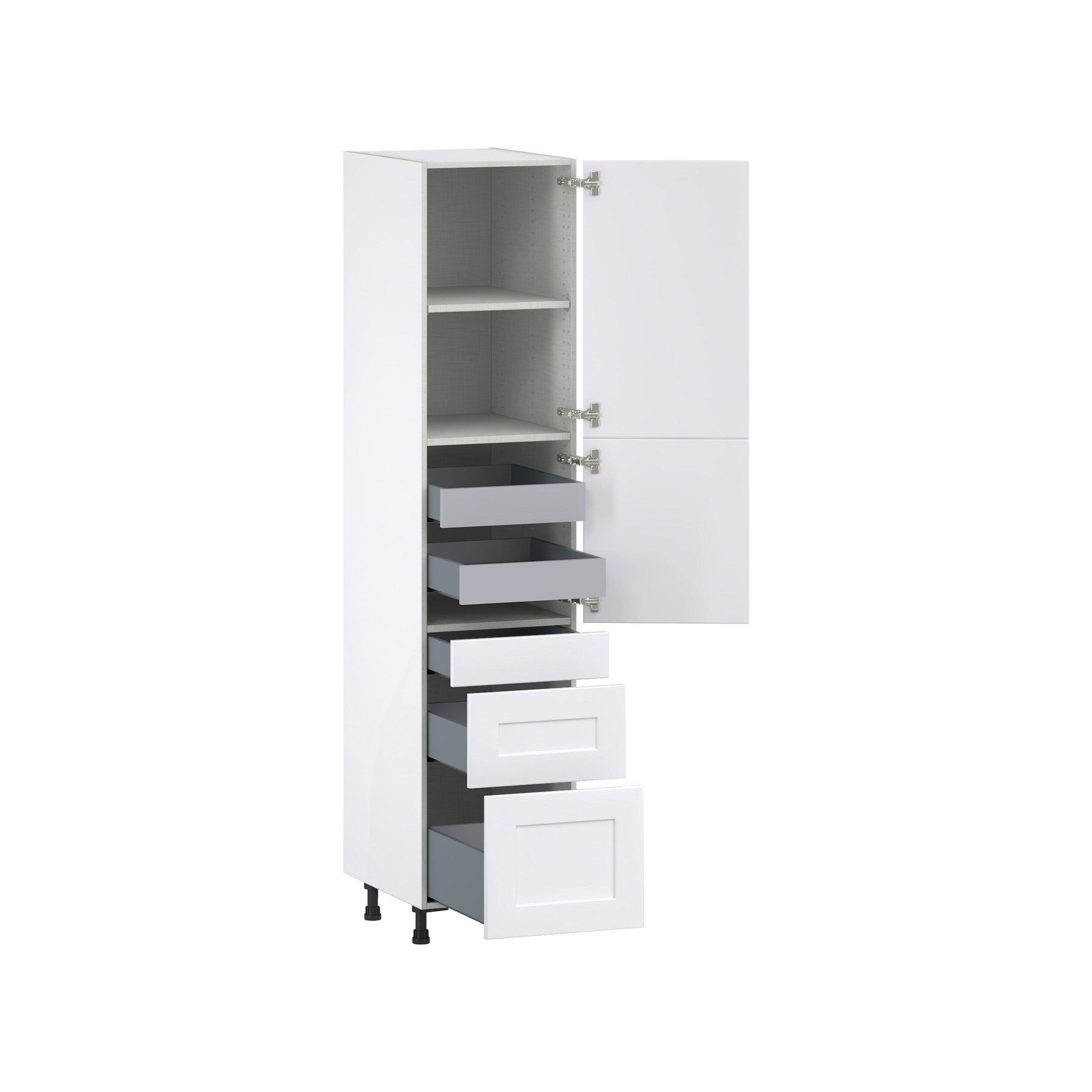 Transform your storage space with the Jolie 3-Drawer Pantry Cabinet, featuring a sleek flat panel Shaker style in a sophisticated warm white finish. This fully assembled cabinet combines modern functionality with traditional aesthetic, offering full access box construction for generous storage. Ideal for both pros and DIY enthusiasts, its soft-close features ensure a quiet, elegant kitchen.