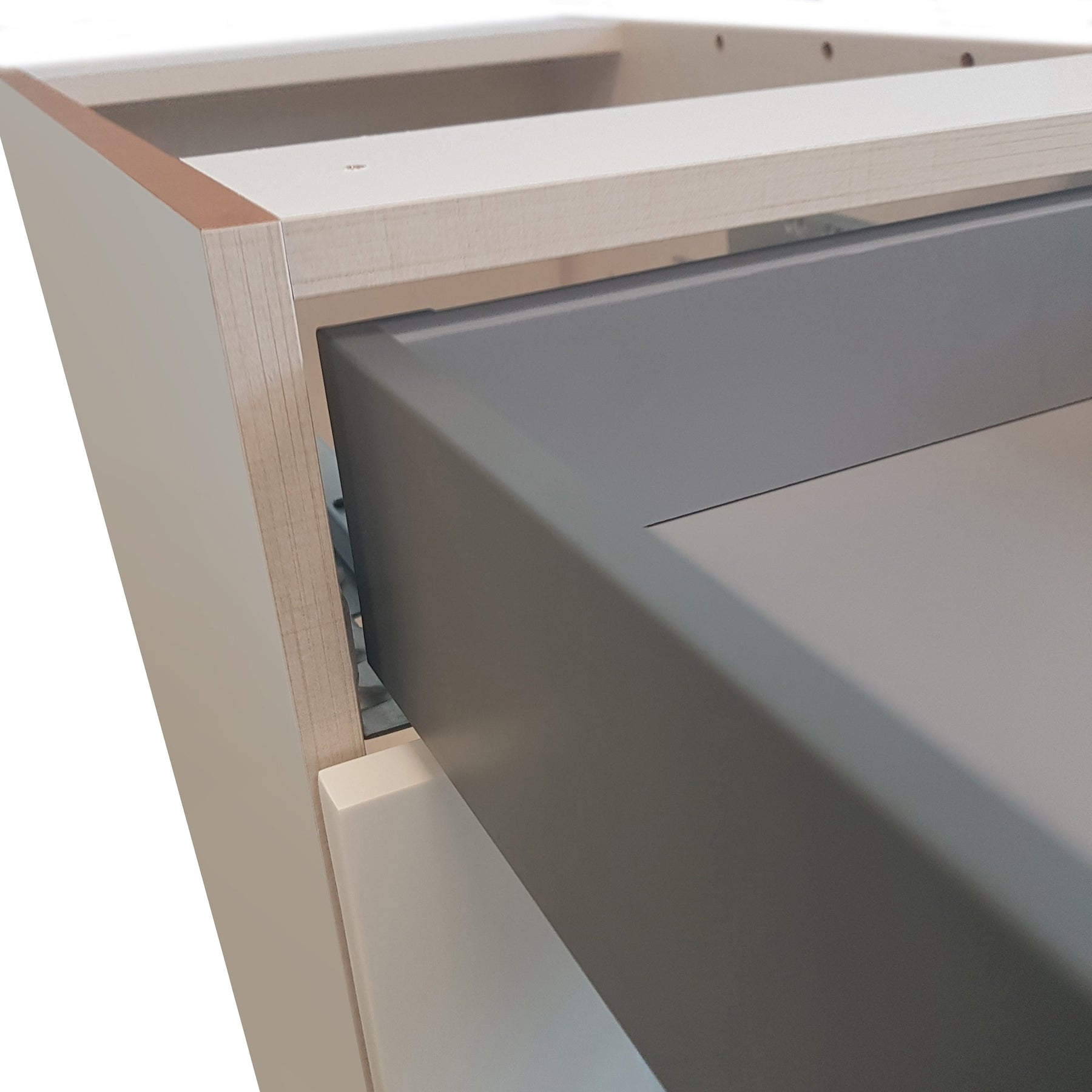 A: The soft-close metal drawers glide smoothly on full-extension tracks, preventing slamming and providing quiet, controlled closure.