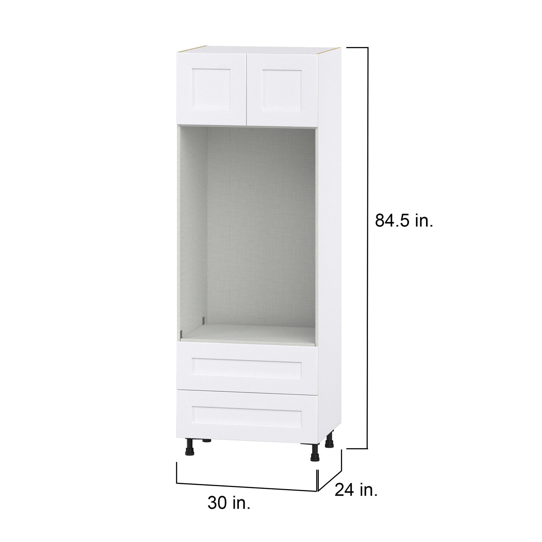 A: The cabinet measures 30 inches wide, 84.5 inches high, and 24 inches deep. It includes a dedicated cut-out specifically for a microwave or oven combo.