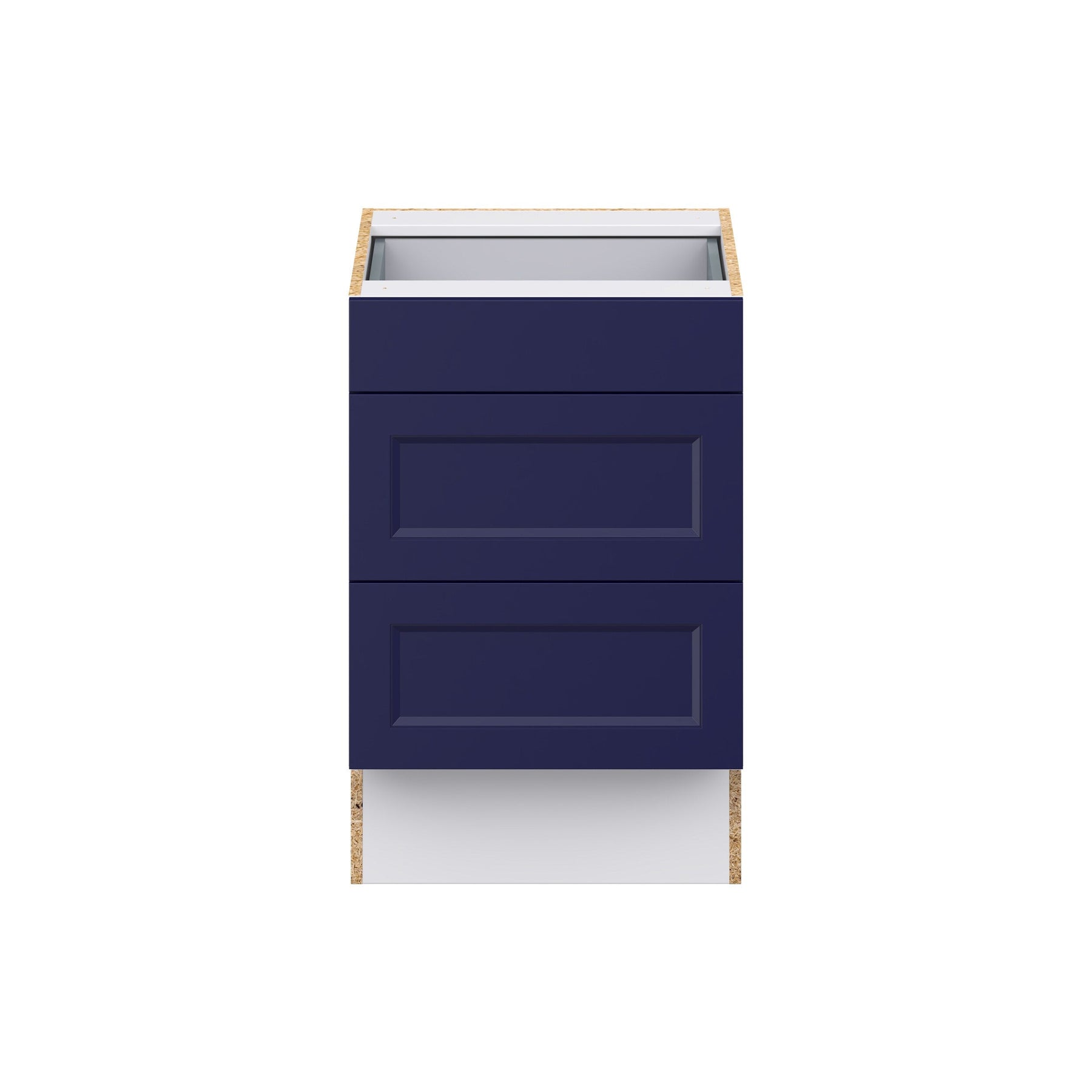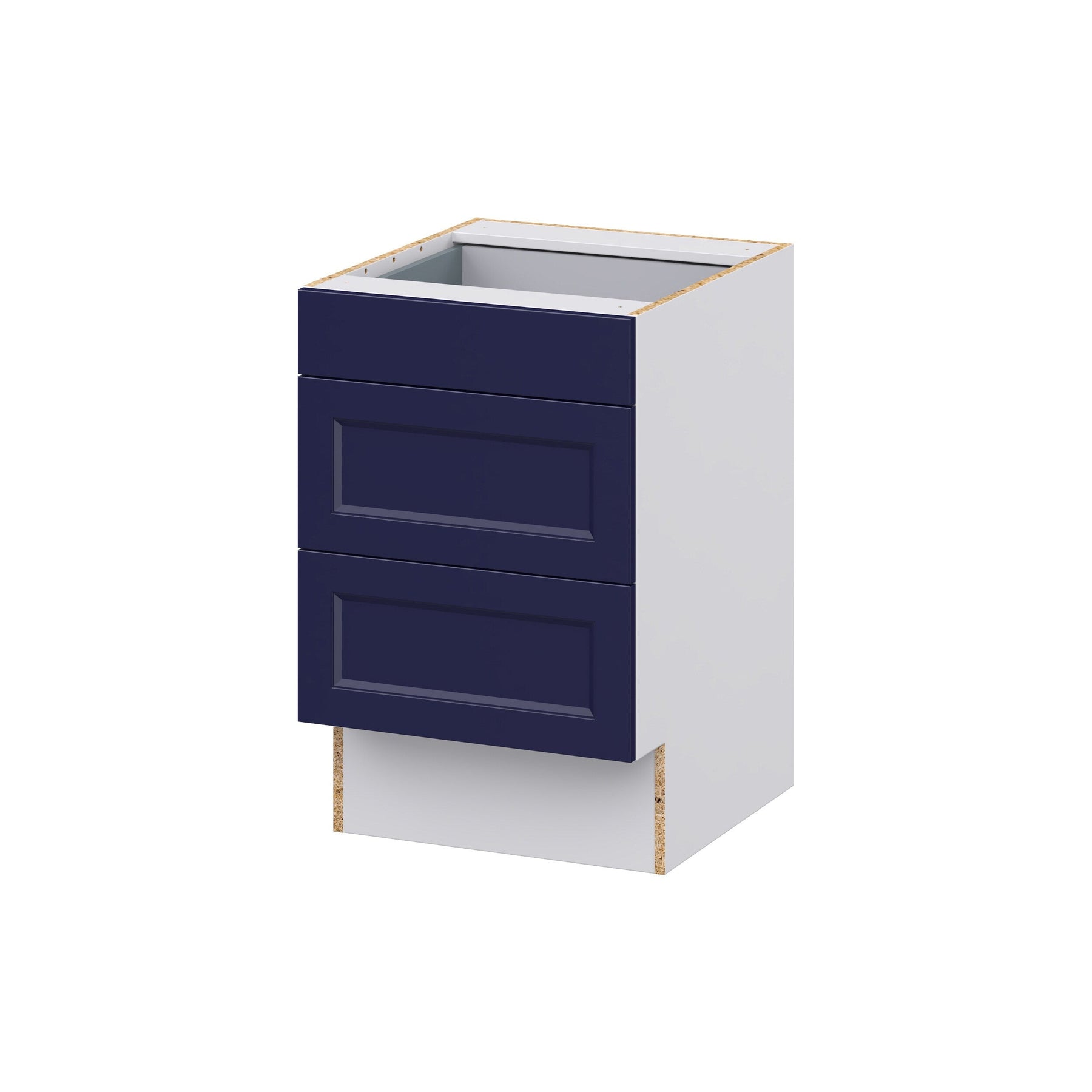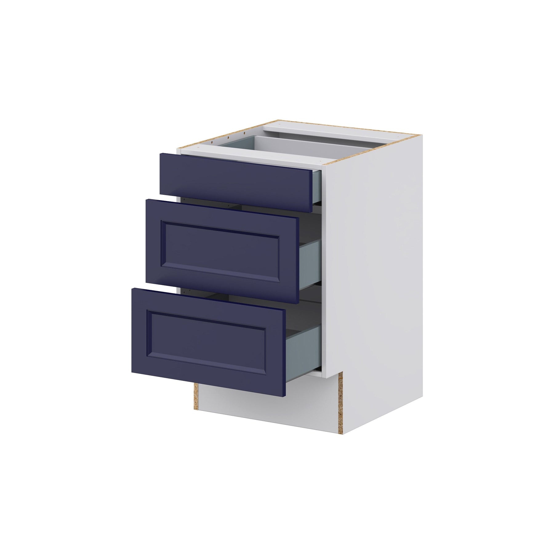 Elevate your storage with the Hugo&Borg Lorette Navy Blue 3-Drawer Base Cabinet. Featuring a chic recessed panel style and fully-assembled convenience, this piece combines superior utility with a designer aesthetic. Its durable construction is both scratch and moisture resistant, promising longevity in any home environment.