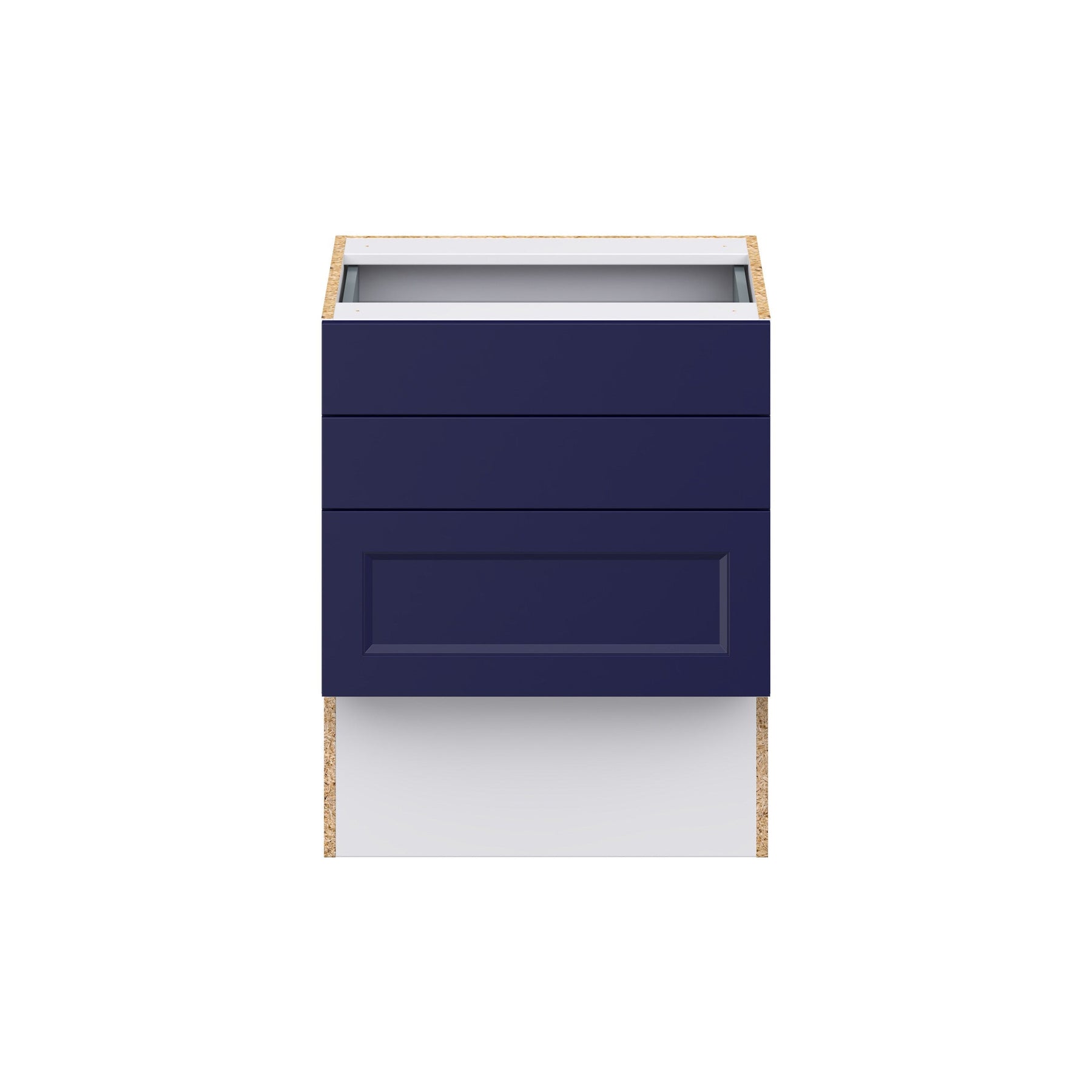 The Hugo&Borg Lorette cabinet exemplifies premium design and functionality with its navy blue finish and recessed panel style. This fully assembled, 3-drawer base cabinet provides full access thanks to its European frameless construction, making it an ideal choice for modern, sophisticated storage solutions in any contemporary kitchen or workspace.