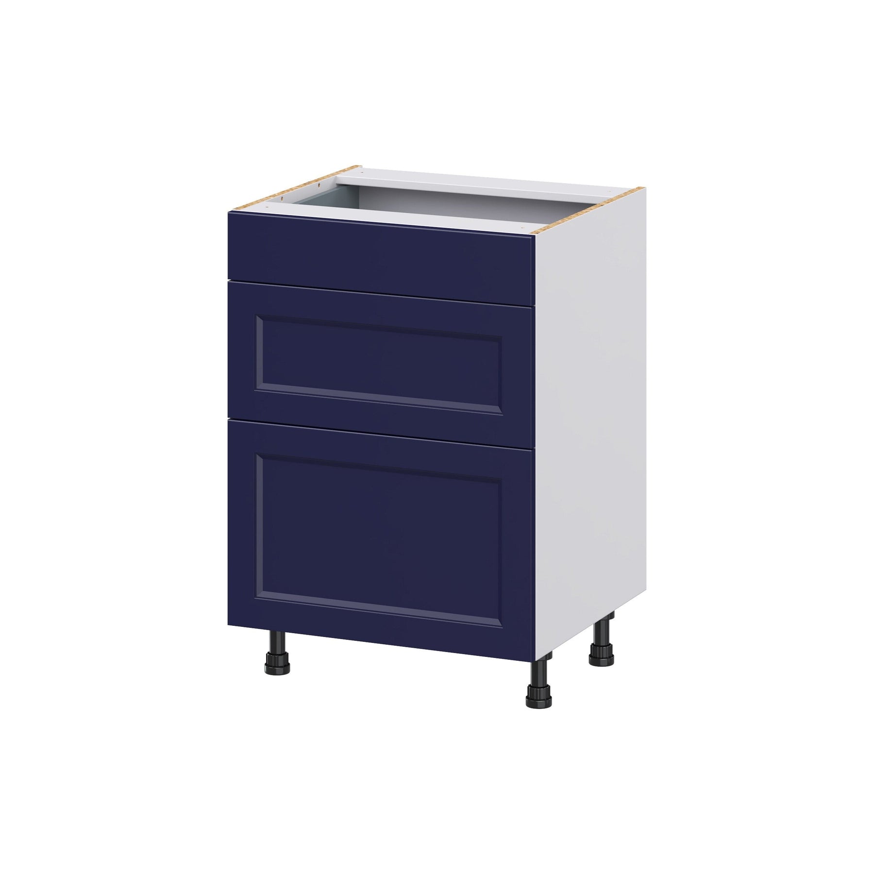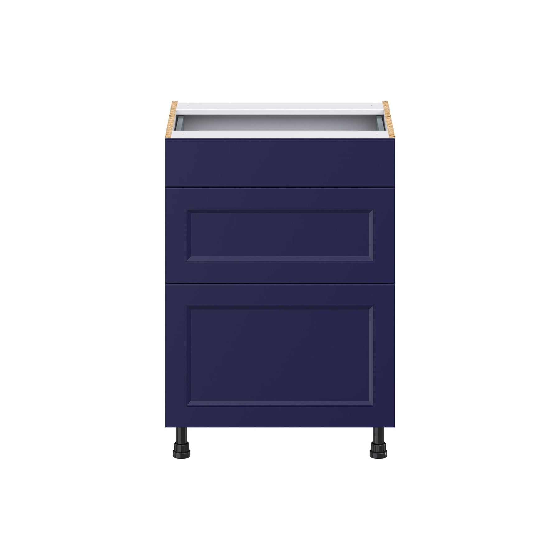 The Hugo&Borg Lorette Navy Blue 3-Drawer Base Cabinet combines elegant design with practical function, featuring a smooth, painted finish and recessed panel style. This fully assembled cabinet offers soft-close drawers with full-extension undermount slides, engineered for durability and ease of use. Ideal for creating a sophisticated look in any space, while providing exceptional storage capabilities.
