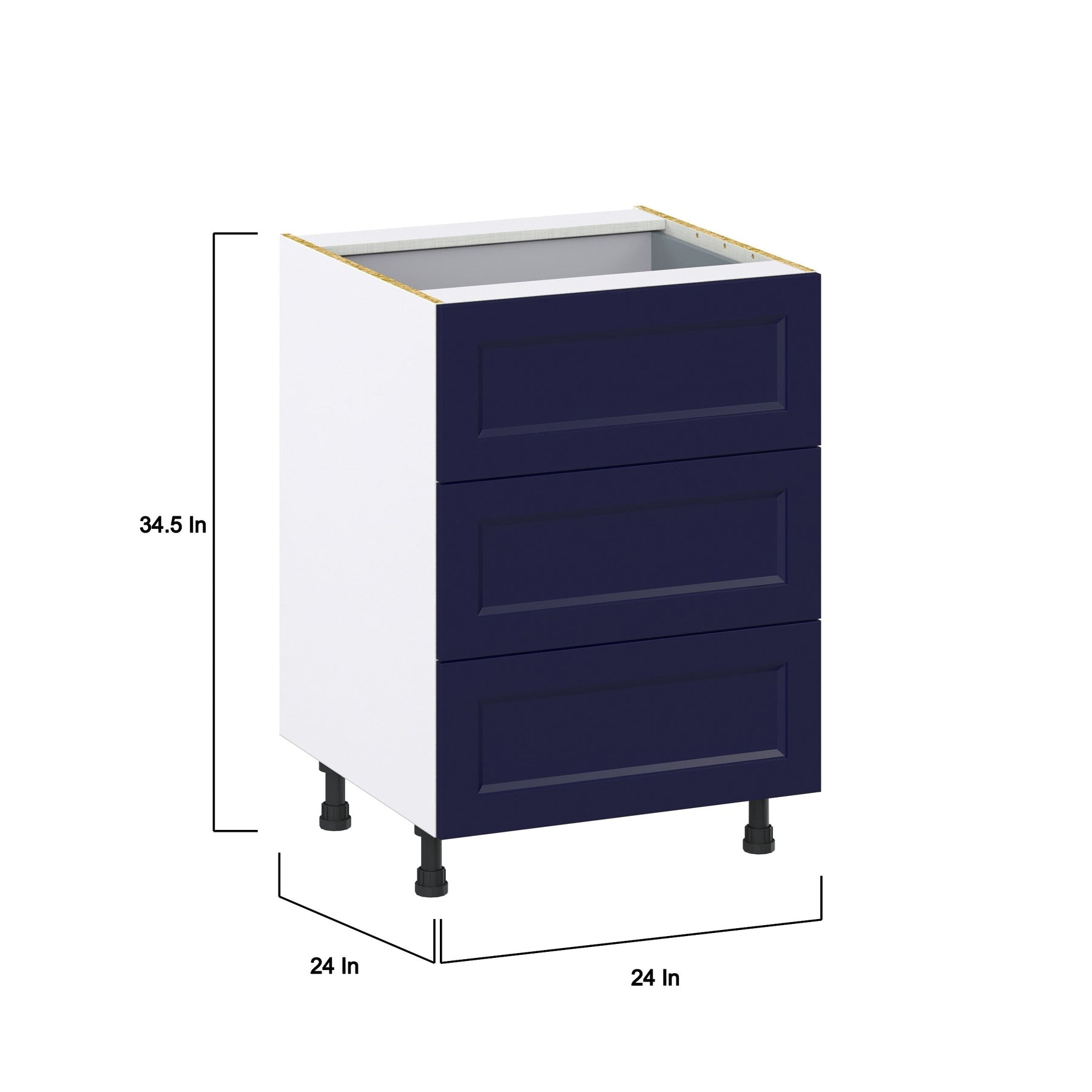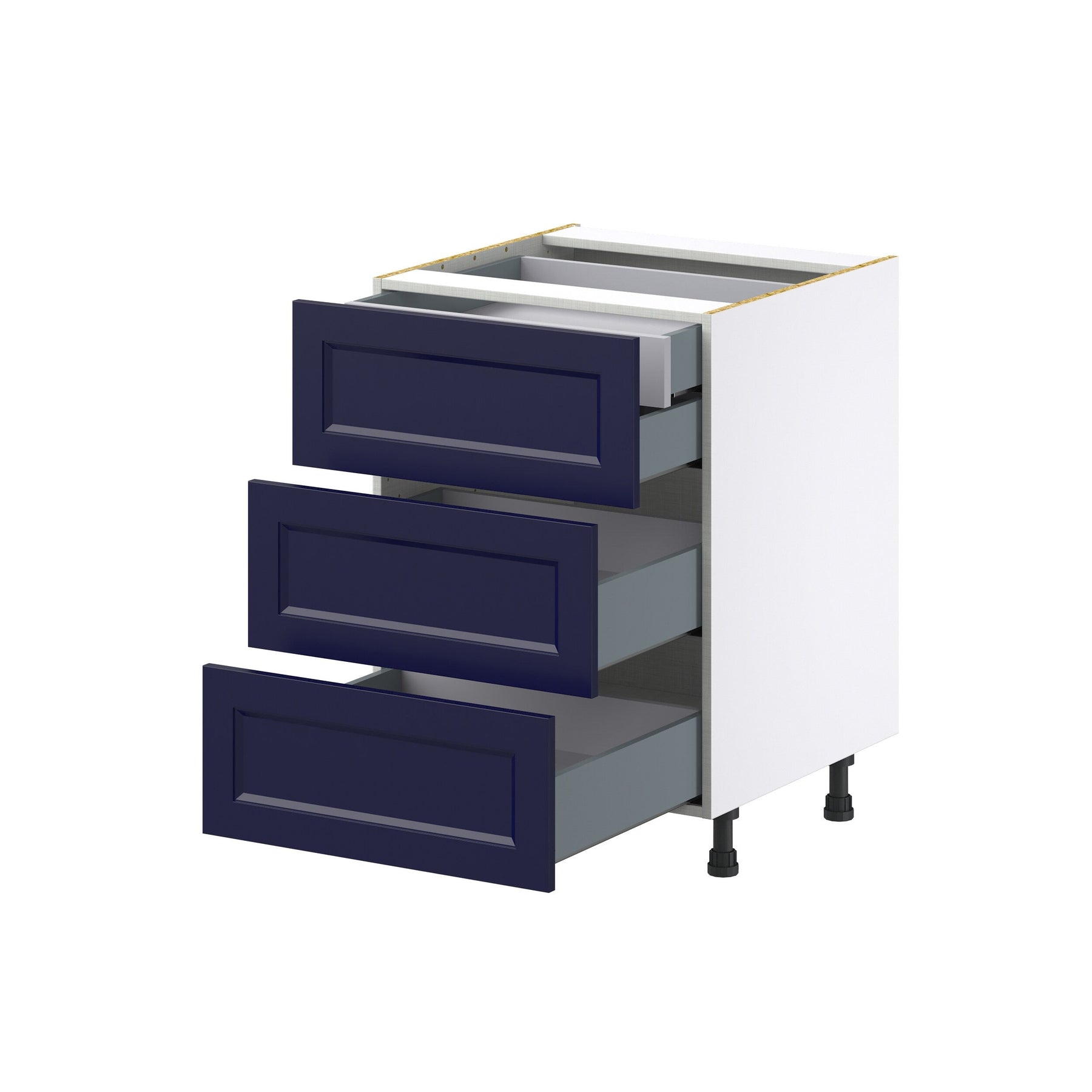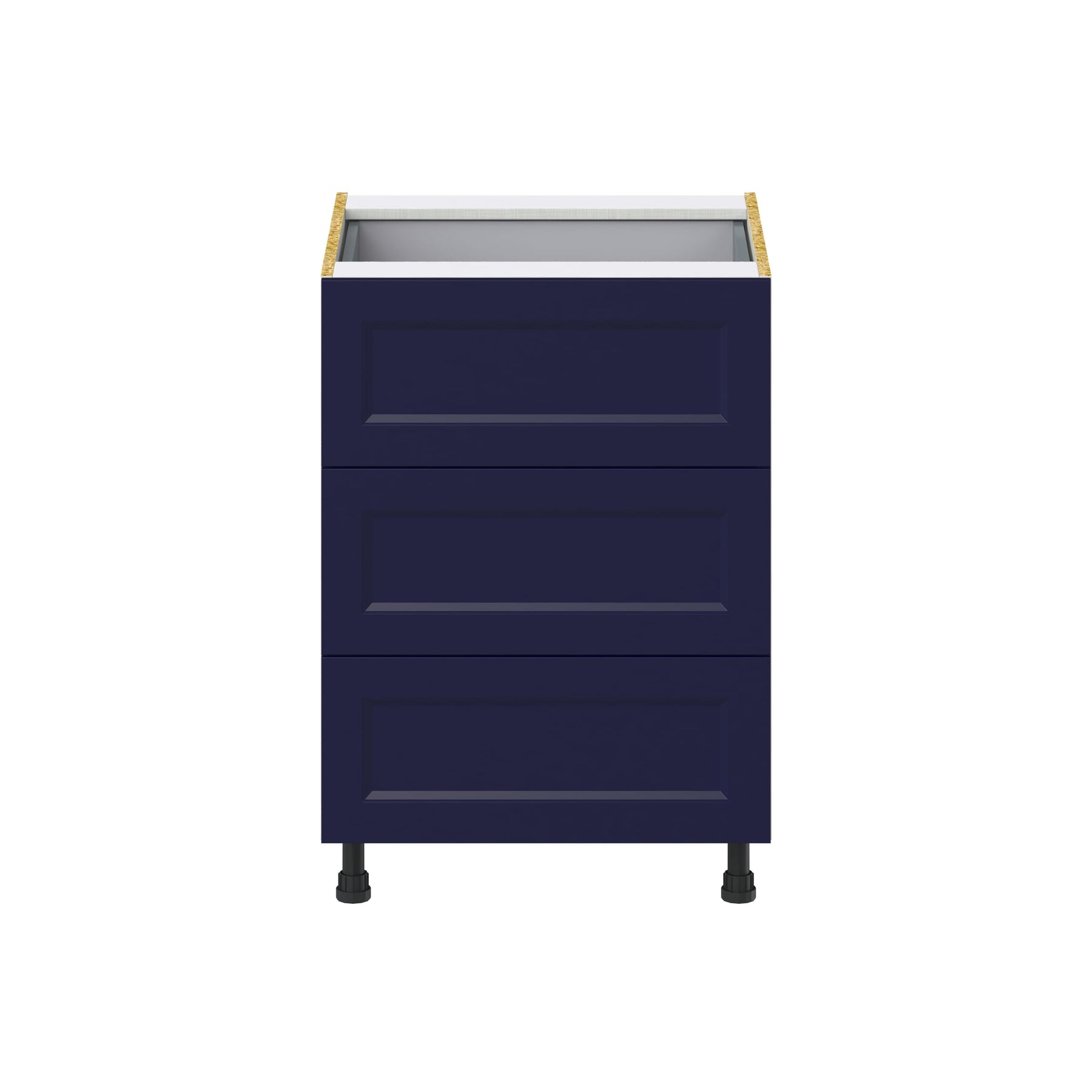 Elevate your kitchen design with the Hugo&Borg Lorette 3-Drawer Base Cabinet. This fully assembled piece combines classic shaker styling with a rich navy blue finish, delivering both elegance and functionality. Its full-access construction maximizes storage, while soft-close drawers provide smooth operation.