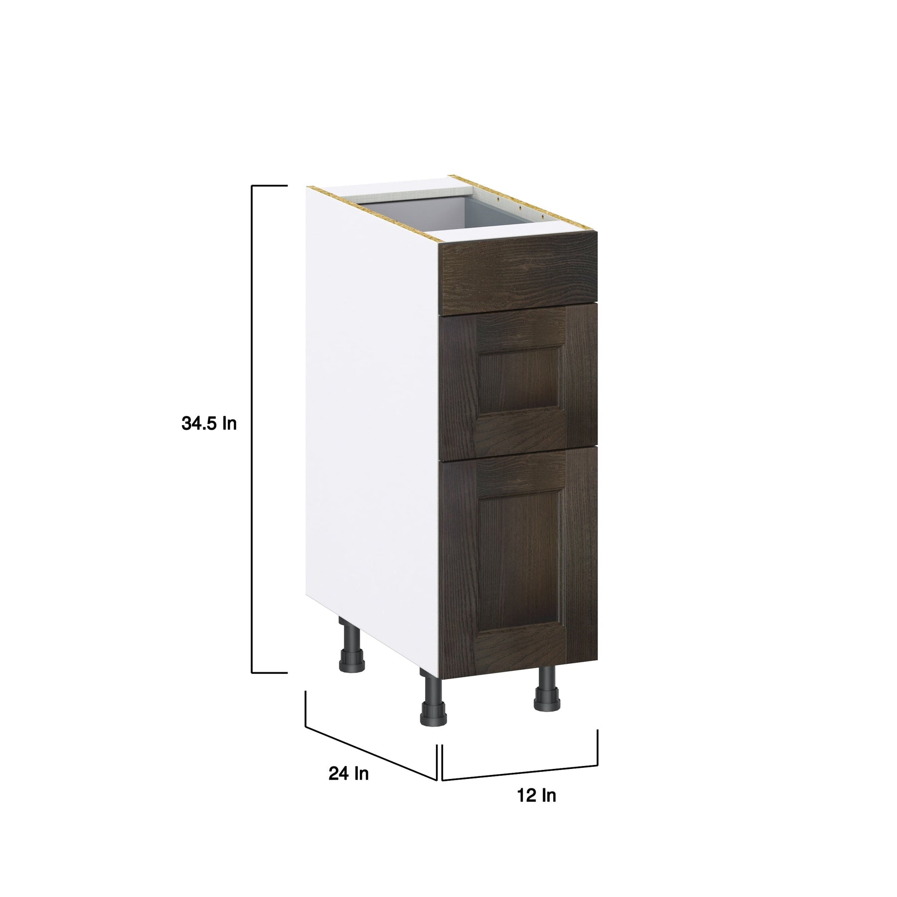 The Hugo&Borg Montclaire 3-Drawer Base Cabinet offers superior functionality with a sleek, transitional design. Made from durable engineered wood with a solid ash door frame, this fully assembled cabinet features soft-close drawers and a polished recessed panel style. With its deep smoky color and modern linen interior, this piece is both aesthetically pleasing and highly useful.