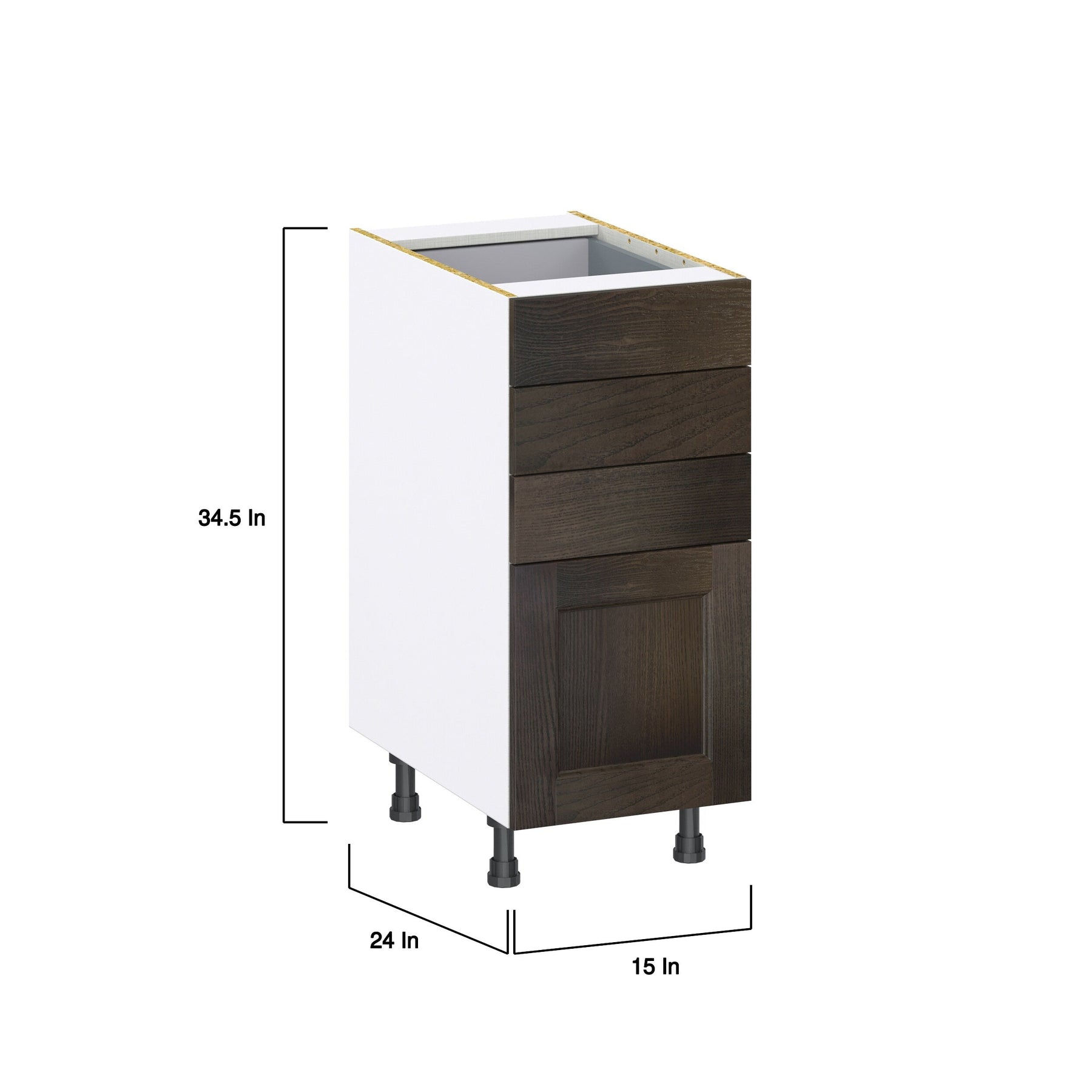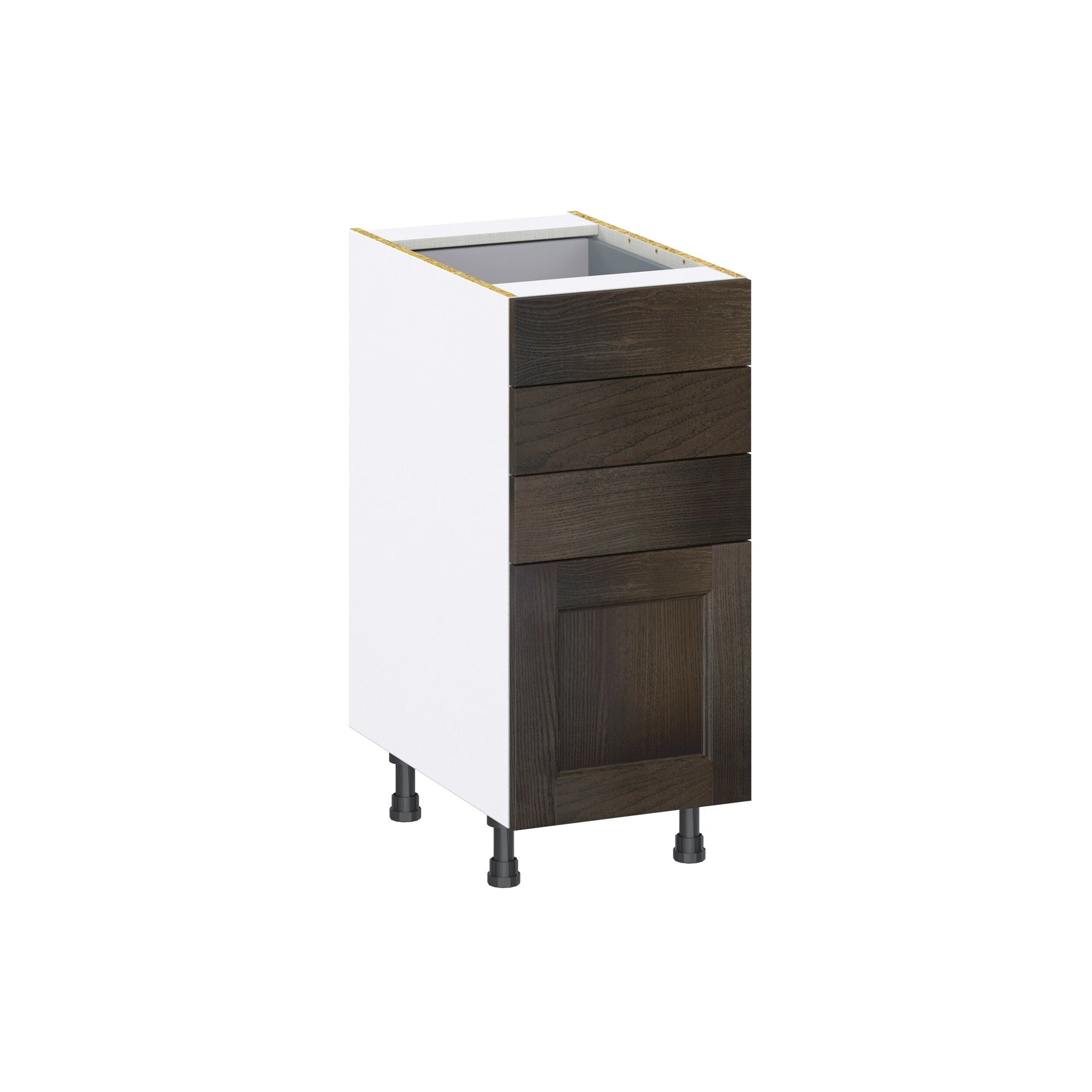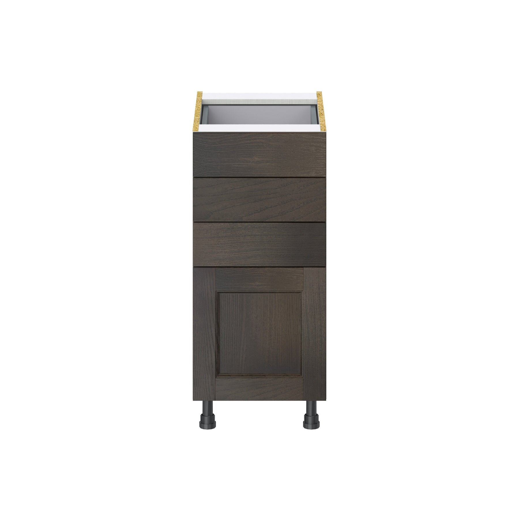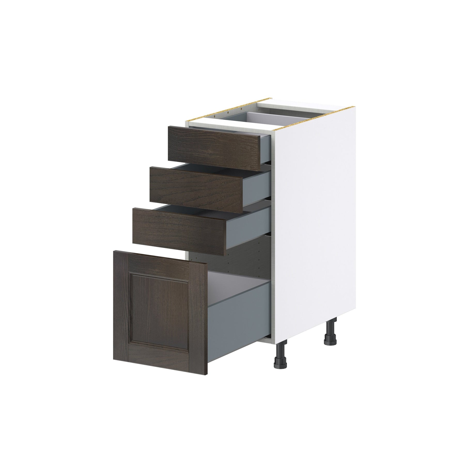 Elevate your kitchen or bath with the Montclaire 4-Drawer Base Cabinet. Expertly crafted with a solid ash door frame and full-extension soft-close drawers, this cabinet offers durability and sophisticated style. Designed for seamless integration, its deep smoky finish and modern linen interior provide both function and elegance to any space.