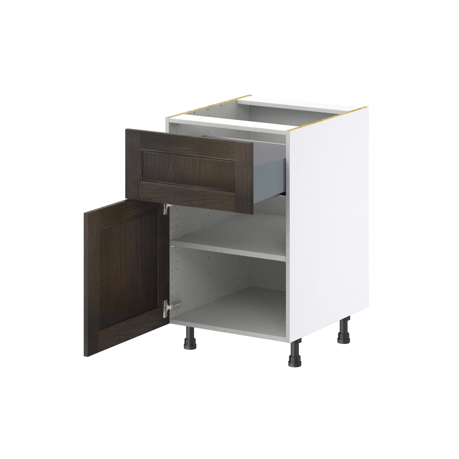 A: The cabinet includes premium soft-close doors and drawers with full-extension undermount glides for quiet, smooth operation.