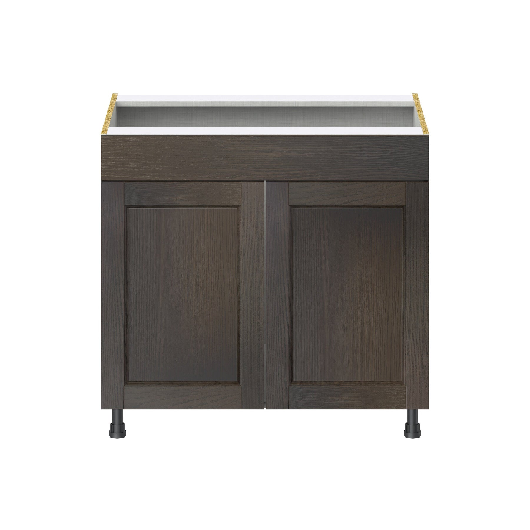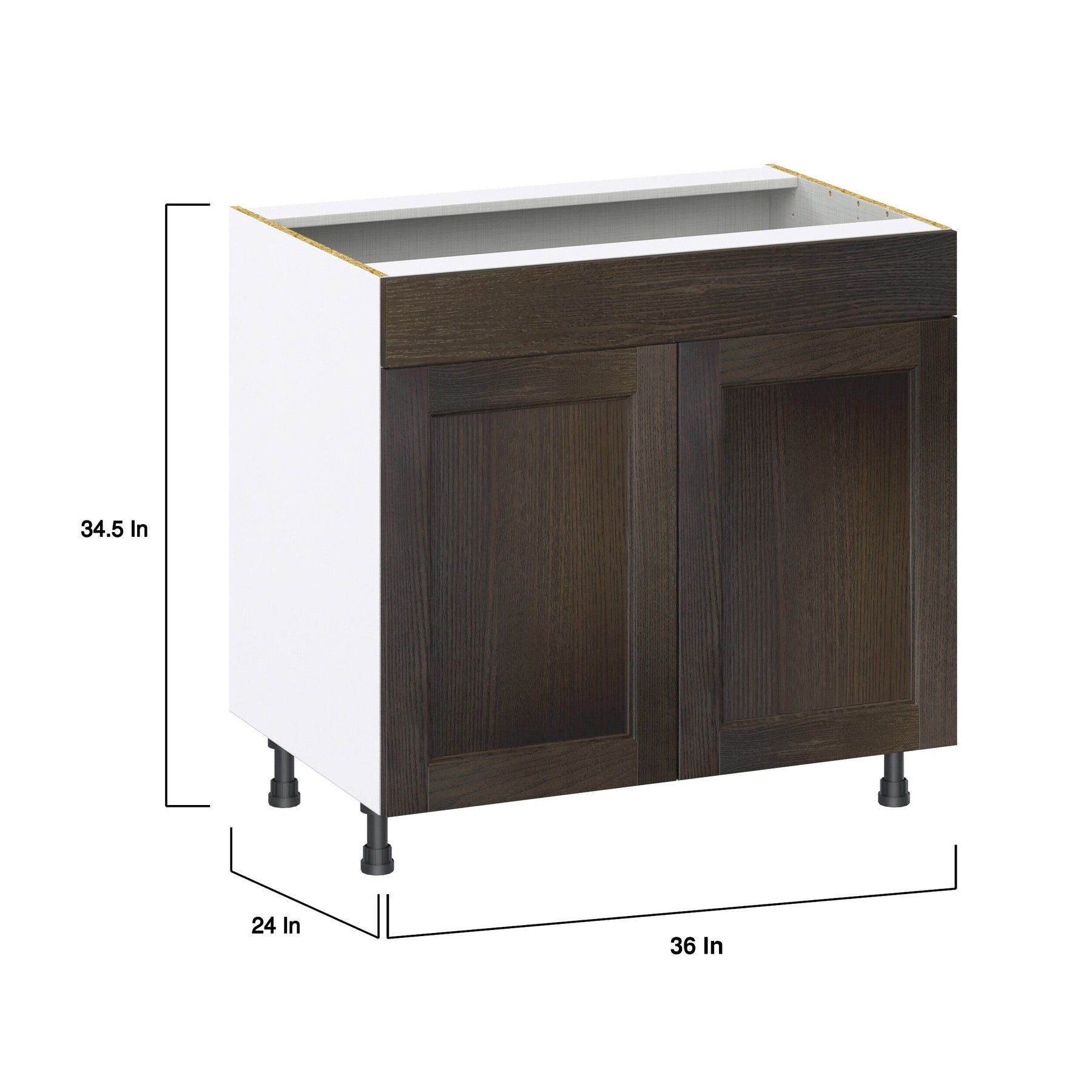 The Montclaire 36-inch base cabinet by Hugo&Borg combines timeless Shaker style with modern convenience, offering exceptional storage and contemporary aesthetics. Fully assembled and featuring soft-close doors, this cabinet is crafted from durable engineered wood and finished in a deep, smoky stain for a rich look.