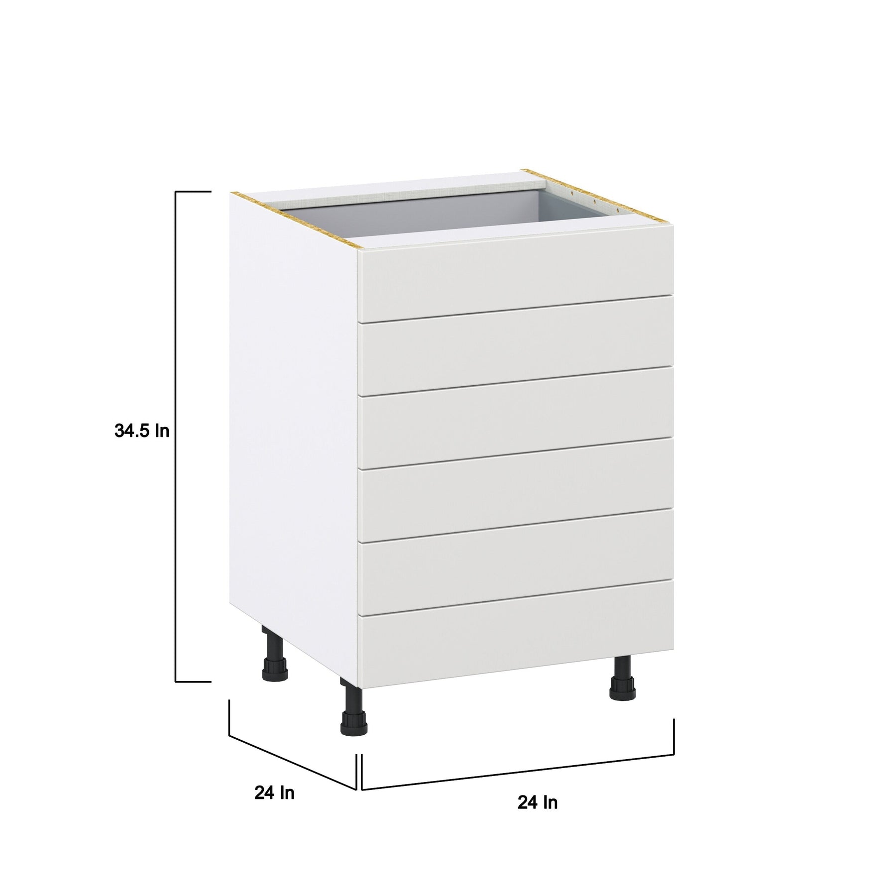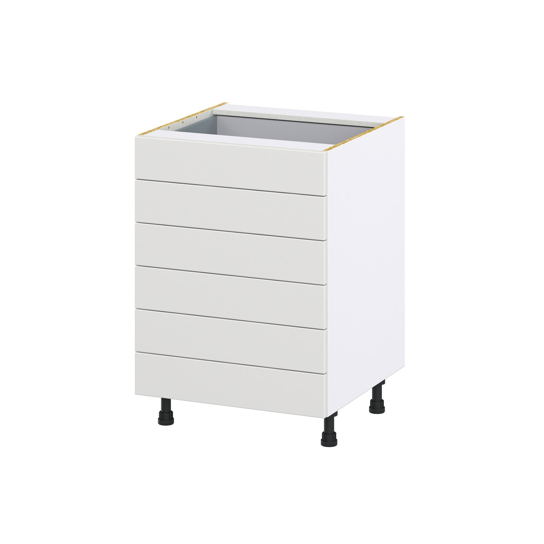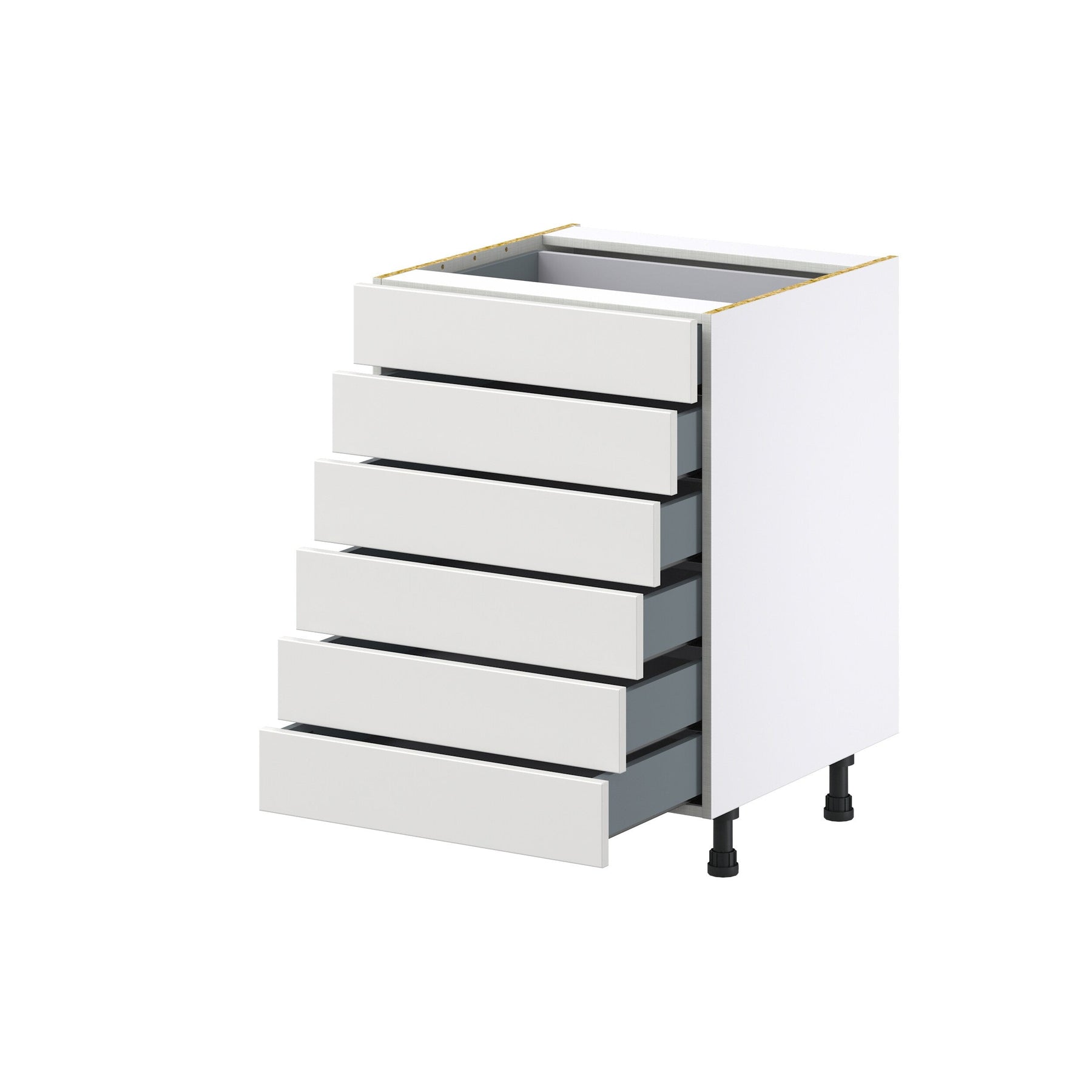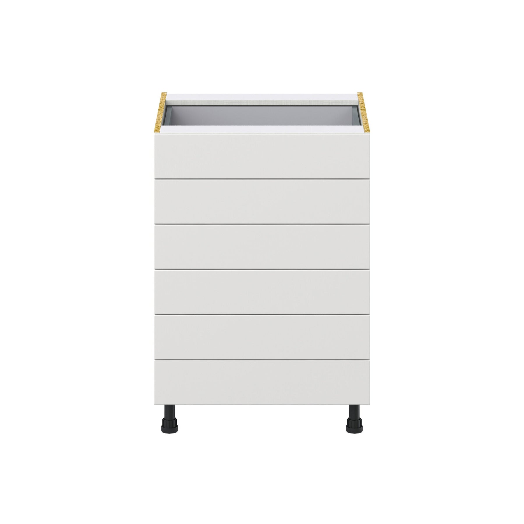 Enhance your kitchen with the Hugo&Borg Riviera 6-Drawer Base Cabinet in a sophisticated bright white finish, offering premium style and storage solutions. The cabinet's full access box construction provides ample space with an elegant and durable design, making it an ideal choice for those seeking both aesthetics and function.