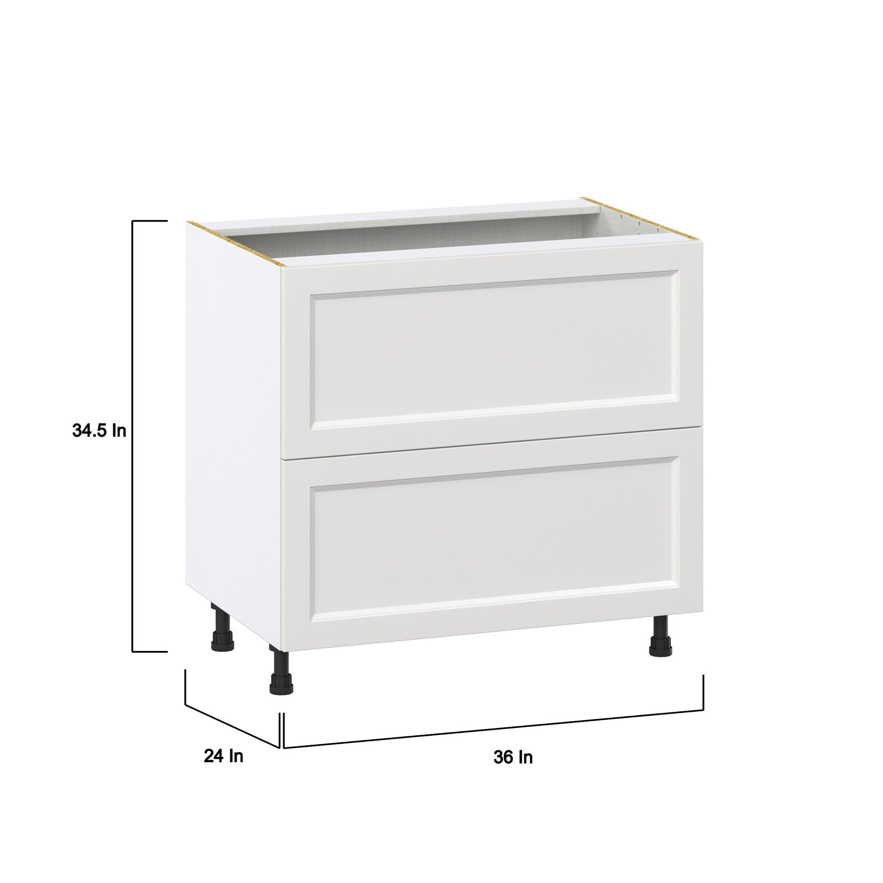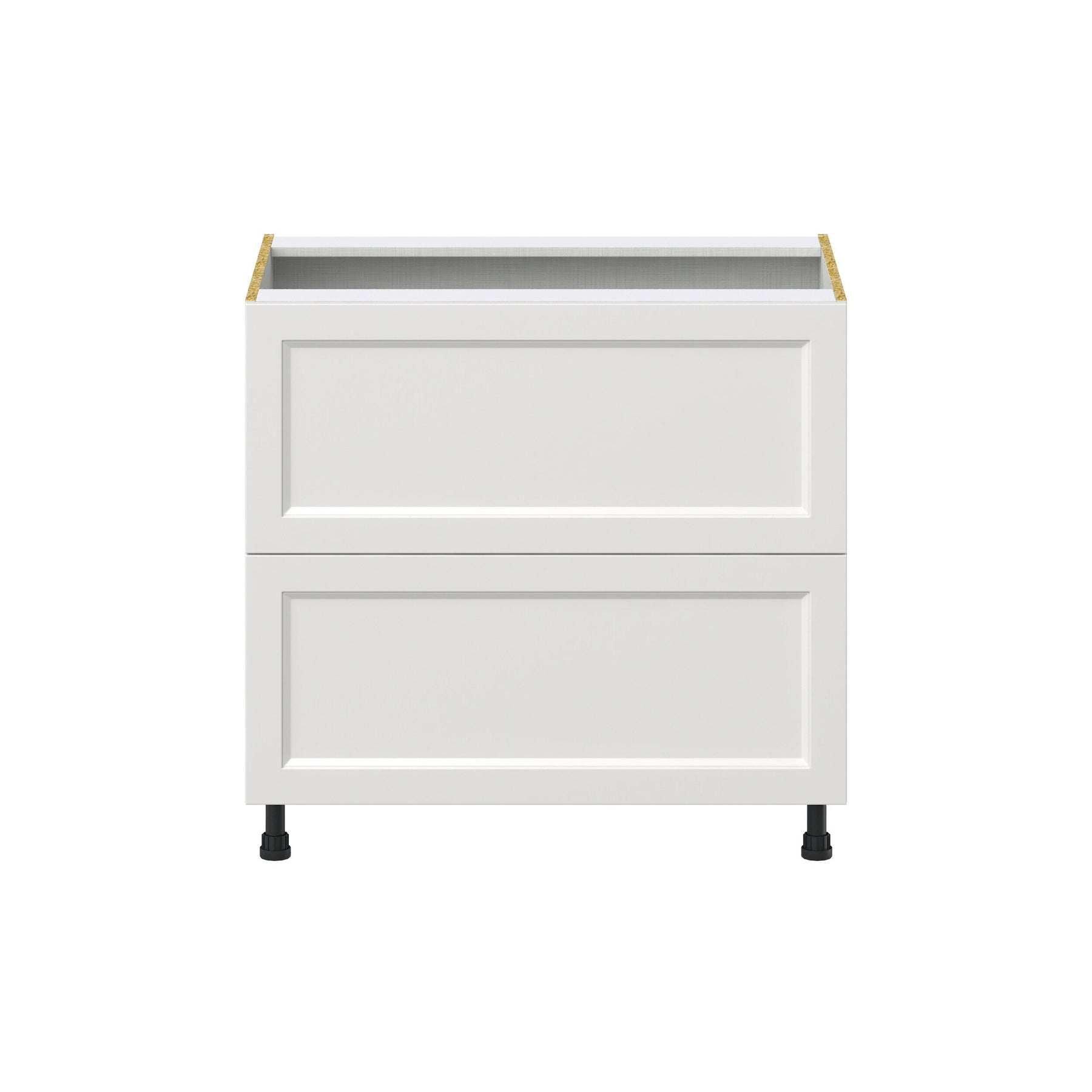 The Hugo&Borg Riviera 36-inch 2-Drawer Base Cabinet offers a modern, high-end look with its bright white finish and transitional shaker style. Fully assembled and crafted from durable materials, this cabinet provides robust storage with a sleek design that enhances any kitchen or workspace.