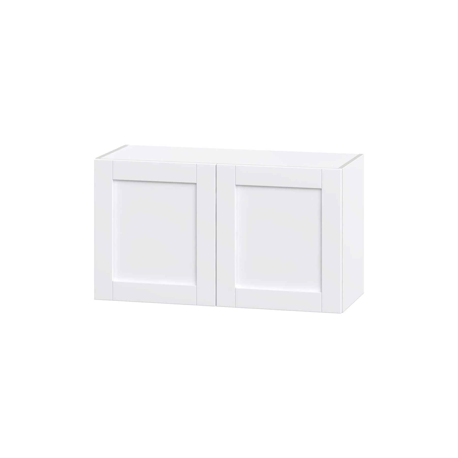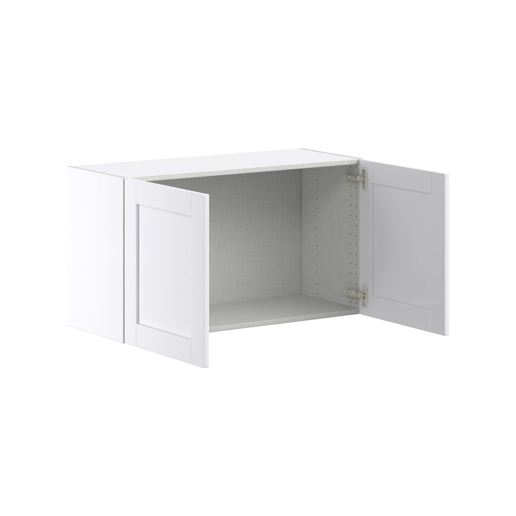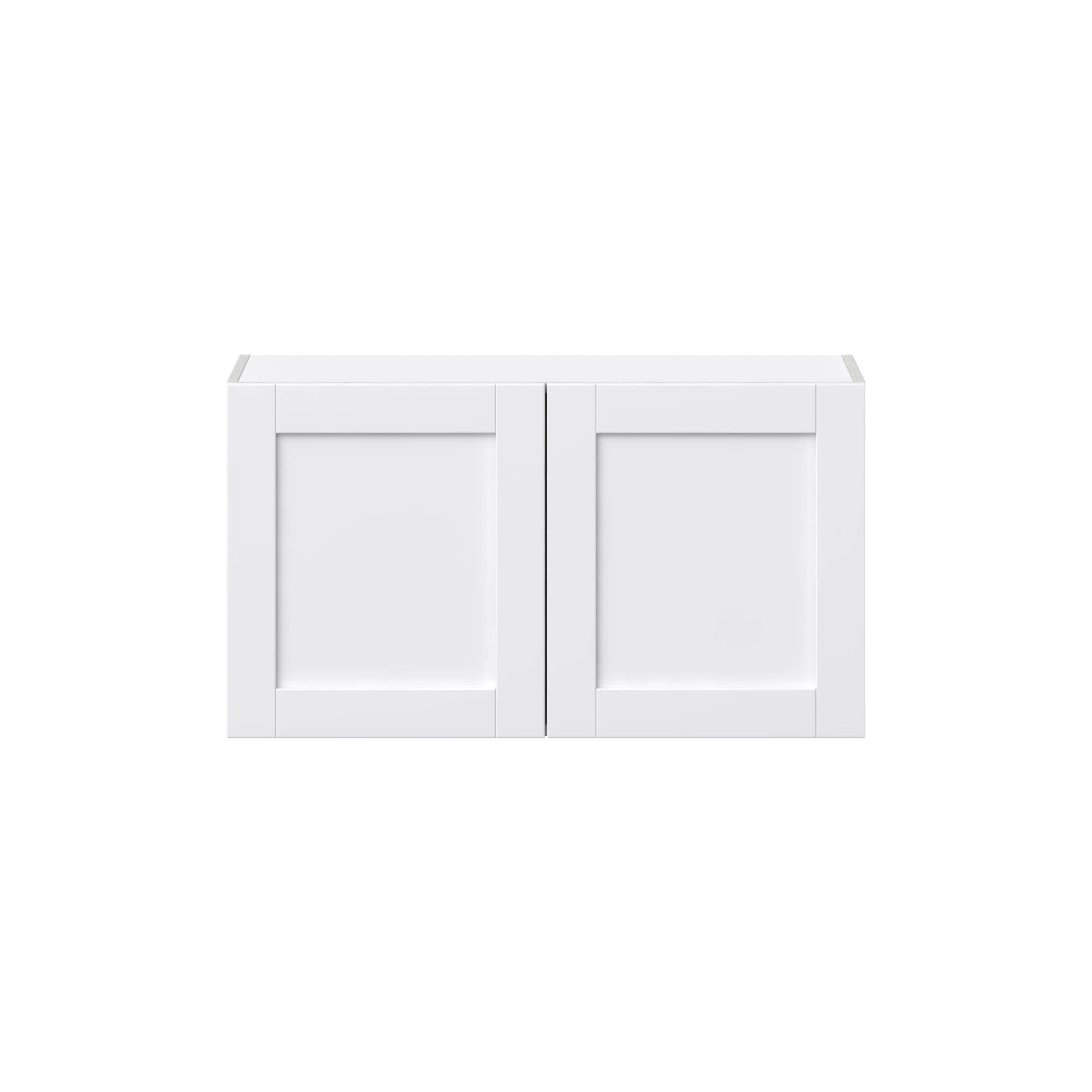 Enhance your kitchen with the Hugo&Borg Rosemont 36-in Glacier White Wall Cabinet, featuring a sophisticated flat panel Shaker door style. Known for its durability and scratch-resistant finish, this fully assembled cabinet offers 20% more storage with its innovative design and premium soft-close doors, delivering both style and functionality.