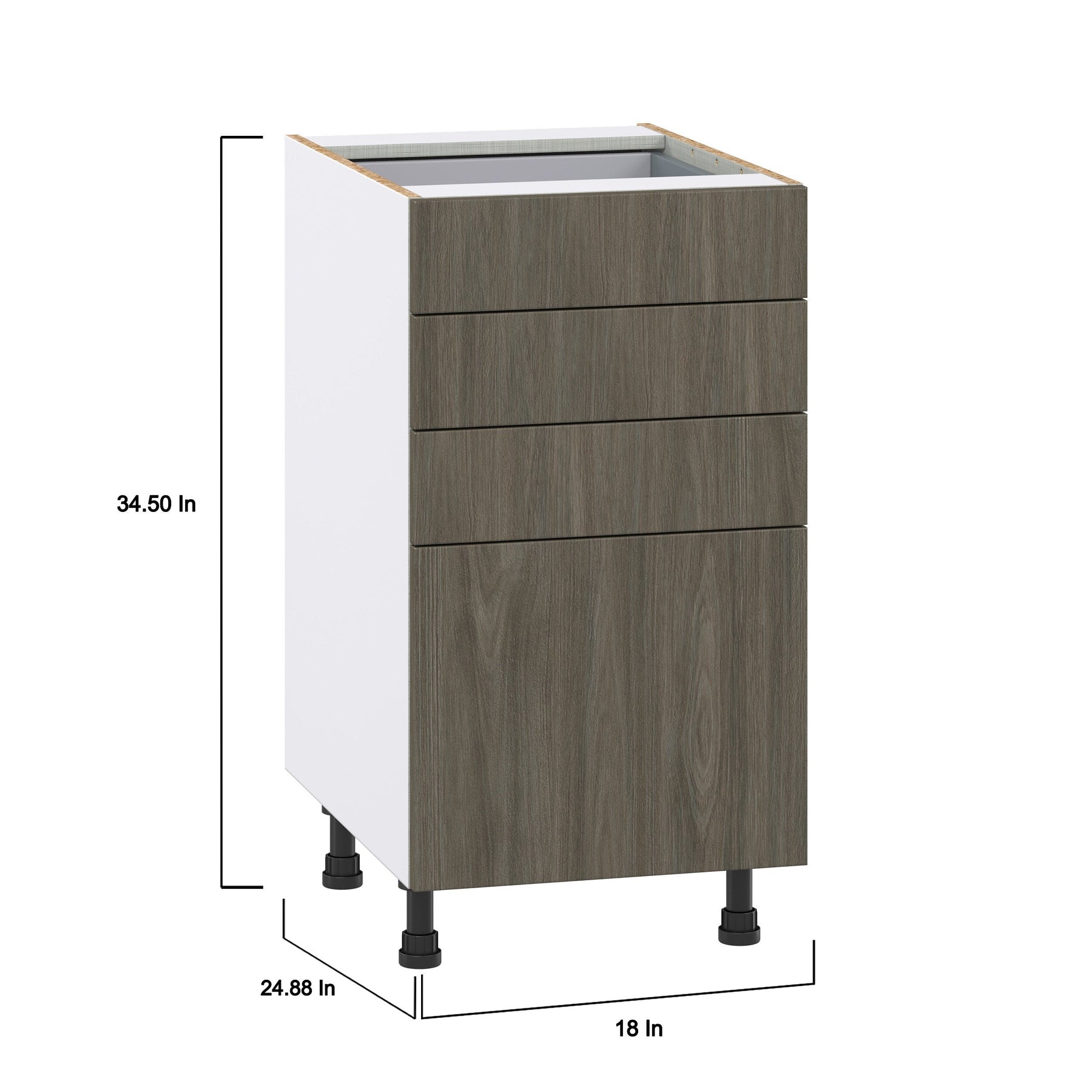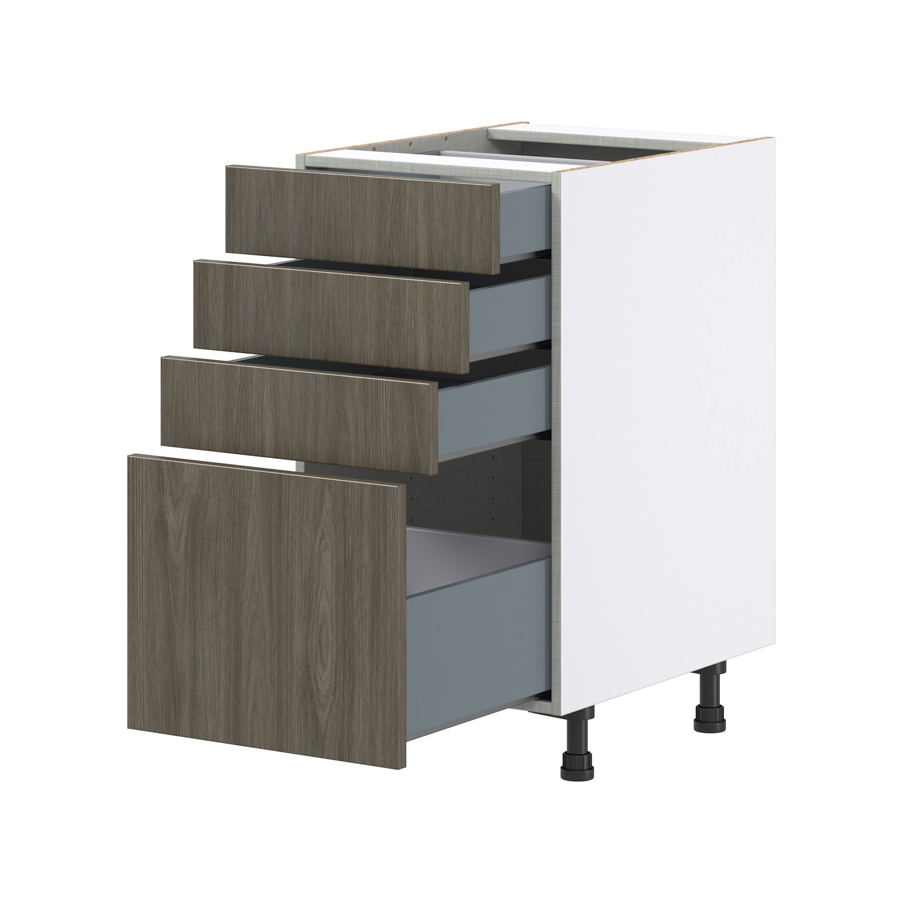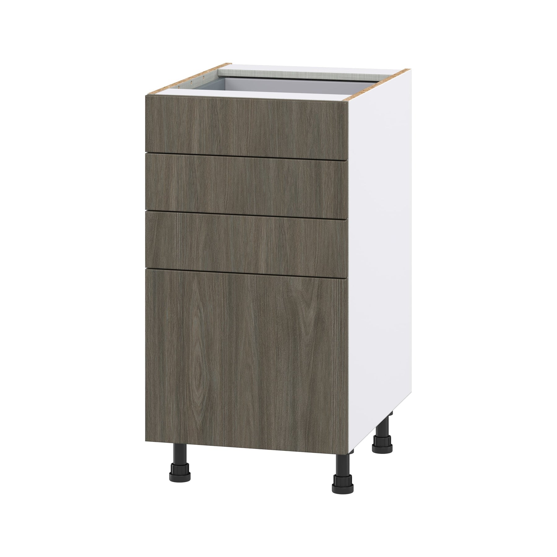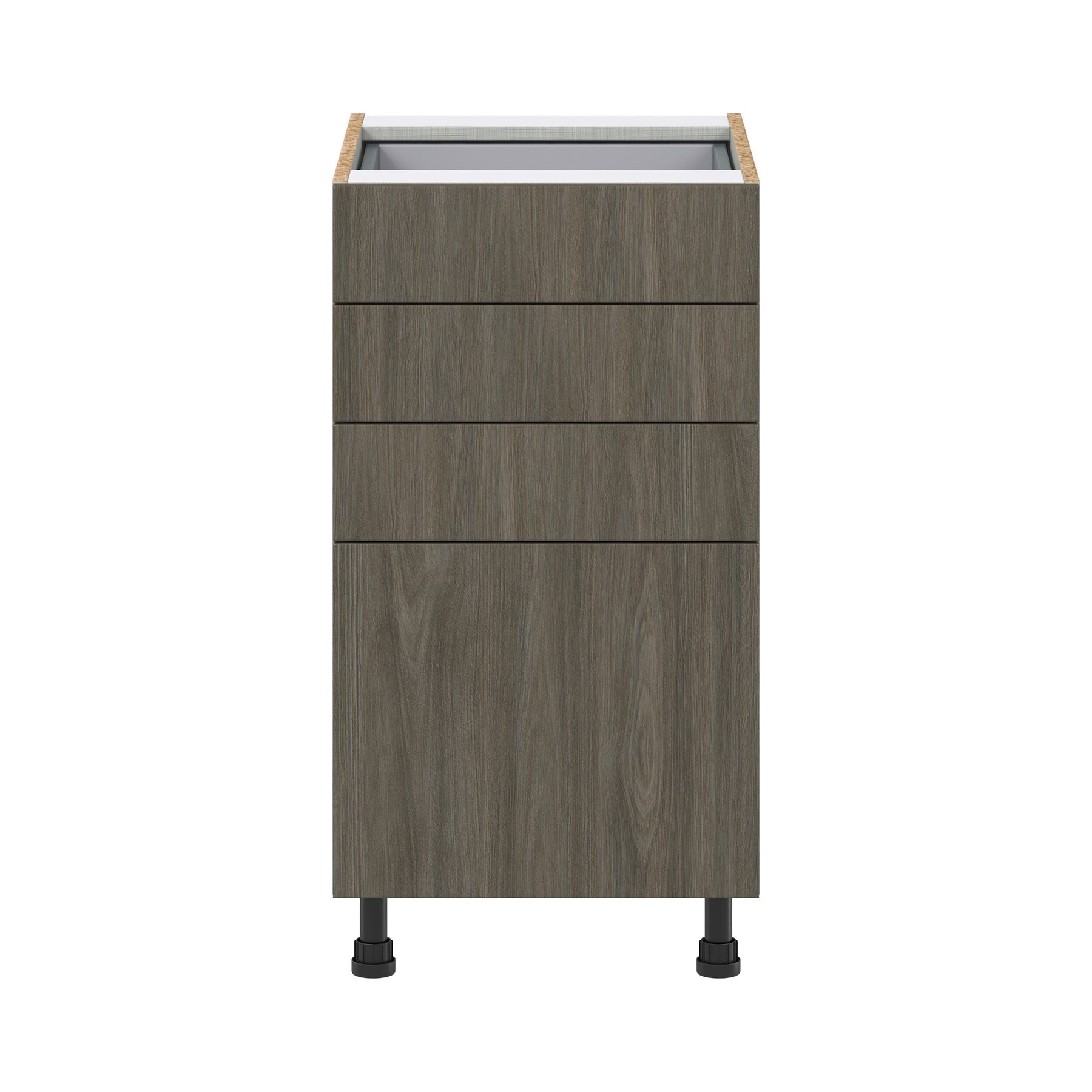 Upgrade your kitchen or workspace with the Hugo&Borg Savane 4-Drawer Base Cabinet, crafted in a sleek flat panel style. Fully assembled and designed for modern durability, it features a scratch and moisture-resistant textured woodgrain melamine finish, exuding the warmth of wood without the upkeep. Enjoy soft-close drawers and 20% more storage capacity, making this cabinet as efficient as it is elegant.