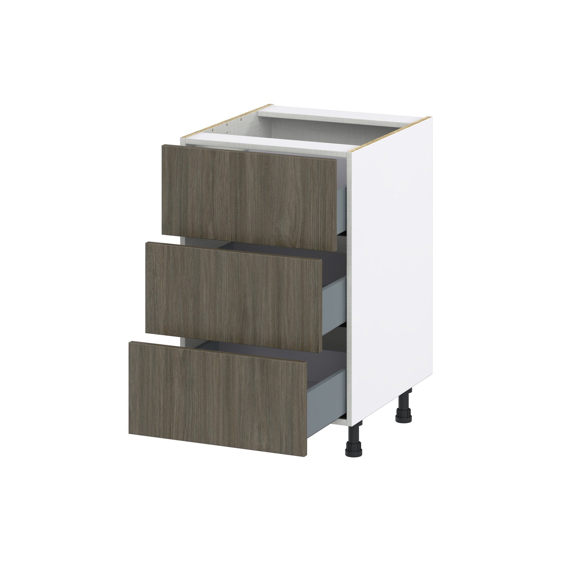 This Hugo&Borg Savane 3-Drawer Base Cabinet is a perfect blend of functionality and elegance, offering a sophisticated flat panel design. Crafted from moisture-resistant engineered wood with a textured woodgrain melamine finish, it provides the warmth of real wood without the upkeep. Full-access European-style construction ensures 20% more storage and impeccable durability.