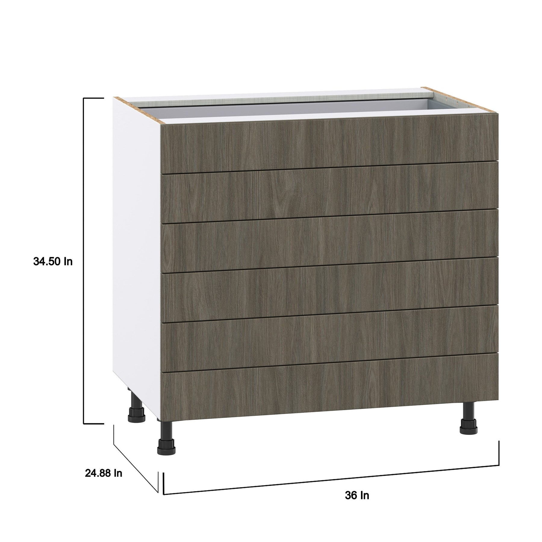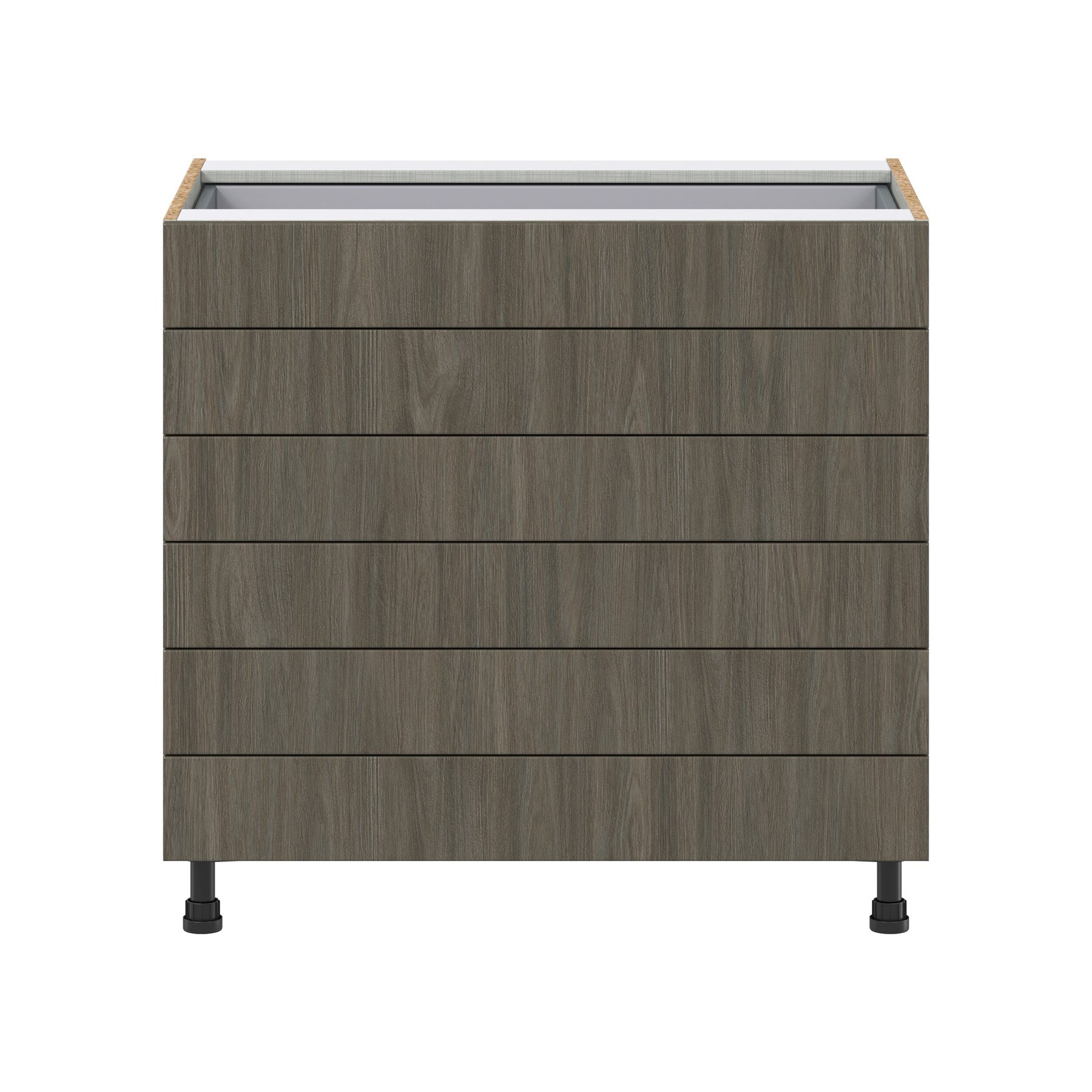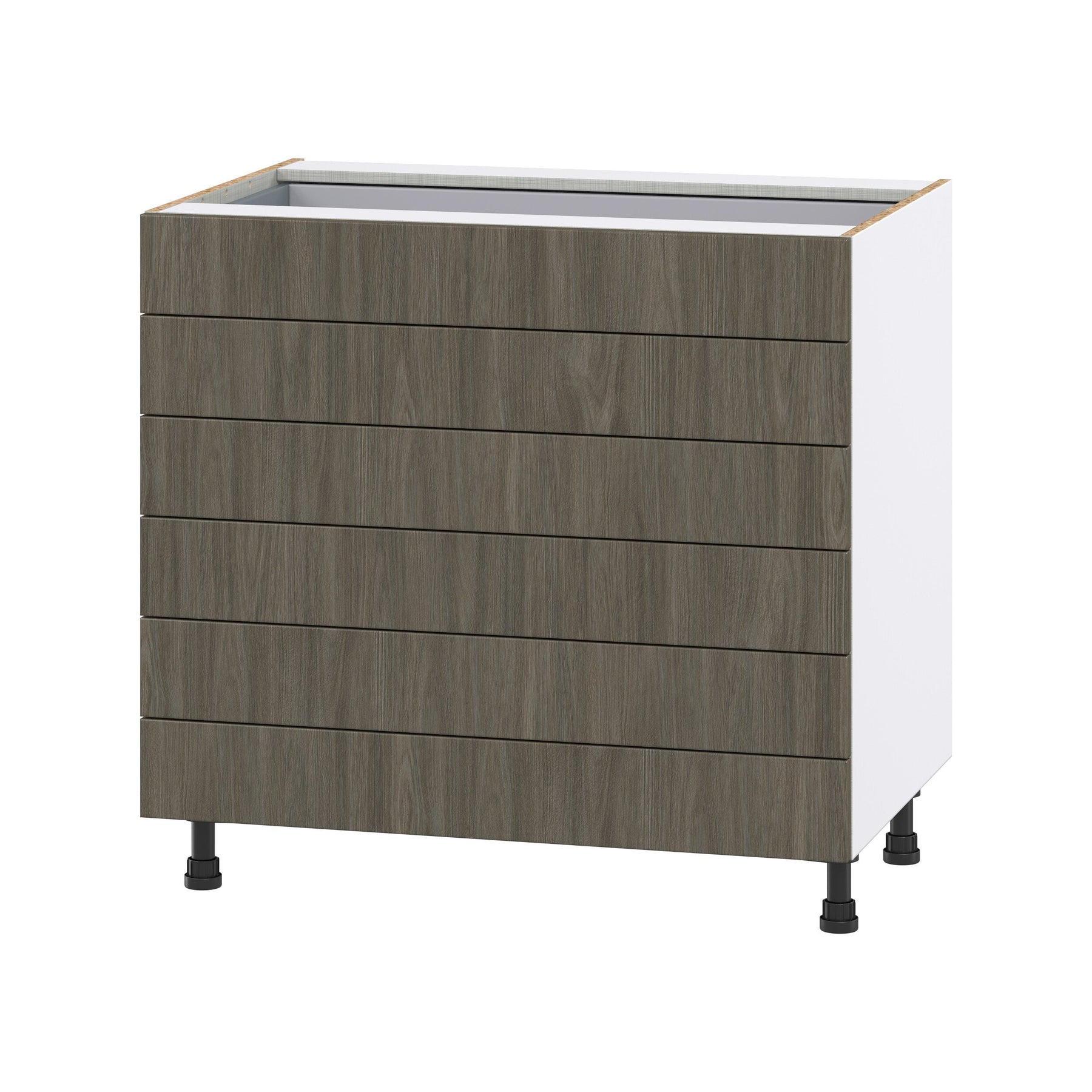 The Hugo&Borg Savane 36" Textmel 6-Drawer Base Cabinet combines modern style with premium construction to maximize your storage solutions. Fully assembled and ready to install, this cabinet features a beautiful textured woodgrain finish and soft-close drawers.
