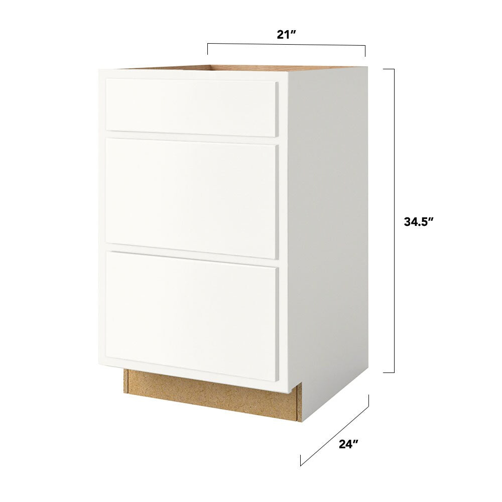 Discover the Shenandoah Breckenridge 3-Drawer Base Cabinet, expertly crafted with all-plywood construction for enhanced durability. This fully assembled 21-inch wide cabinet in a clean linen finish offers practical storage with its soft-close, dovetail drawers, seamlessly fitting modern and traditional decor.