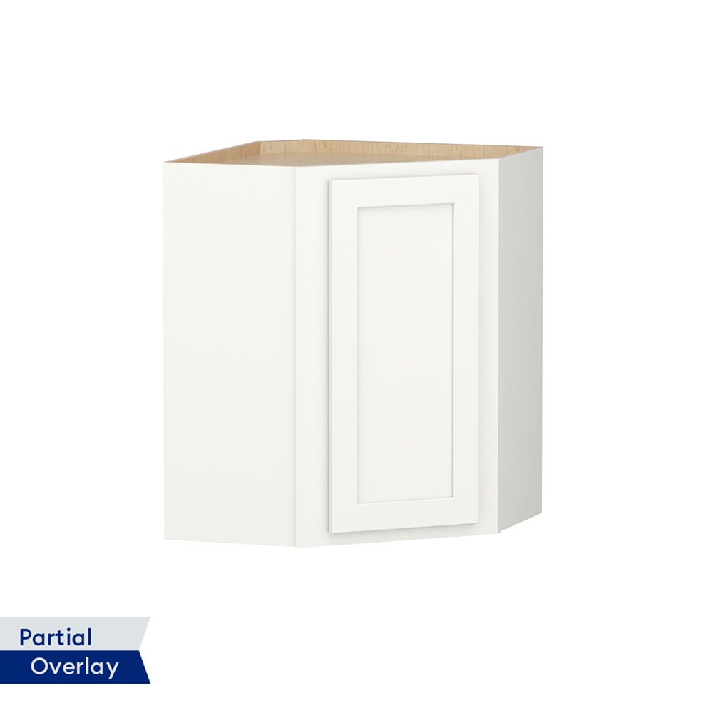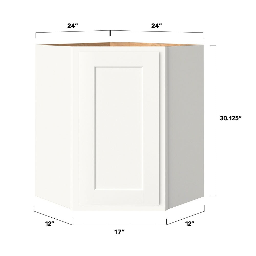 The Breckenridge Diagonal Corner Wall Cabinet offers exquisite craftsmanship with its recessed Shaker style and fully assembled design. Made from durable plywood with a pristine painted finish, this cabinet fits effortlessly into a modern or traditional kitchen, maximizing storage and enhancing aesthetics with its soft-close functionality.
