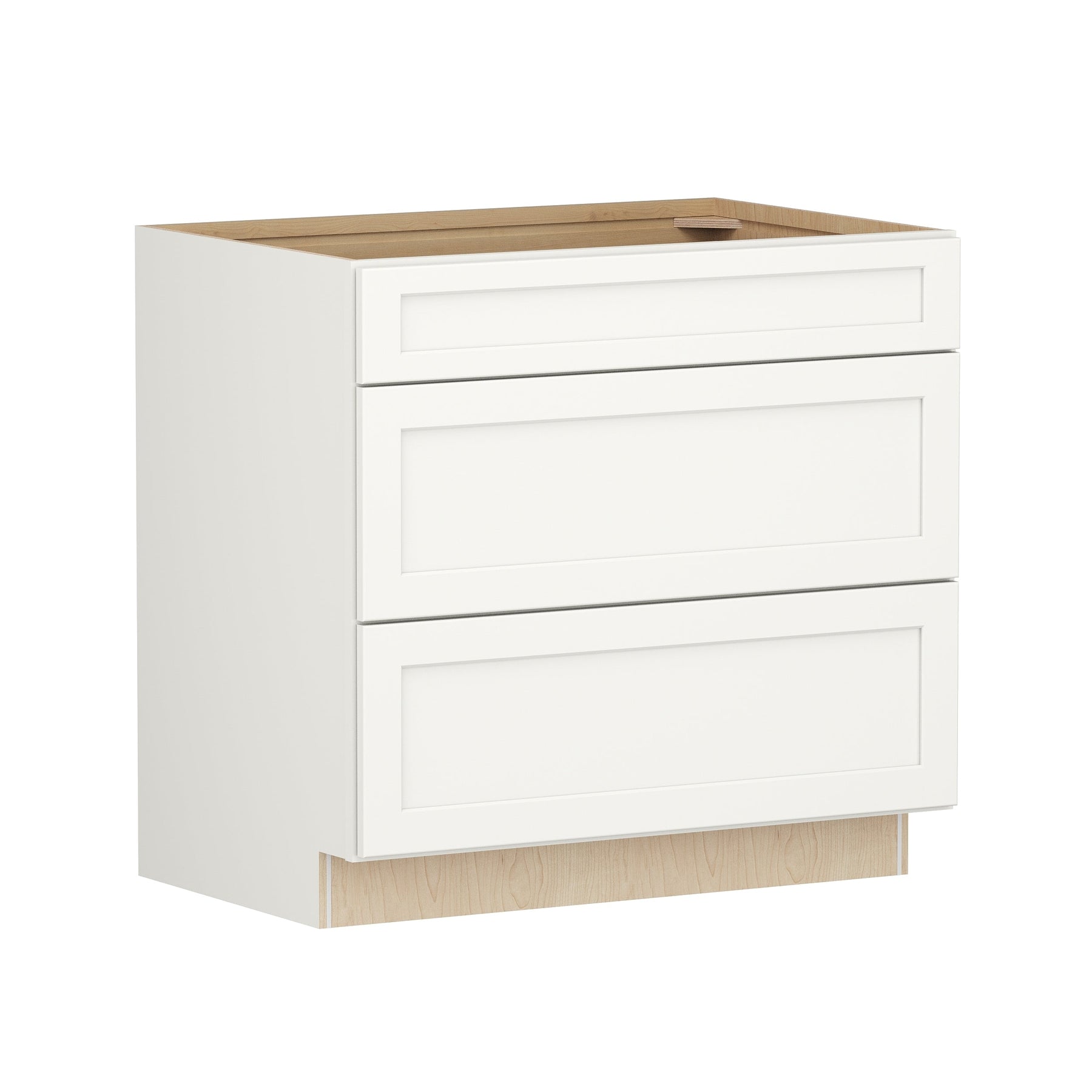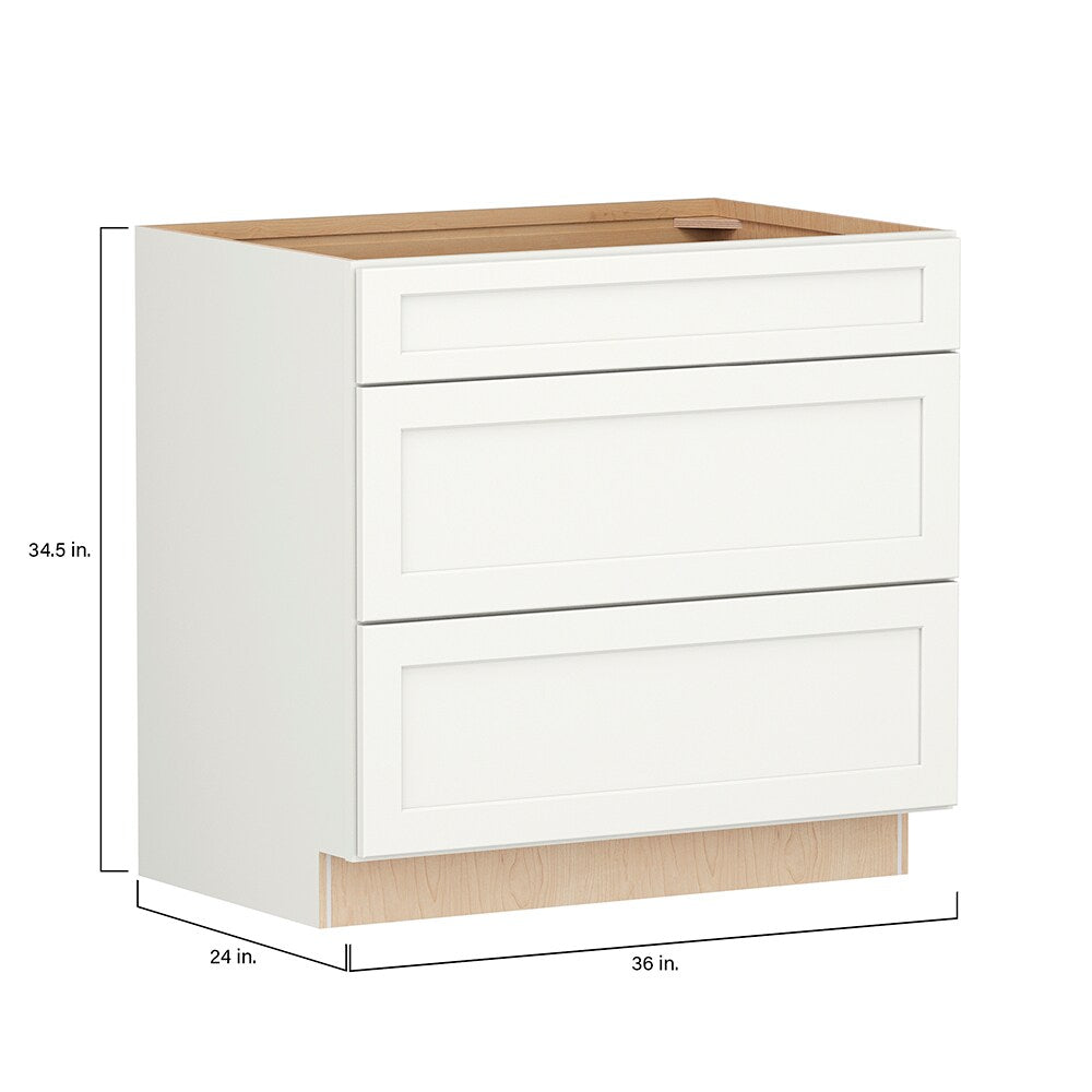 The Shenandoah PRO Express Breckenridge 3-Drawer Base Cabinet combines the timeless elegance of Shaker styling with durable plywood construction to deliver exceptional storage for any home. Designed in a soothing linen white finish, this fully assembled cabinet ensures hassle-free installation while offering robust functionality. Enjoy the benefits of soft-close drawers and superior craftsmanship, ideal for modern and transitional decor.