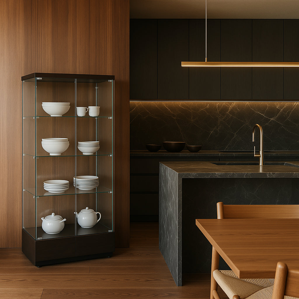 This display cabinet is a masterpiece of modern design, blending tempered glass with a sleek wooden base to create a stunning focal point. Its frameless transparency showcases your treasures beautifully, while the safety features ensure peace of mind. Style it in a living room or office to add sophistication and functionality, making it an essential piece for contemporary living.