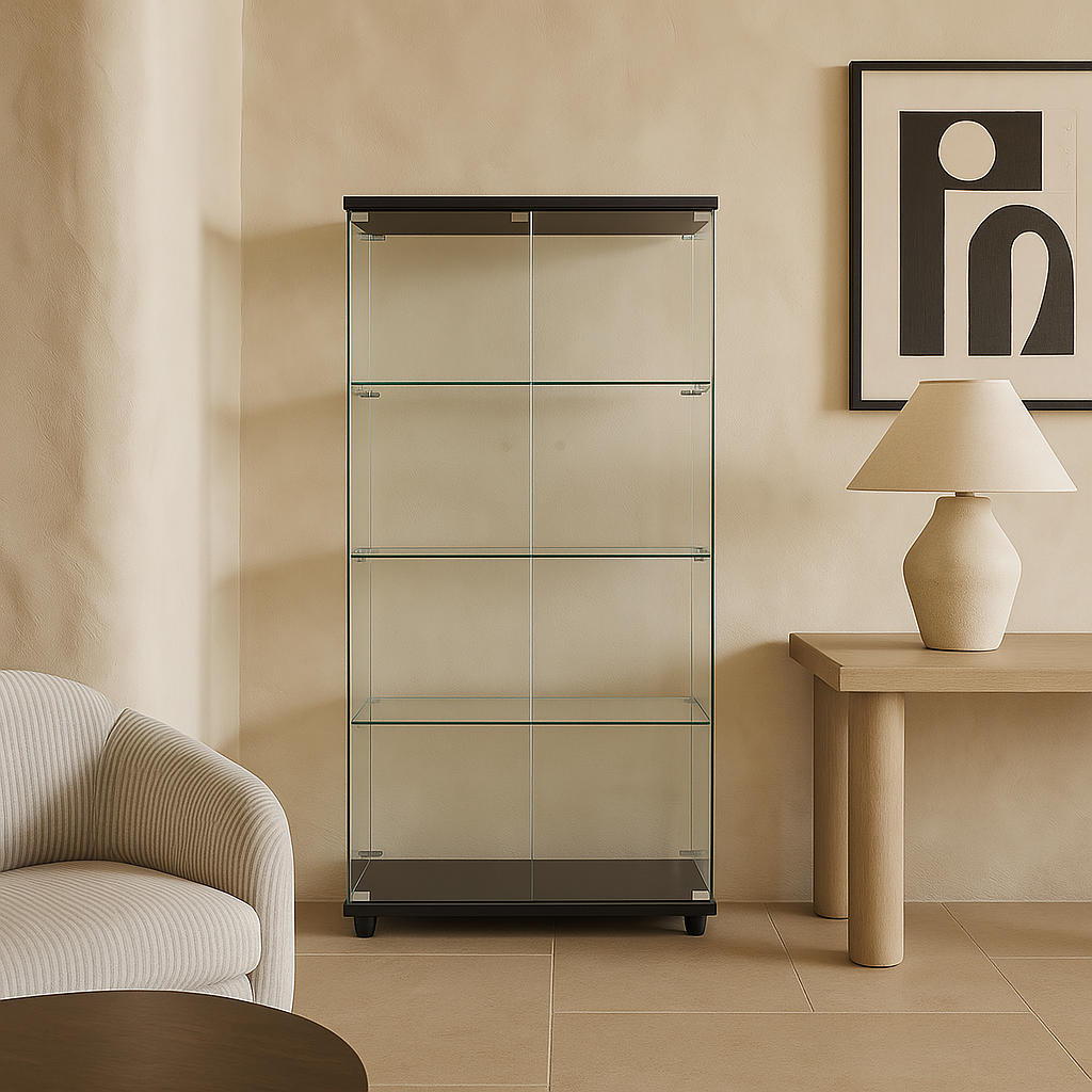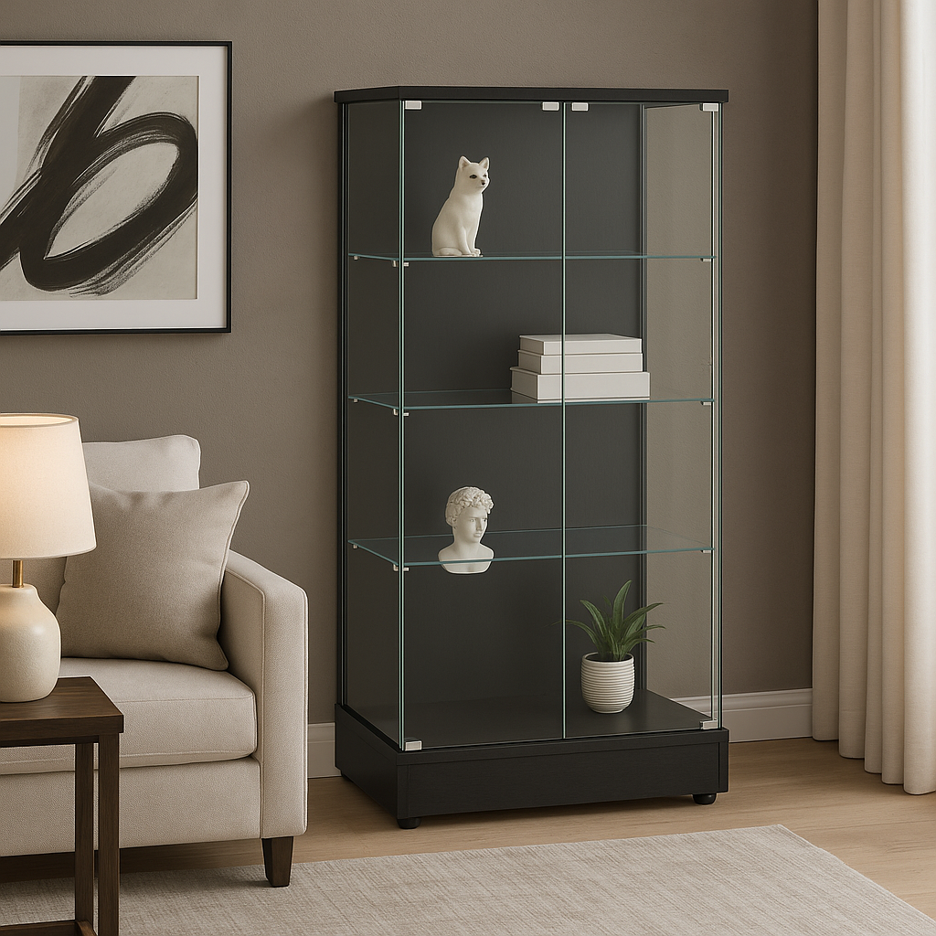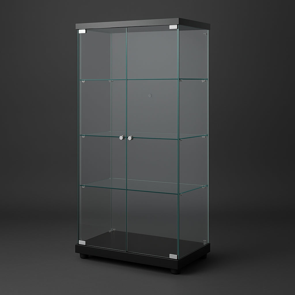 FUNKOL 4-Shelf Wooden Base Display Cabinet with Glass Doors, Black