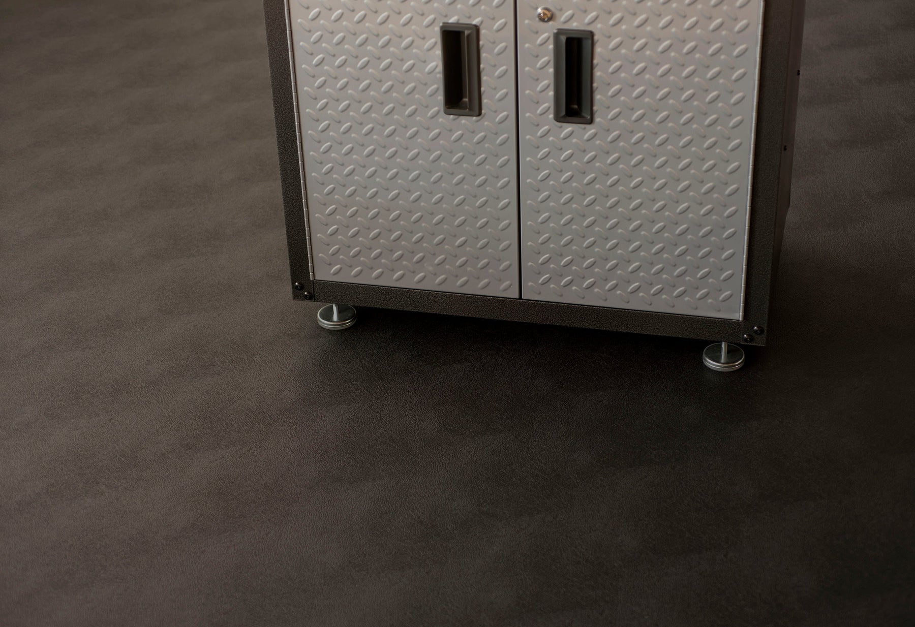 Durable, waterproof PVC garage floor roll with Levant leather-like texture for traction and style. Sized 5 ft x 10 ft at 55 mil thickness, it resists stains, scratches, and common chemicals for long-lasting protection in garages, workshops, gyms, and basements.