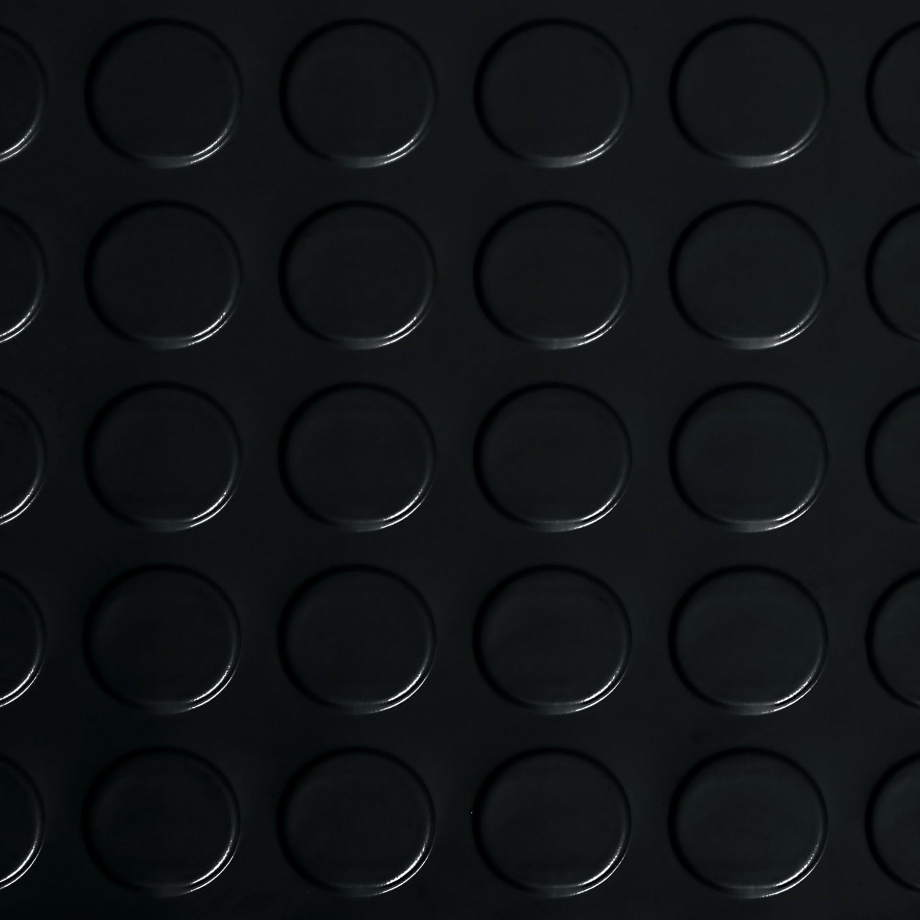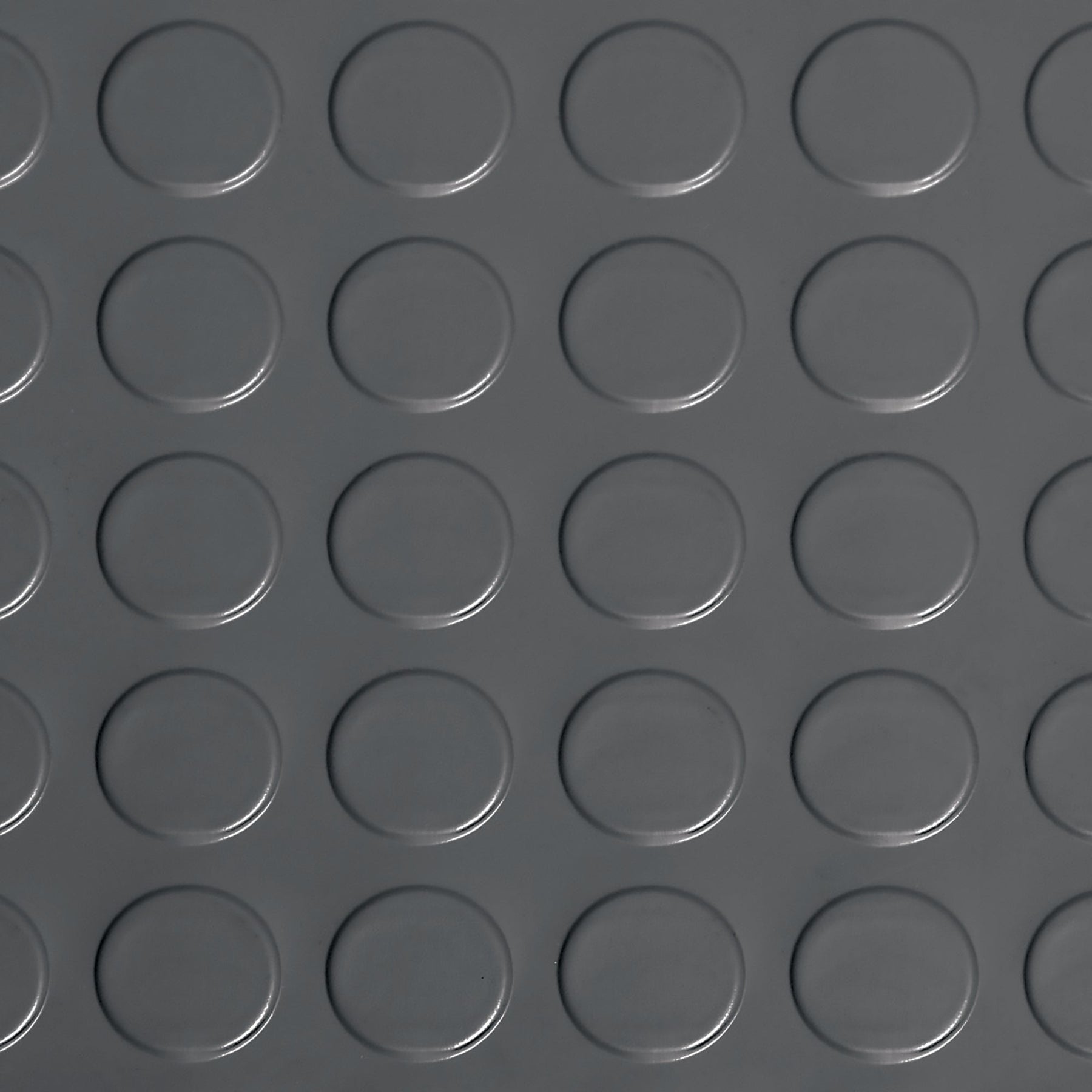 Roll-out vinyl garage flooring designed to protect concrete and add traction. Made of 100% solid polyvinyl with a low-profile raised coin texture for easy cleaning and slip resistance.